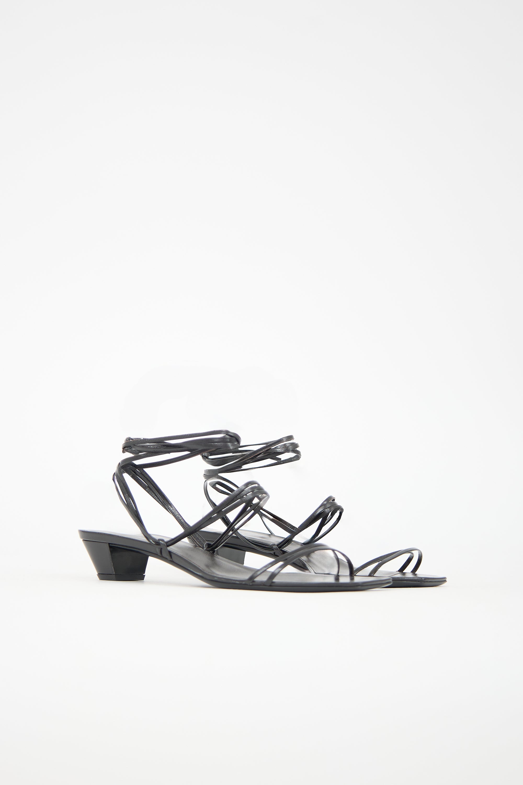 Pre-owned The Row chocolate brown leather Graphic Strap sandals featuring squared toe, thin strappy upper, wraparound ankle tie straps, and covered kitten heel. Comes with original box.