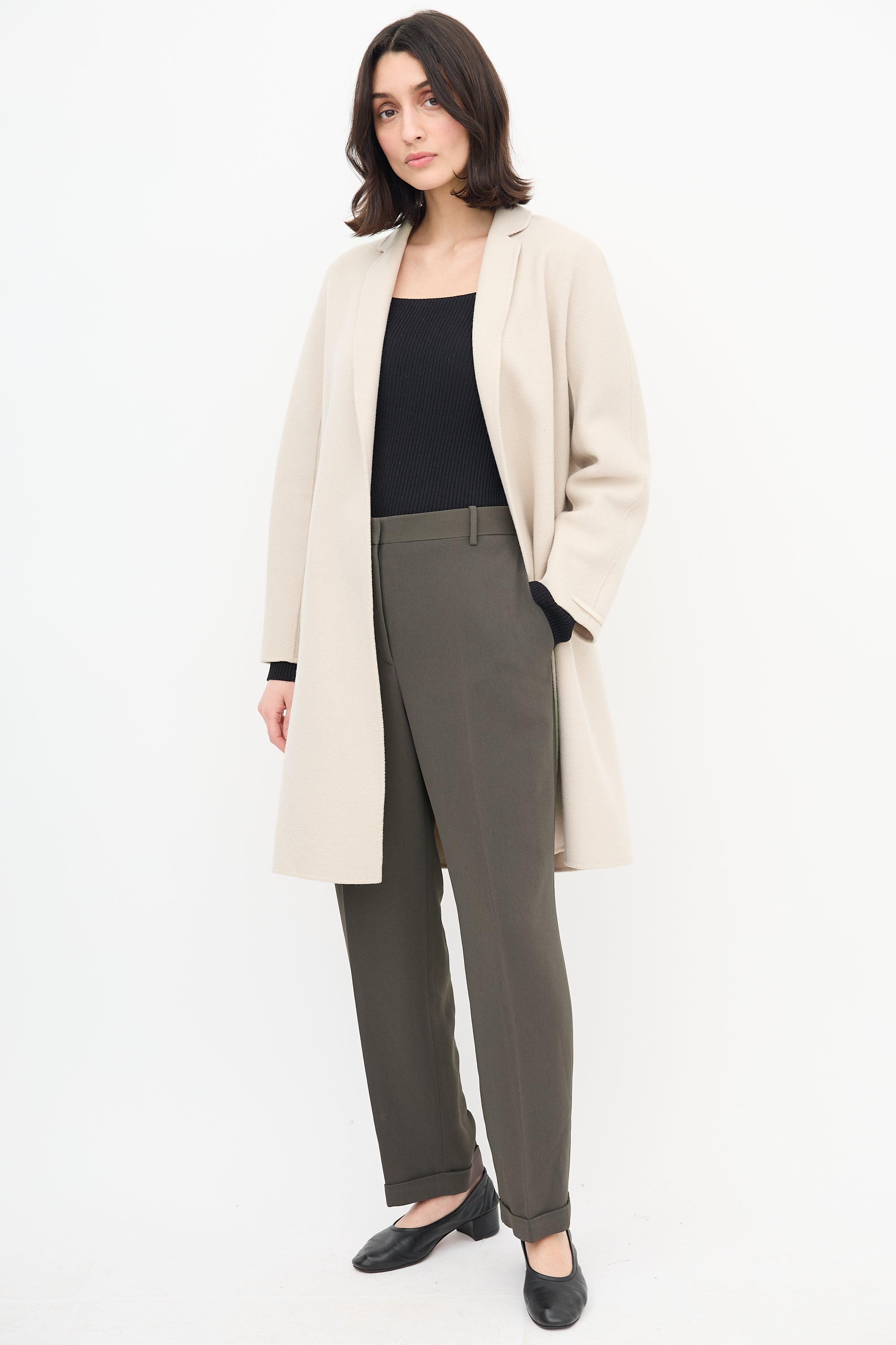 Pre-owned The Row green straight leg trousers featuring a zip fly with hook and button fastenings, belt loops, pressed seams, two slip pockets at sides, and a cuffed hem.