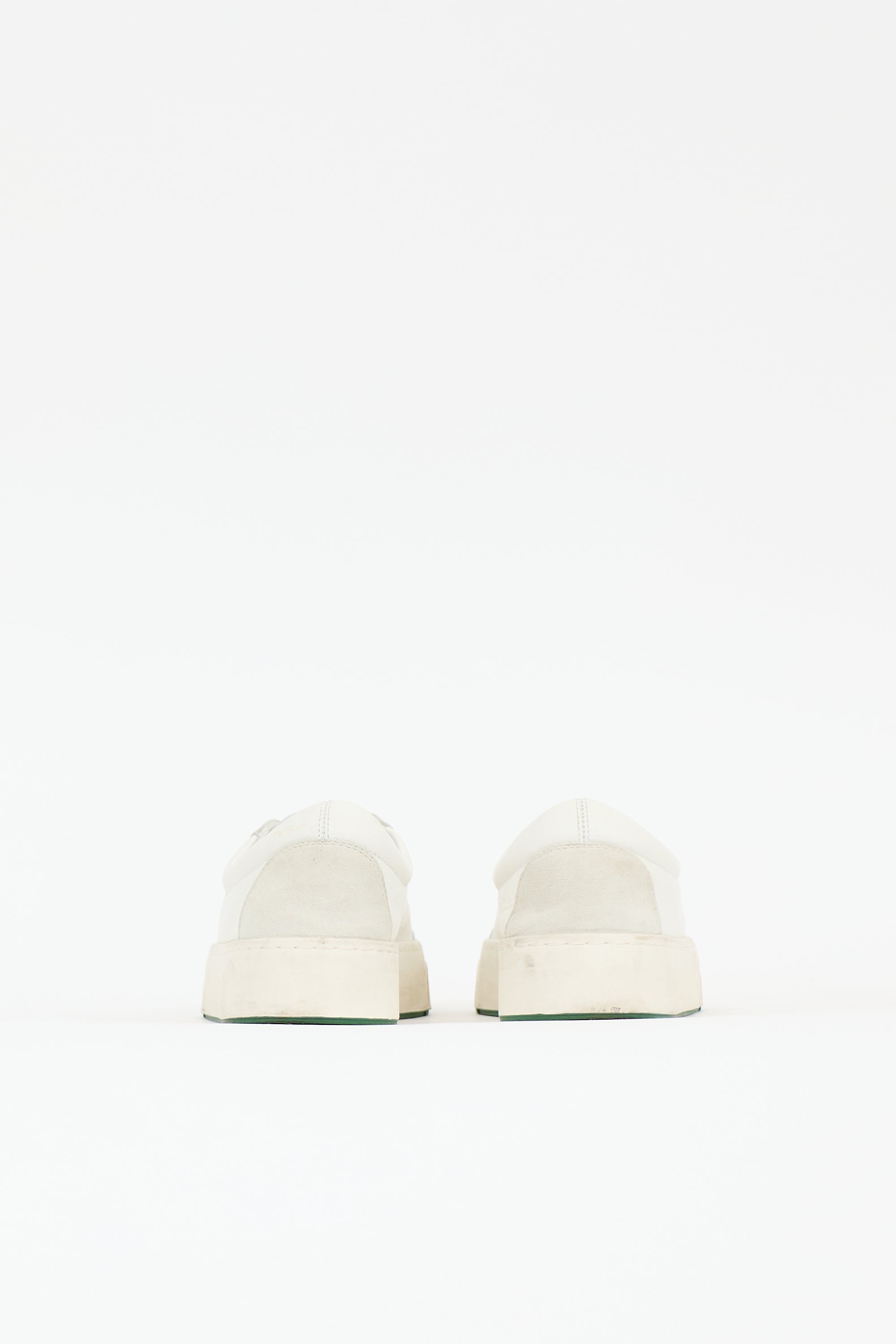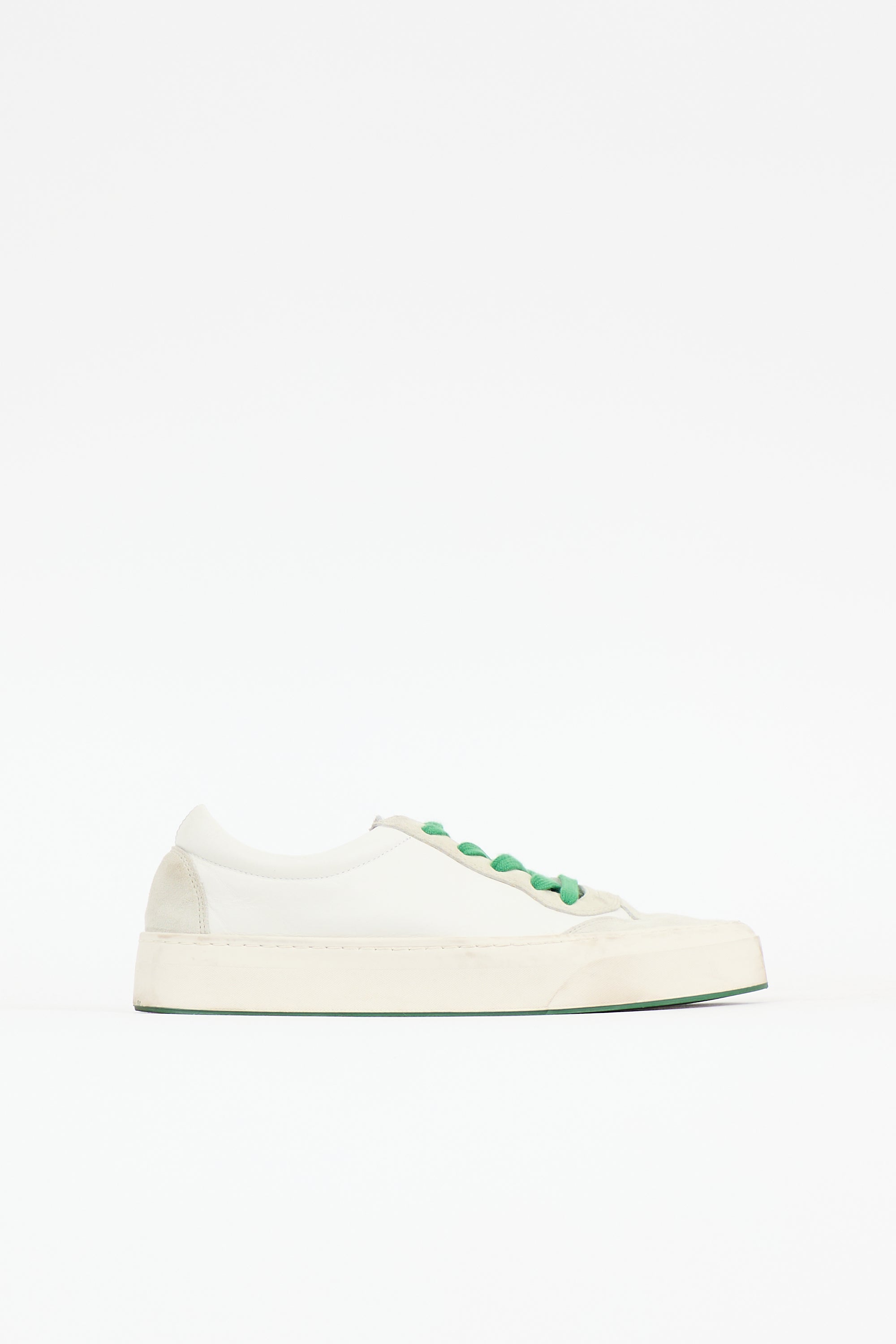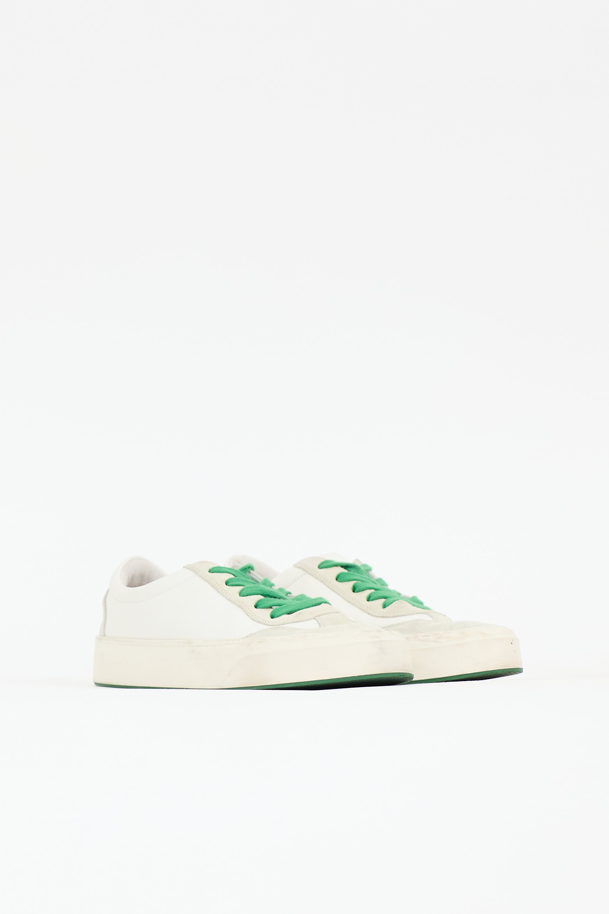 Pre-owned The Row white leather and grey suede Marley sneakers featuring rounded toe, green lace up front, suede panelling, and rubber outsole.