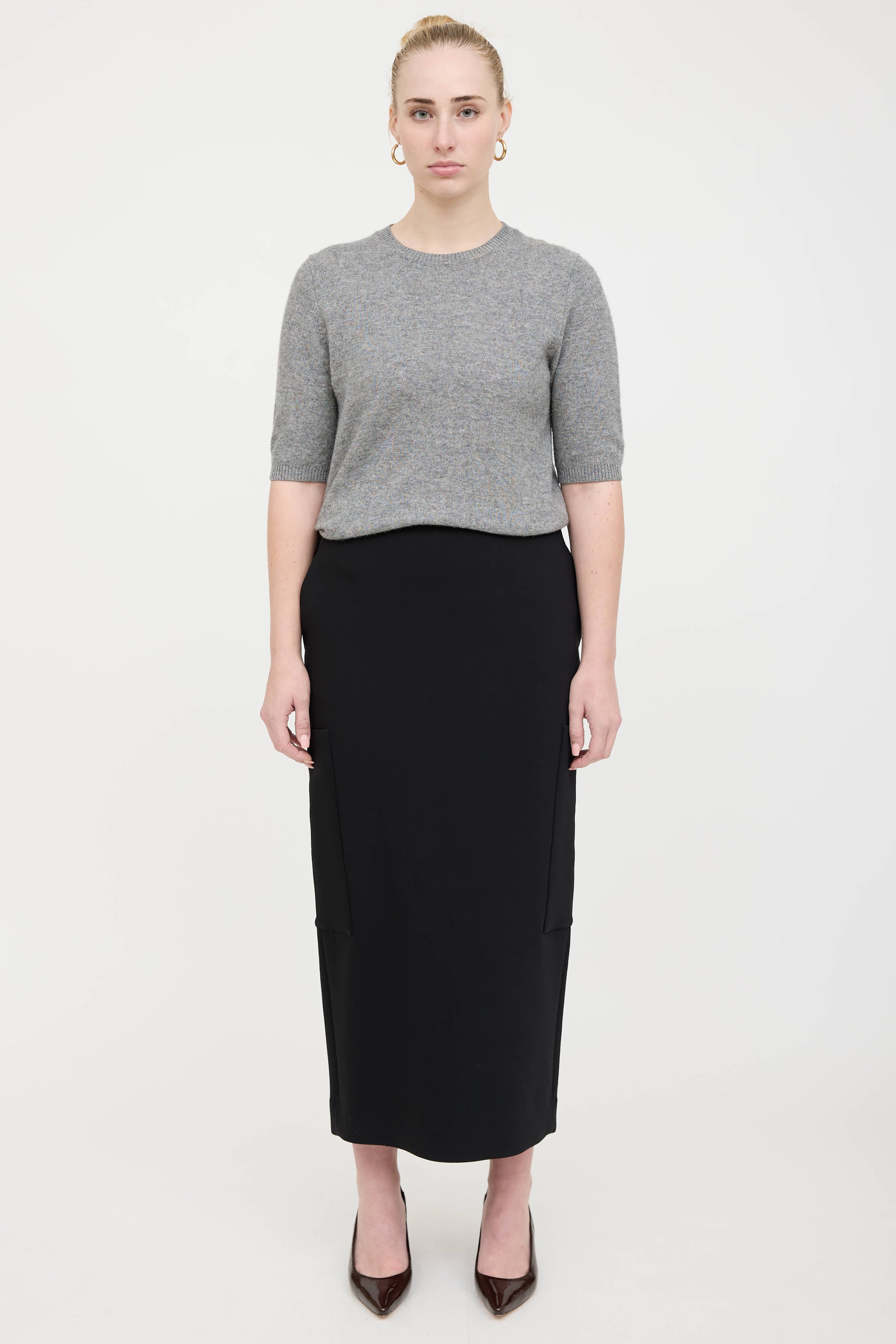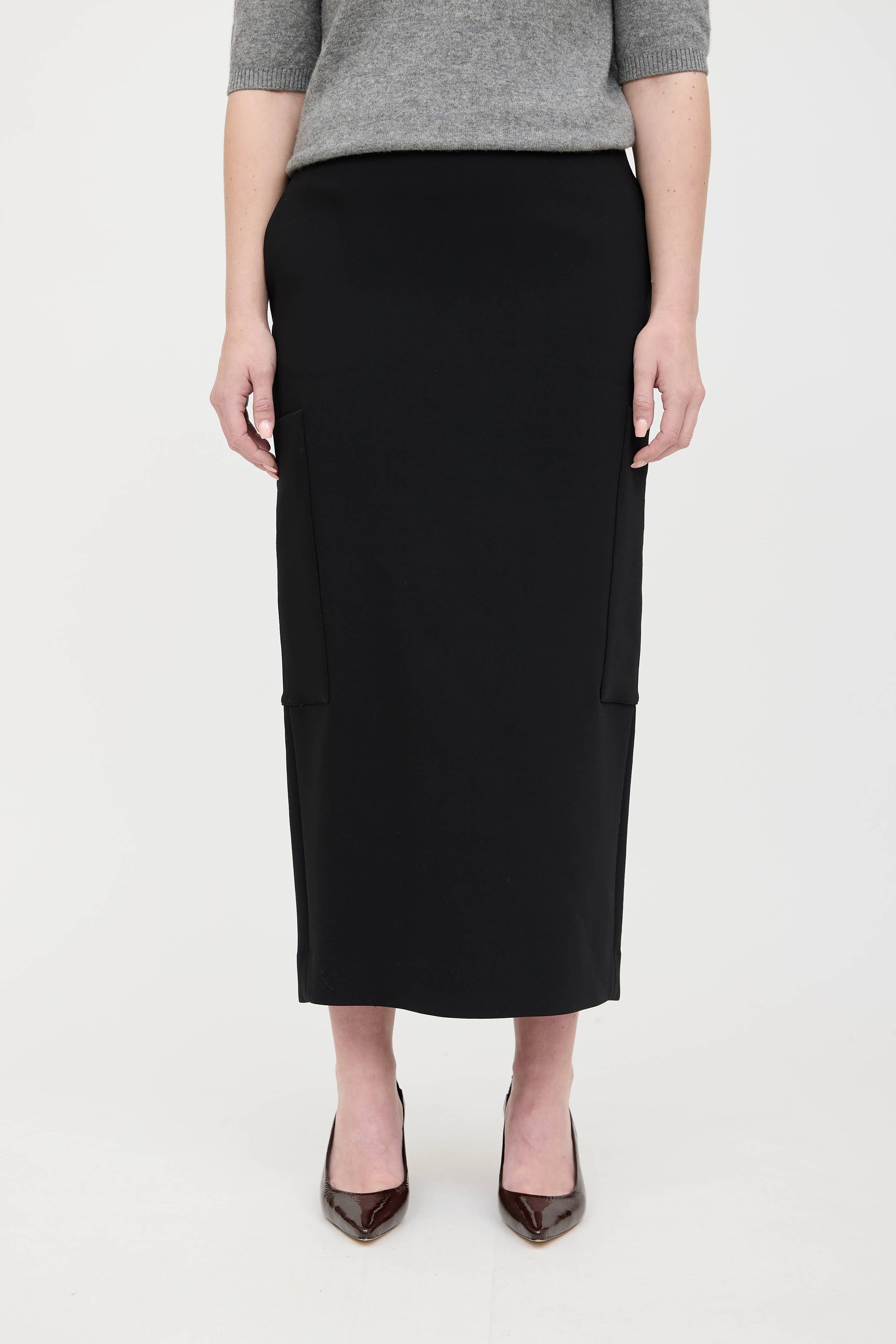 Pre-owned The Row black wool skirt featuring concealed zip at side, two pockets at side, and slit at back hem. Lined.