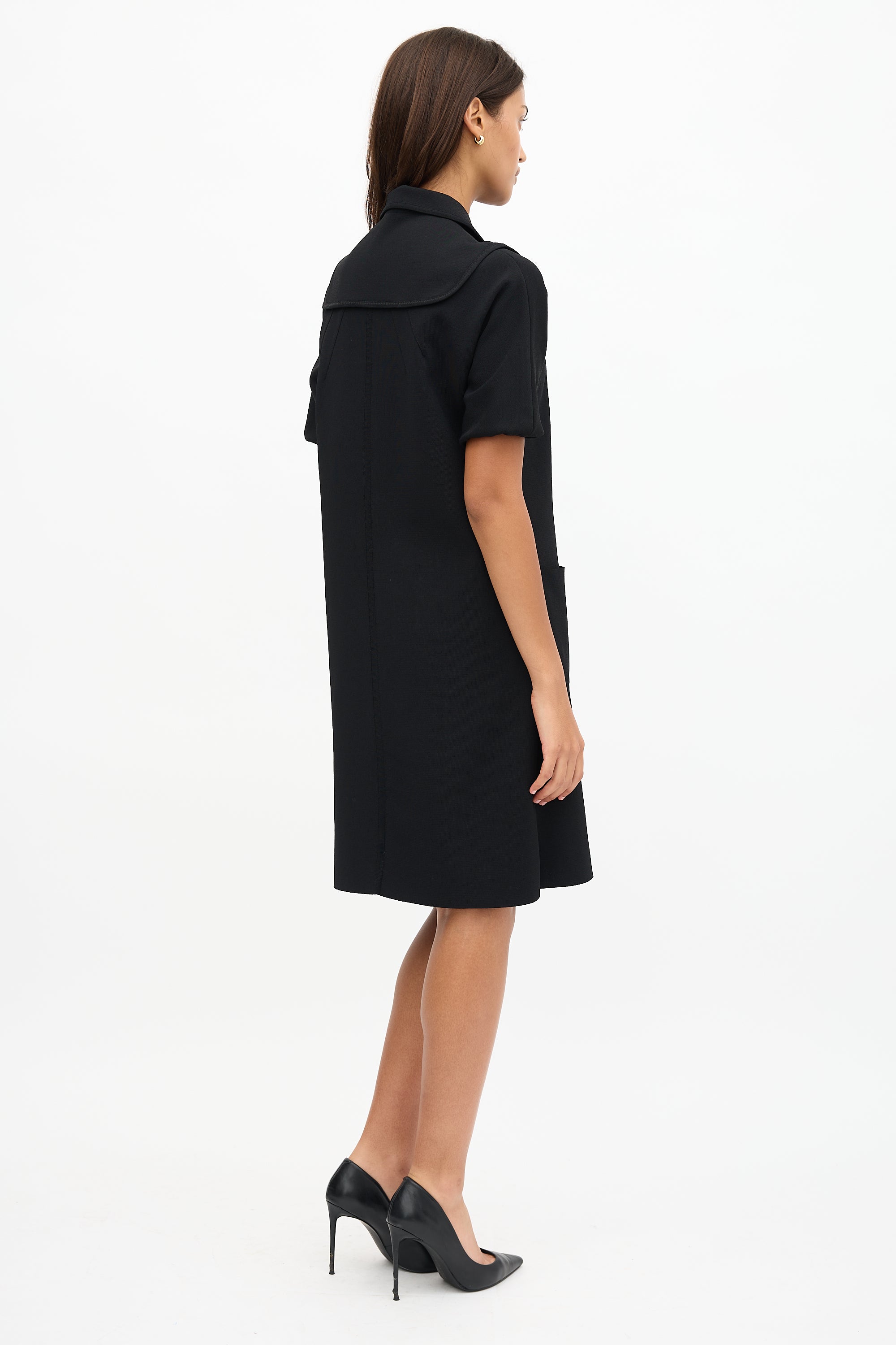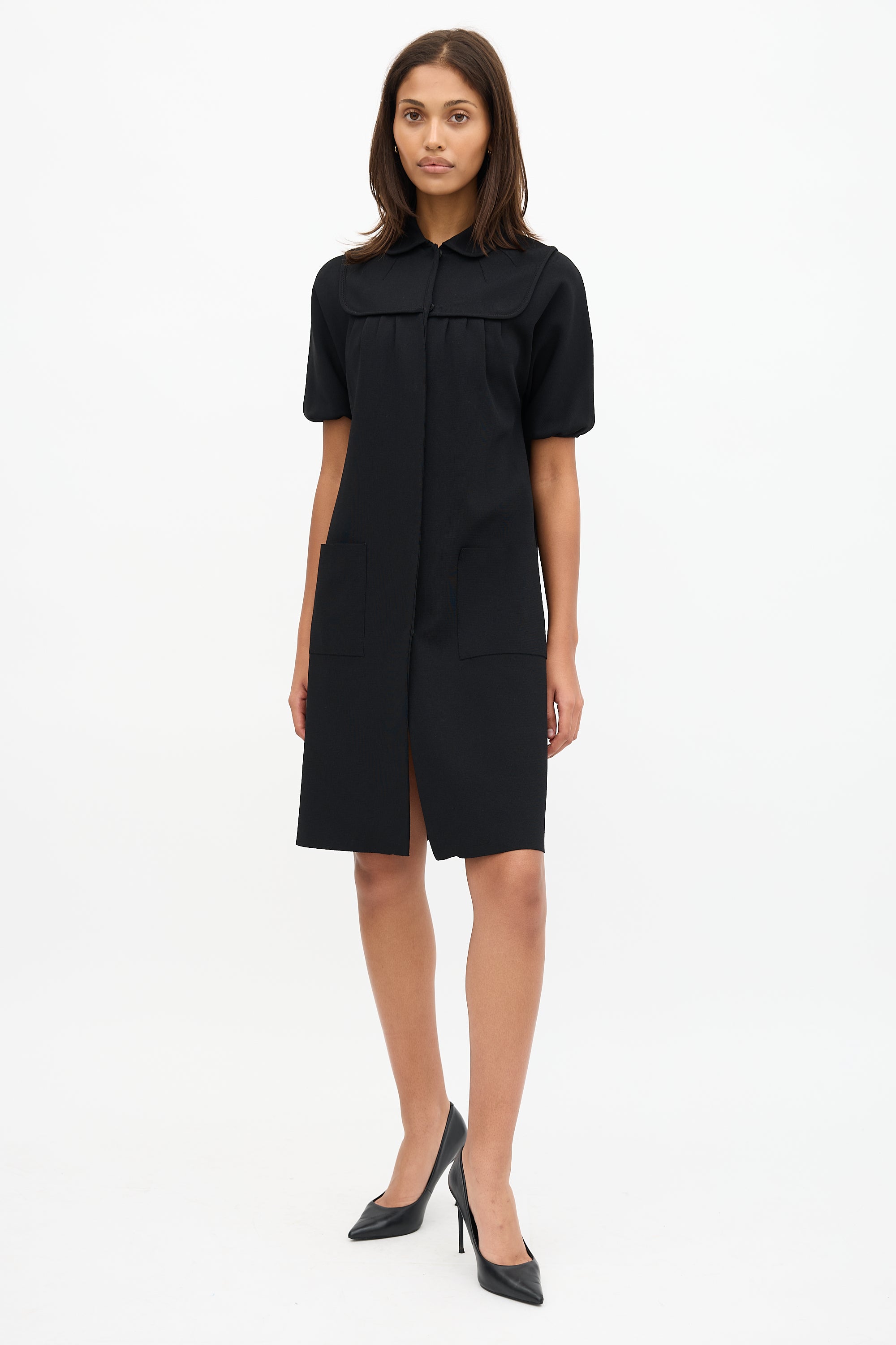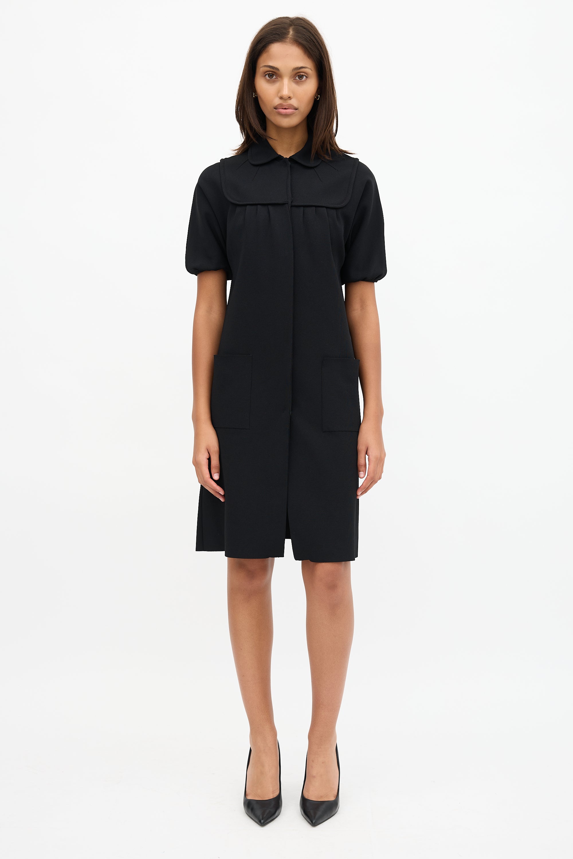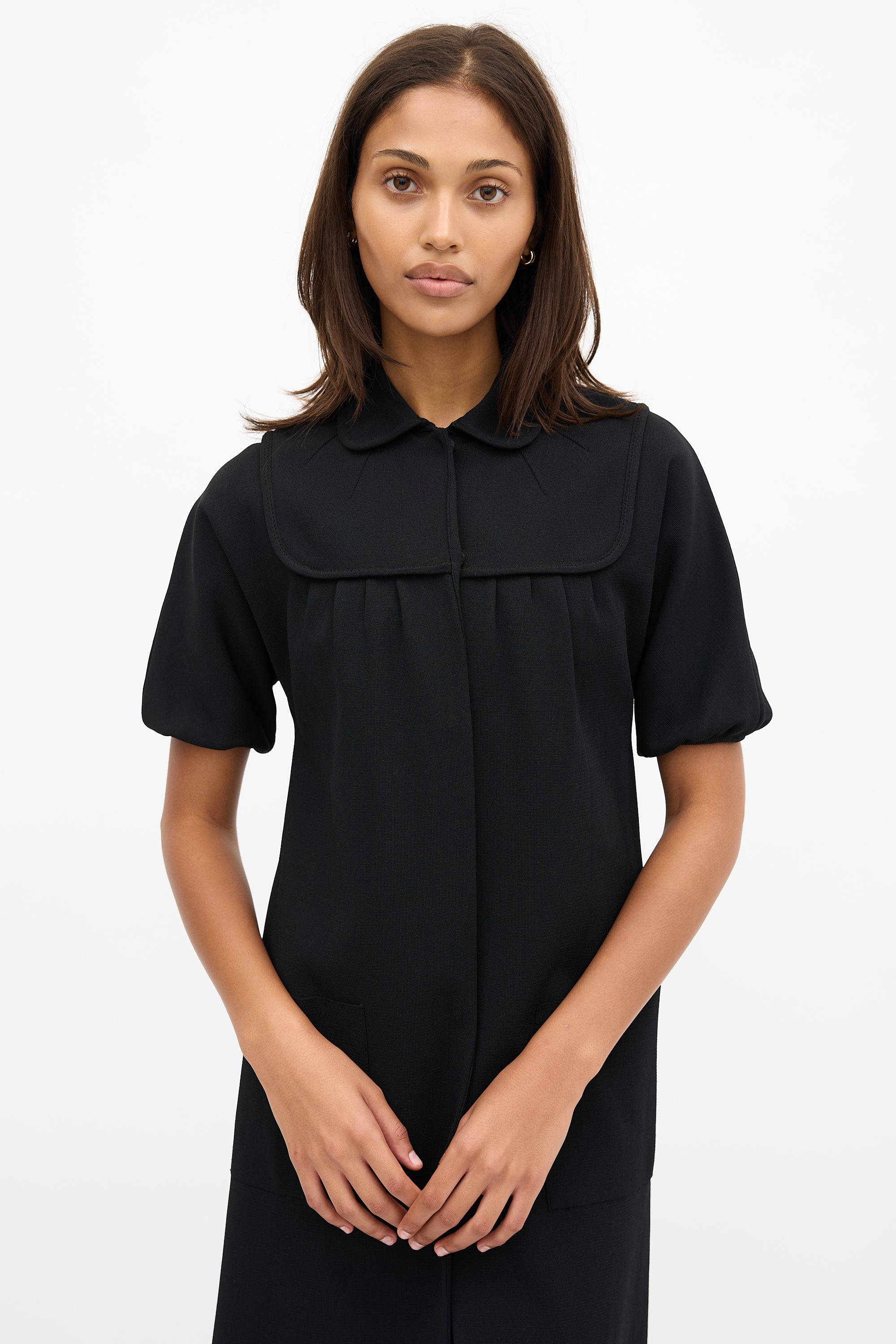Pre-owned Prada black heavy weight knit jersey midi dress featuring Peter Pan collar, yoke panel with front gathers, snap button up front, two front patch pockets, and puff sleeves.