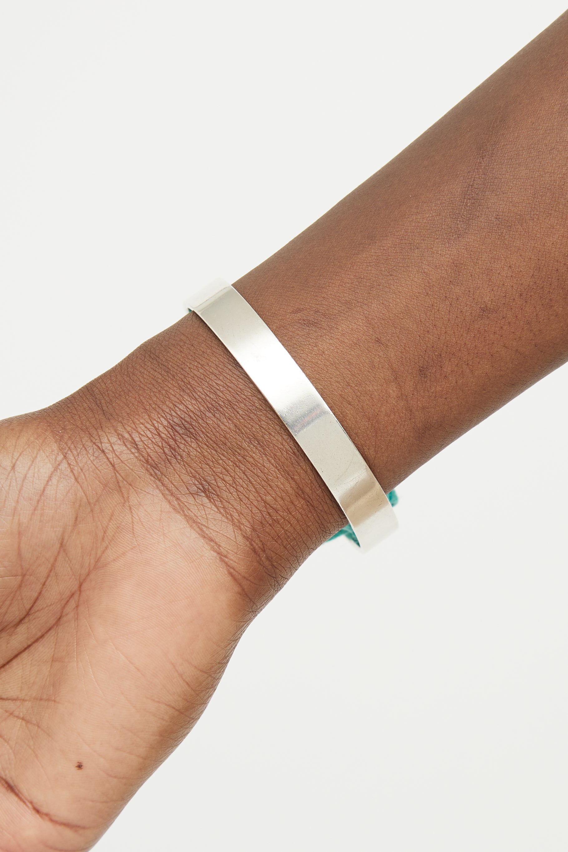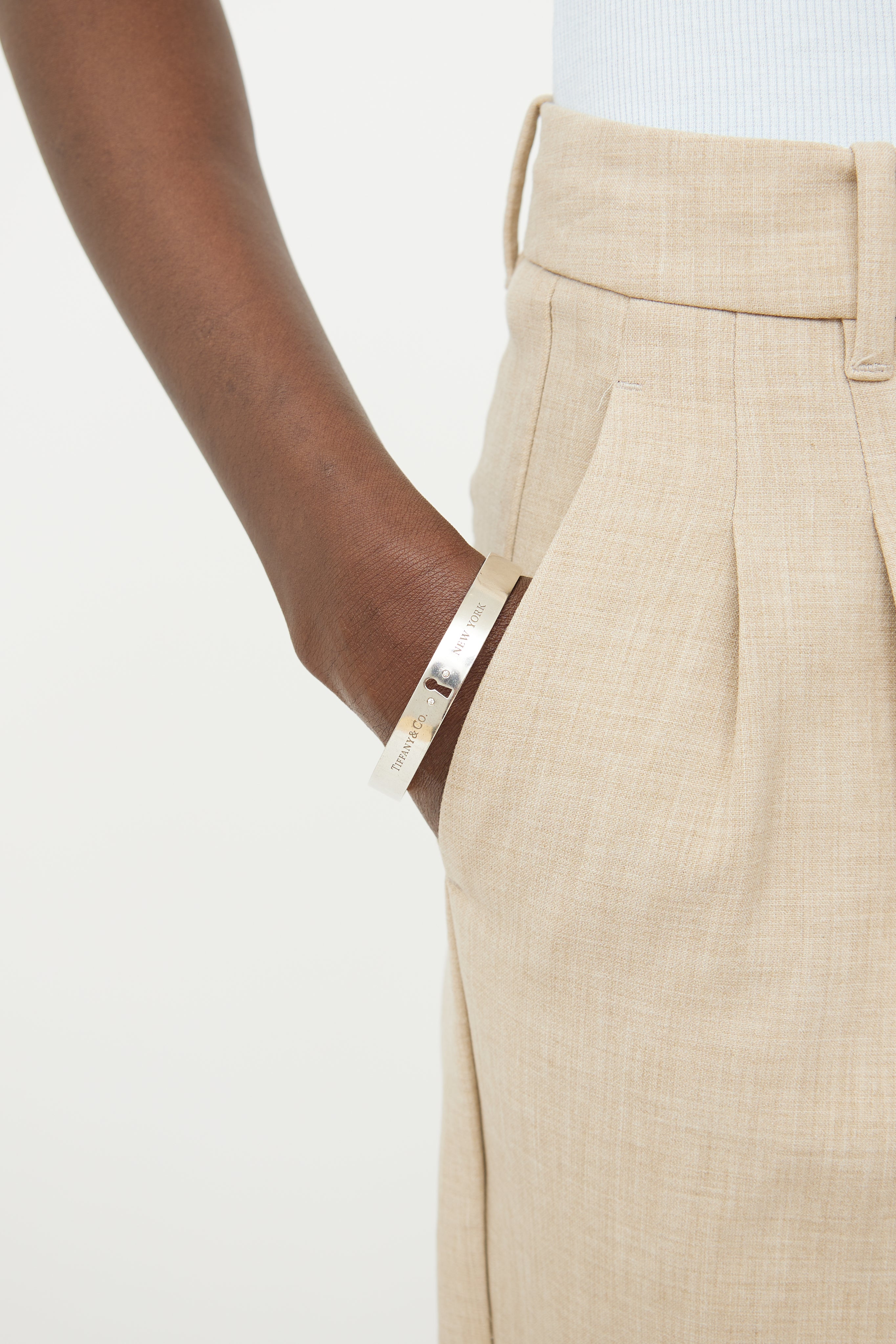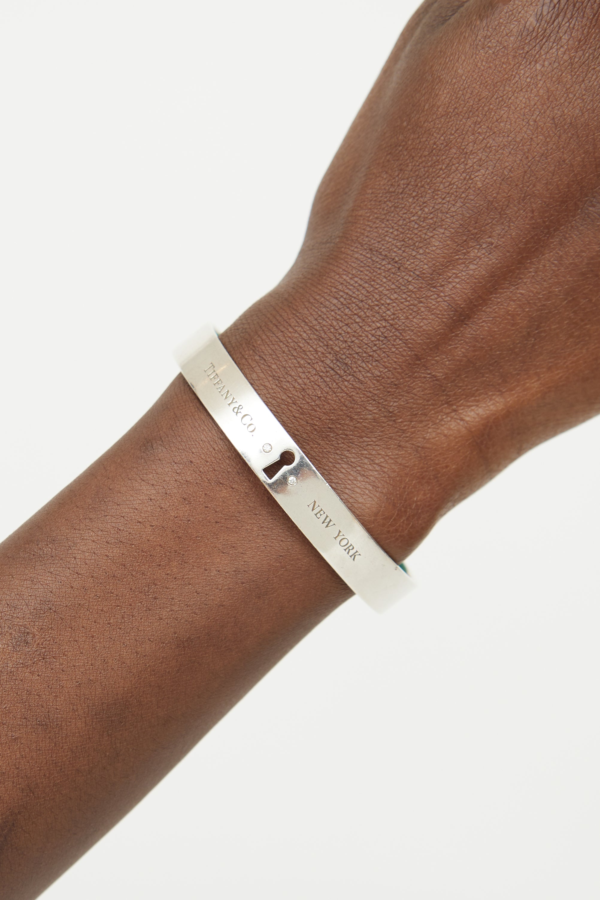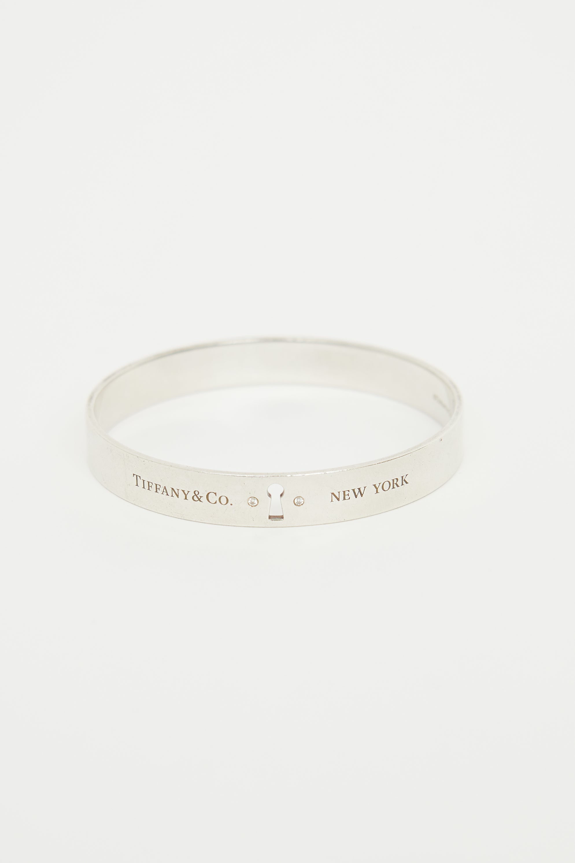 Pre-owned Tiffany & Co. sterling silver Diamonds Lock bangle featuring round brilliant diamonds, keyhole, and logo text stamp. "925" "Best Wishes" stamped on inside.