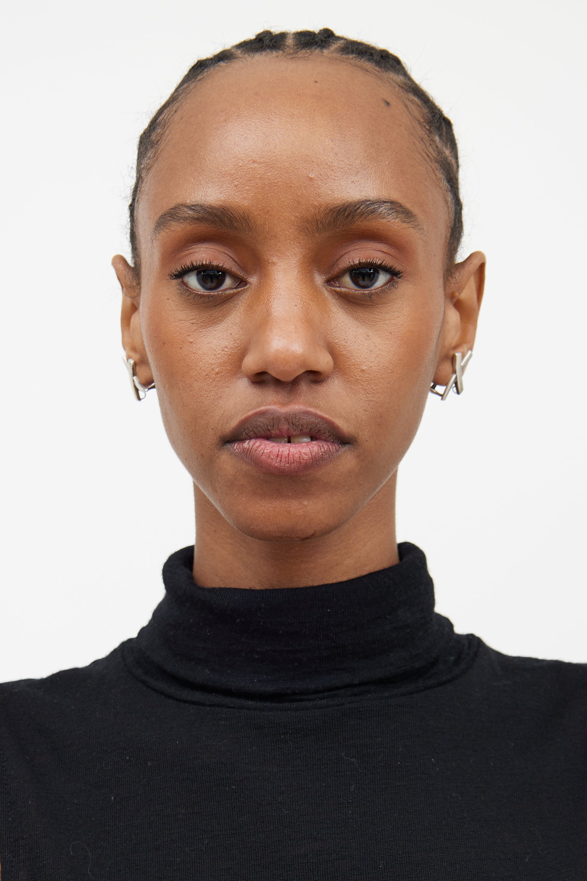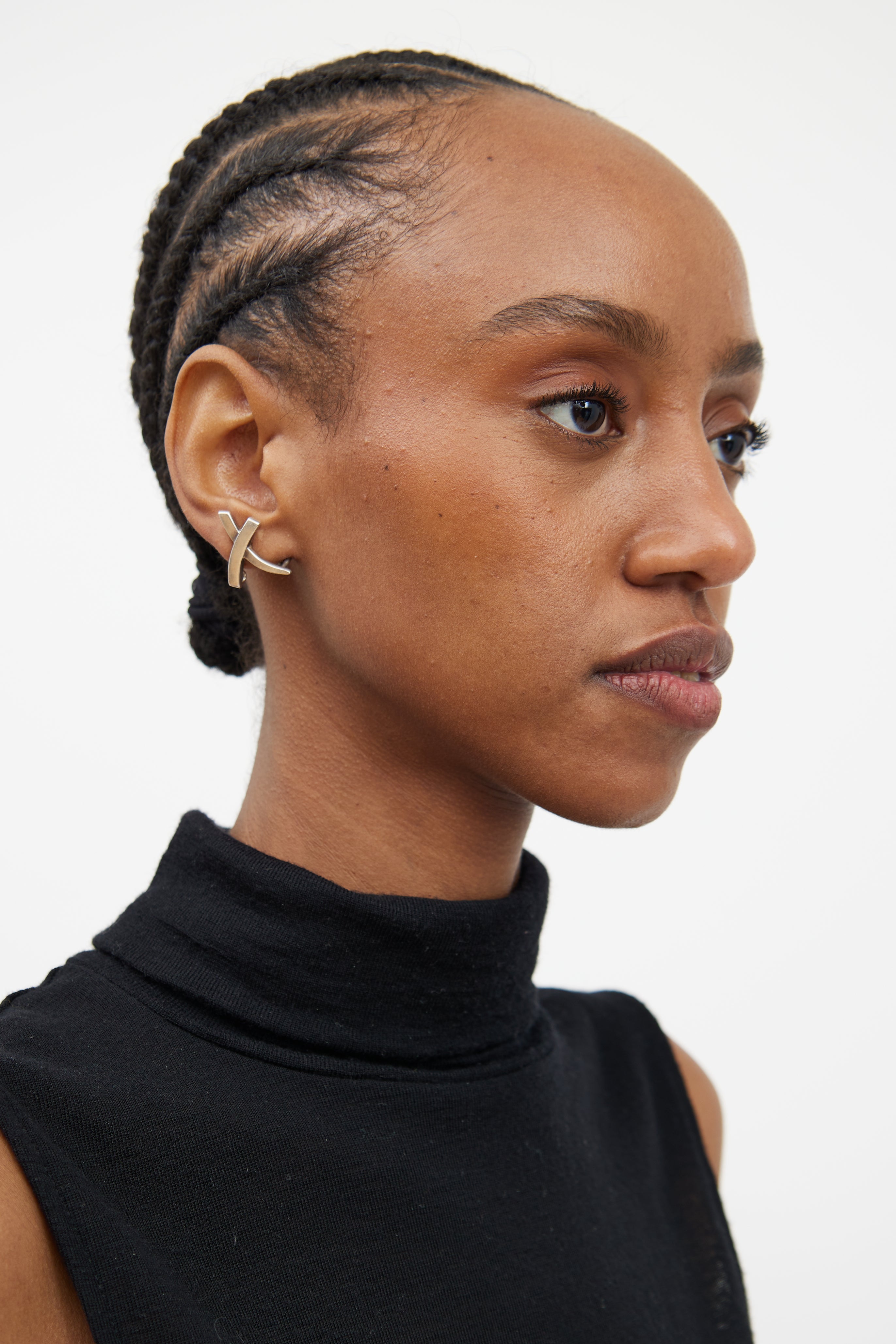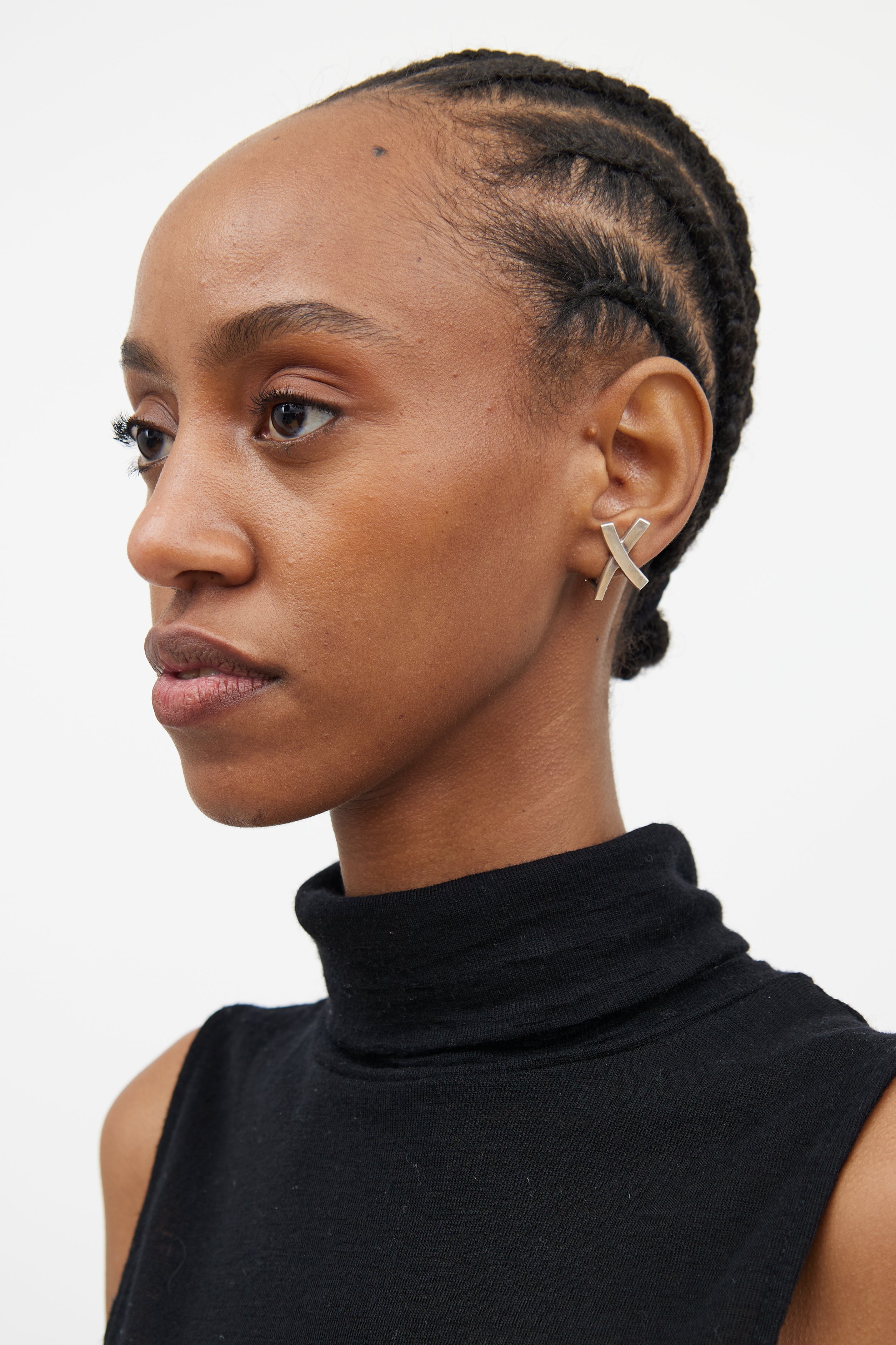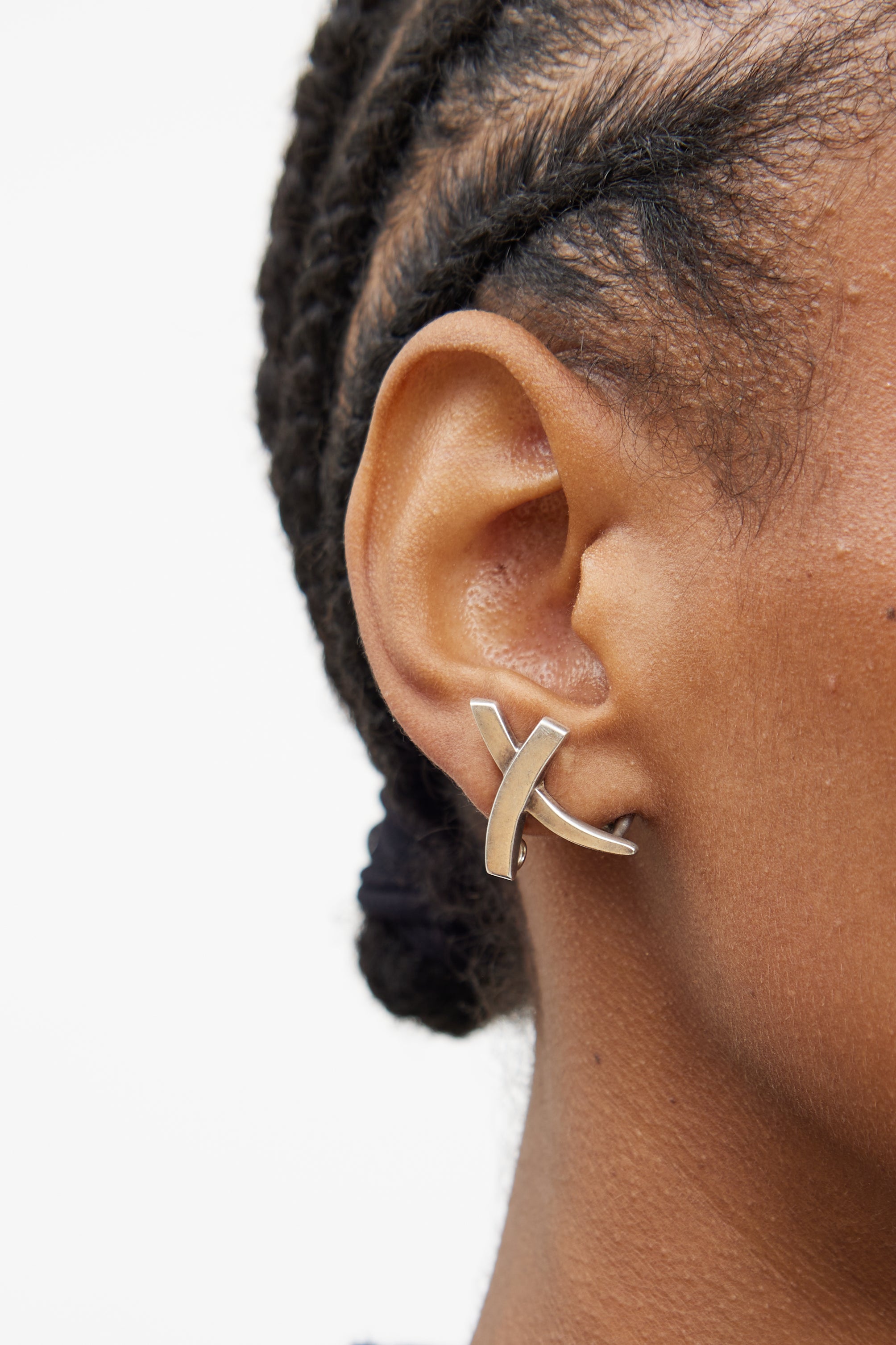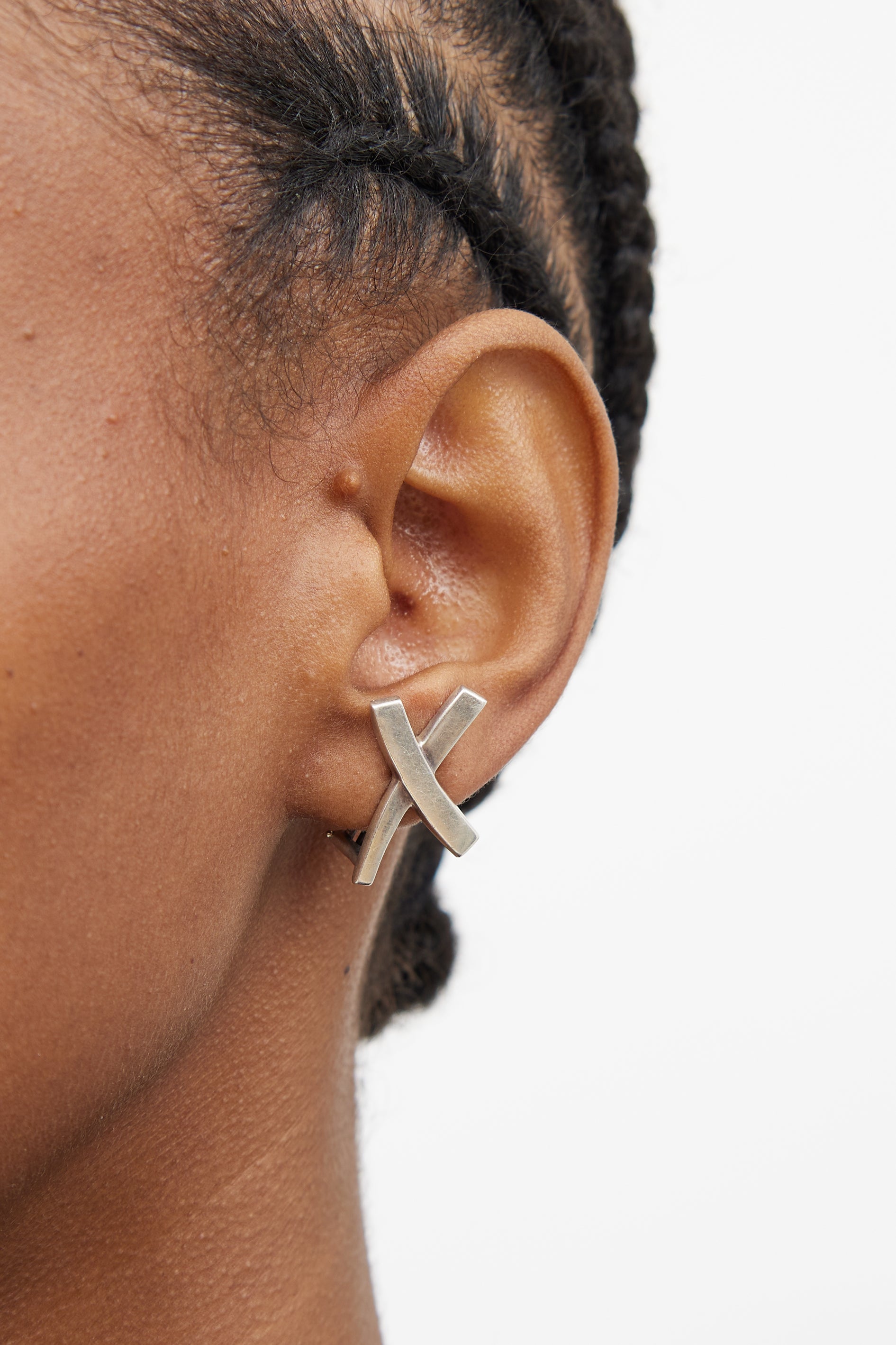 Pre-owned Tiffany & Co. sterling silver kiss earrings featuring an X shape motif, stamped "925" and "Tiffany & Co." at interior, and peg clasp closure. Includes original pouch.
