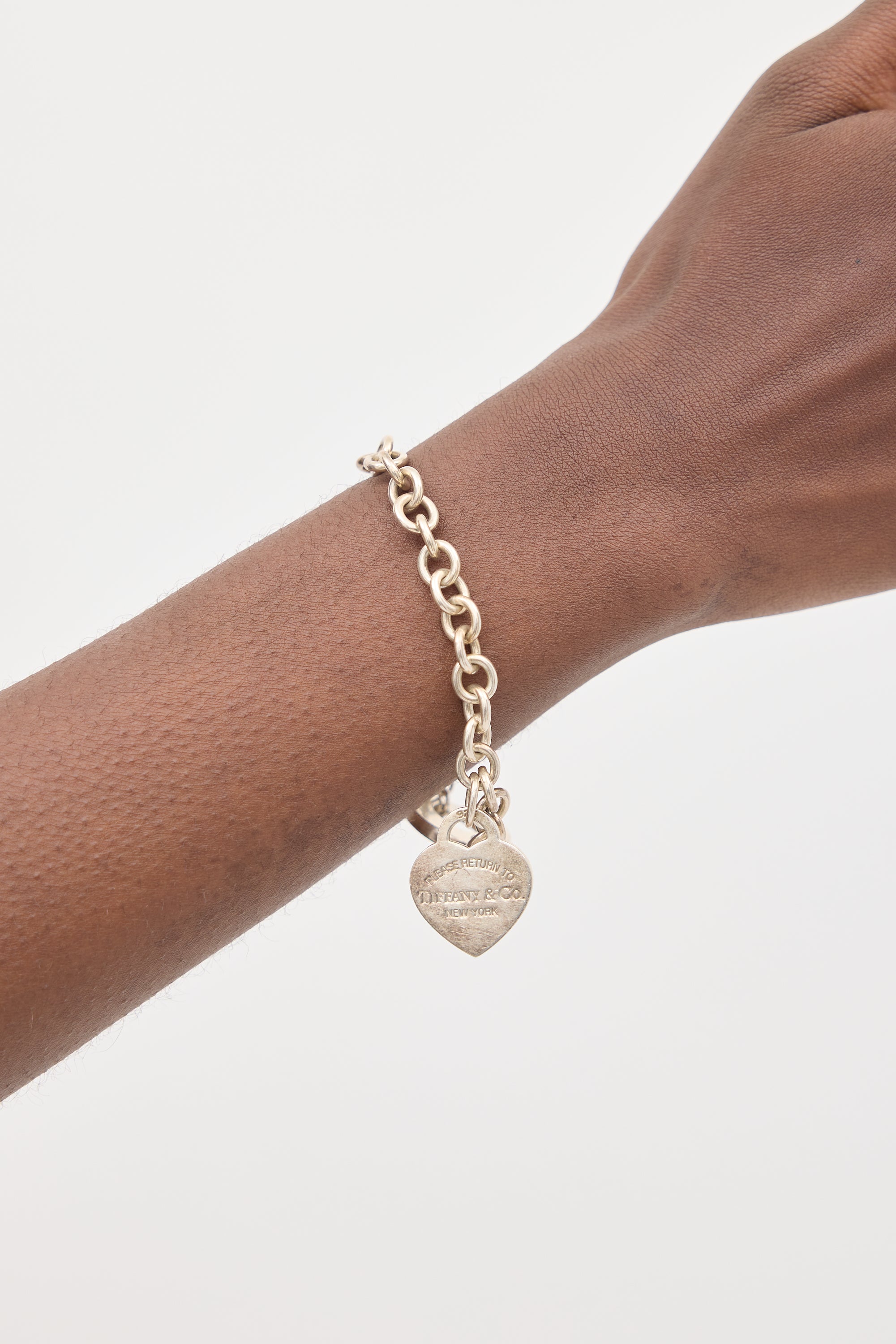 Pre-owned Tiffany & Co. sterling silver bracelet featuring a chain link, heart charm with "925" and "Please Return To Tiffany" engraving, and toggle closure. Comes with original dust bag.