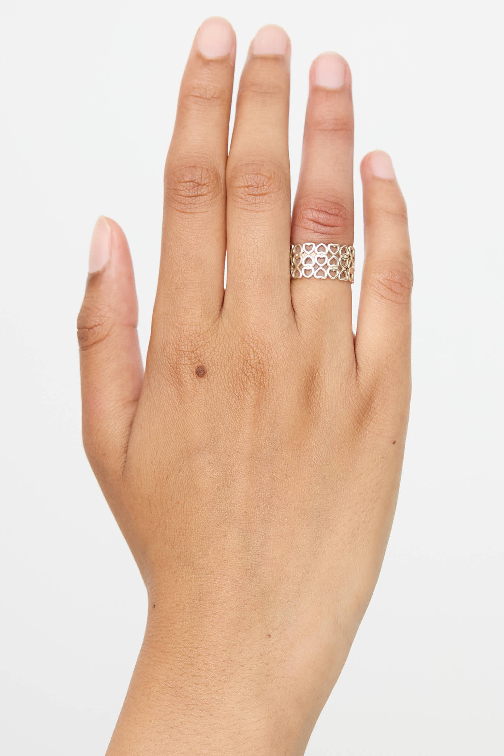 Pre-owned Tiffany & Co. x Paloma Picasso sterling silver Crown of Hearts ring featuring stacked hearts, cut out detailing, and "925" and "T & Co." stamping at interior.
