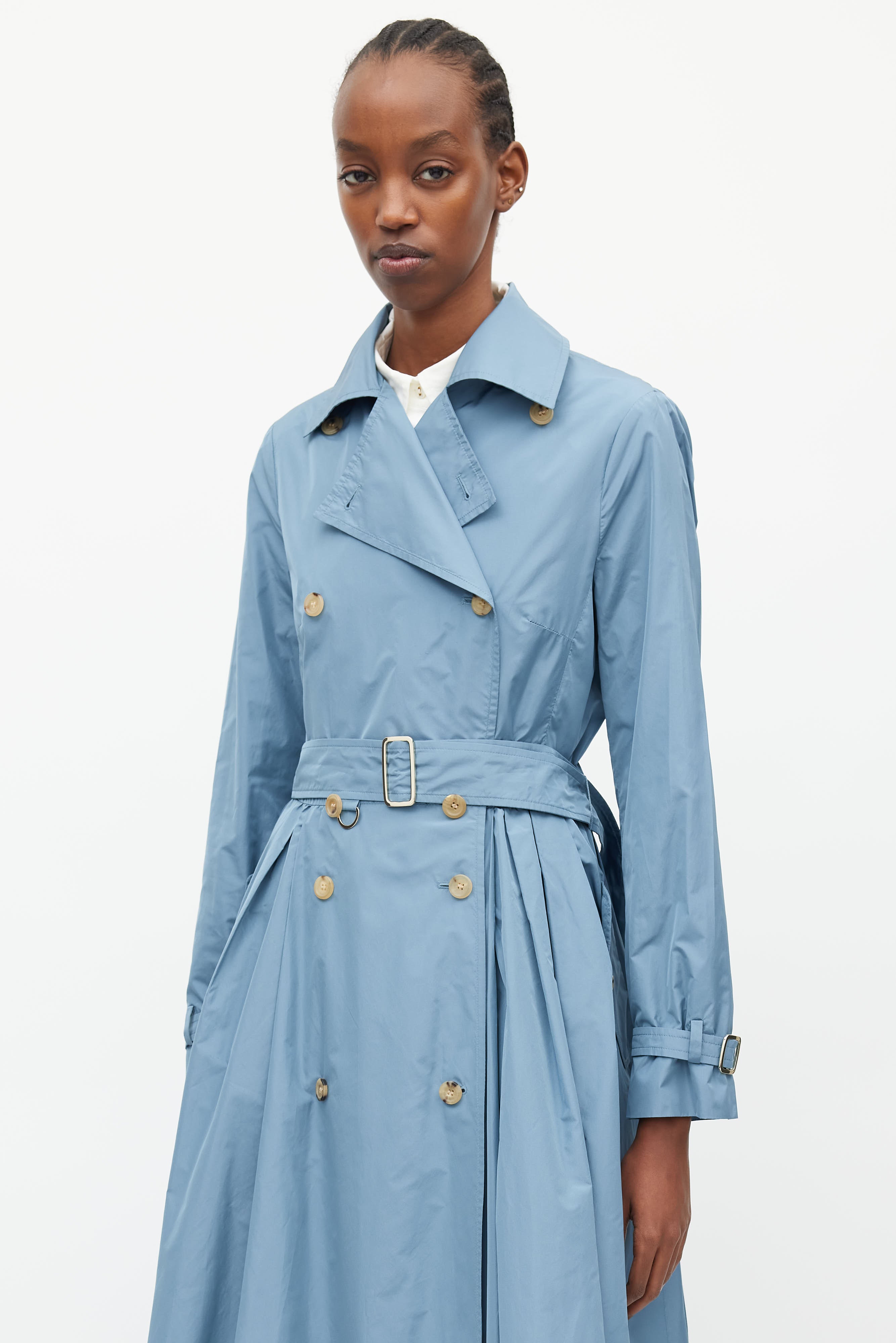 Pre-owned Max Mara blue nylon trench coat featuring notch lapel, double breasted front, A-line hem, two buttoned pockets at hips, buckle fastening at cuffs, and self tie waist belt. Unlined.