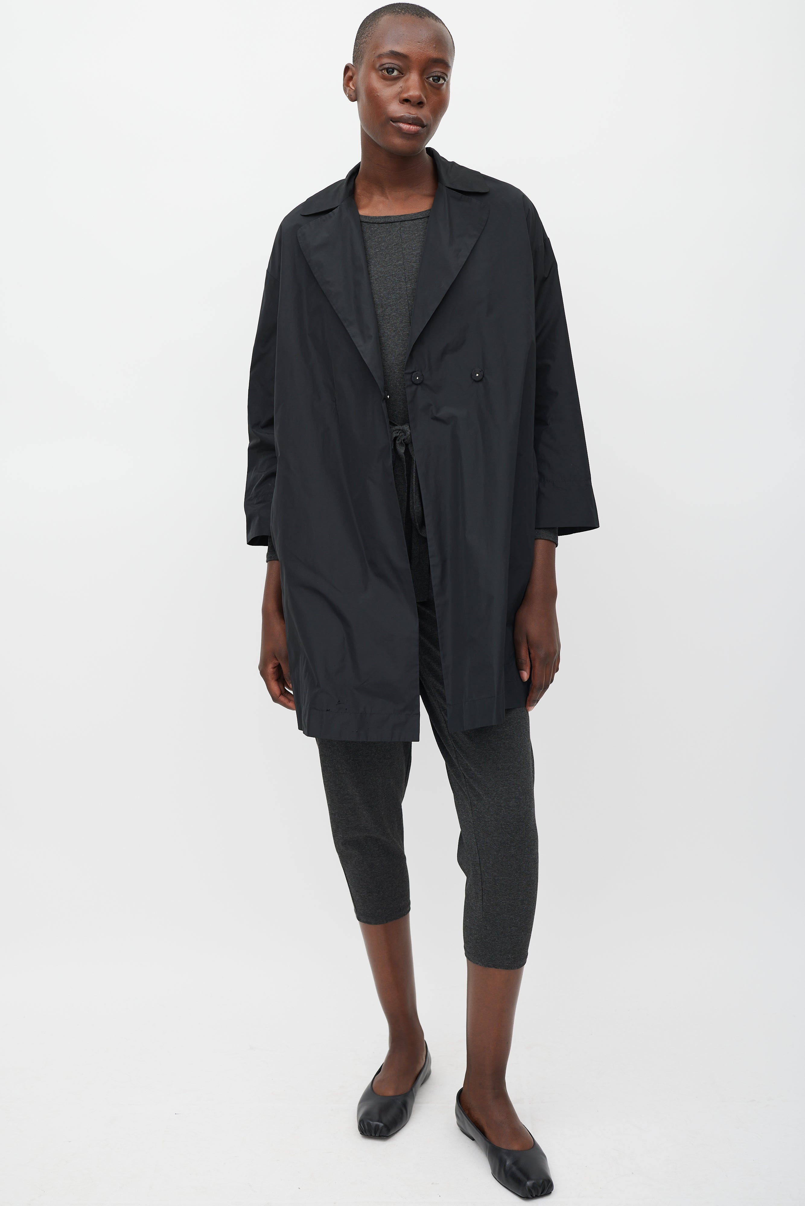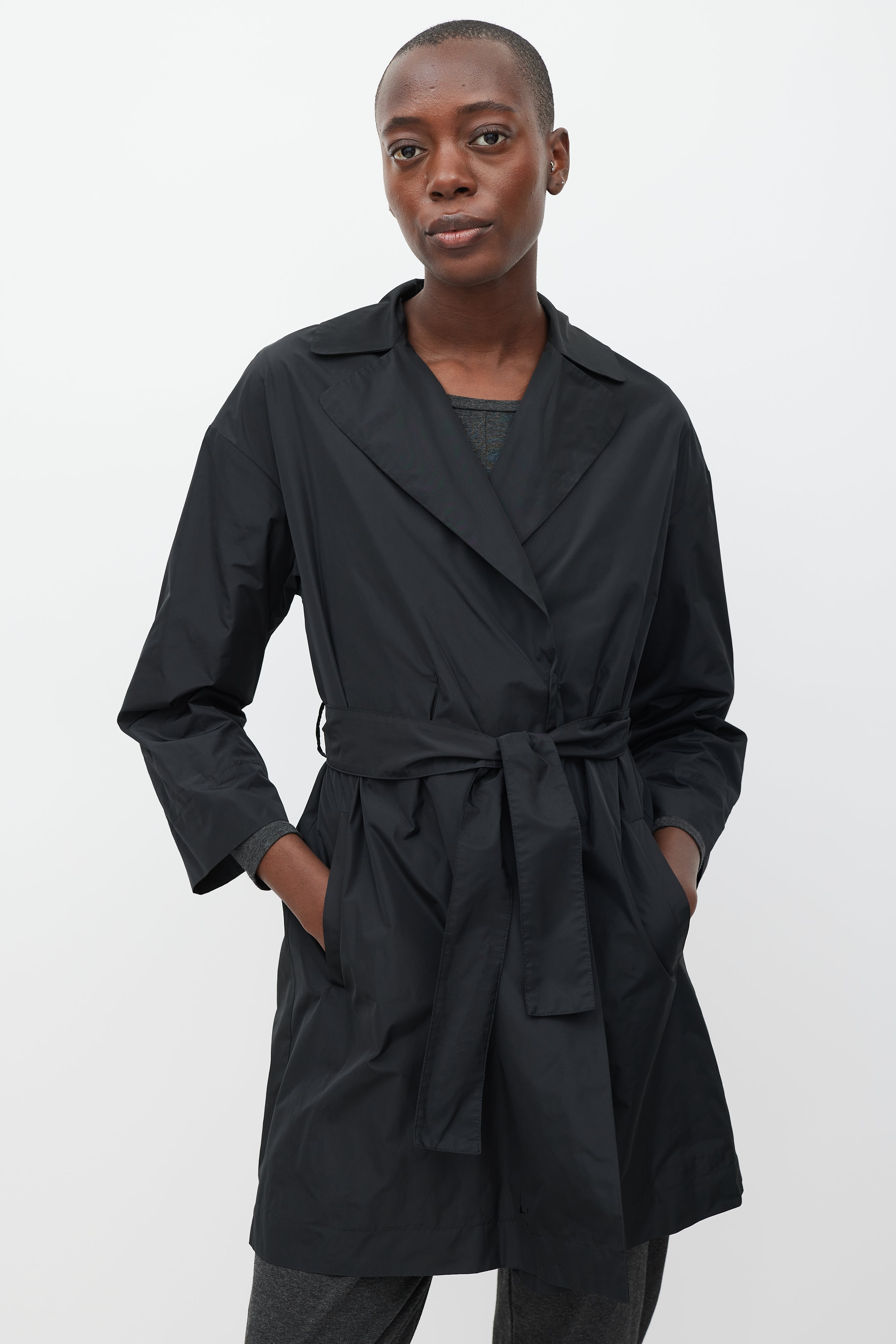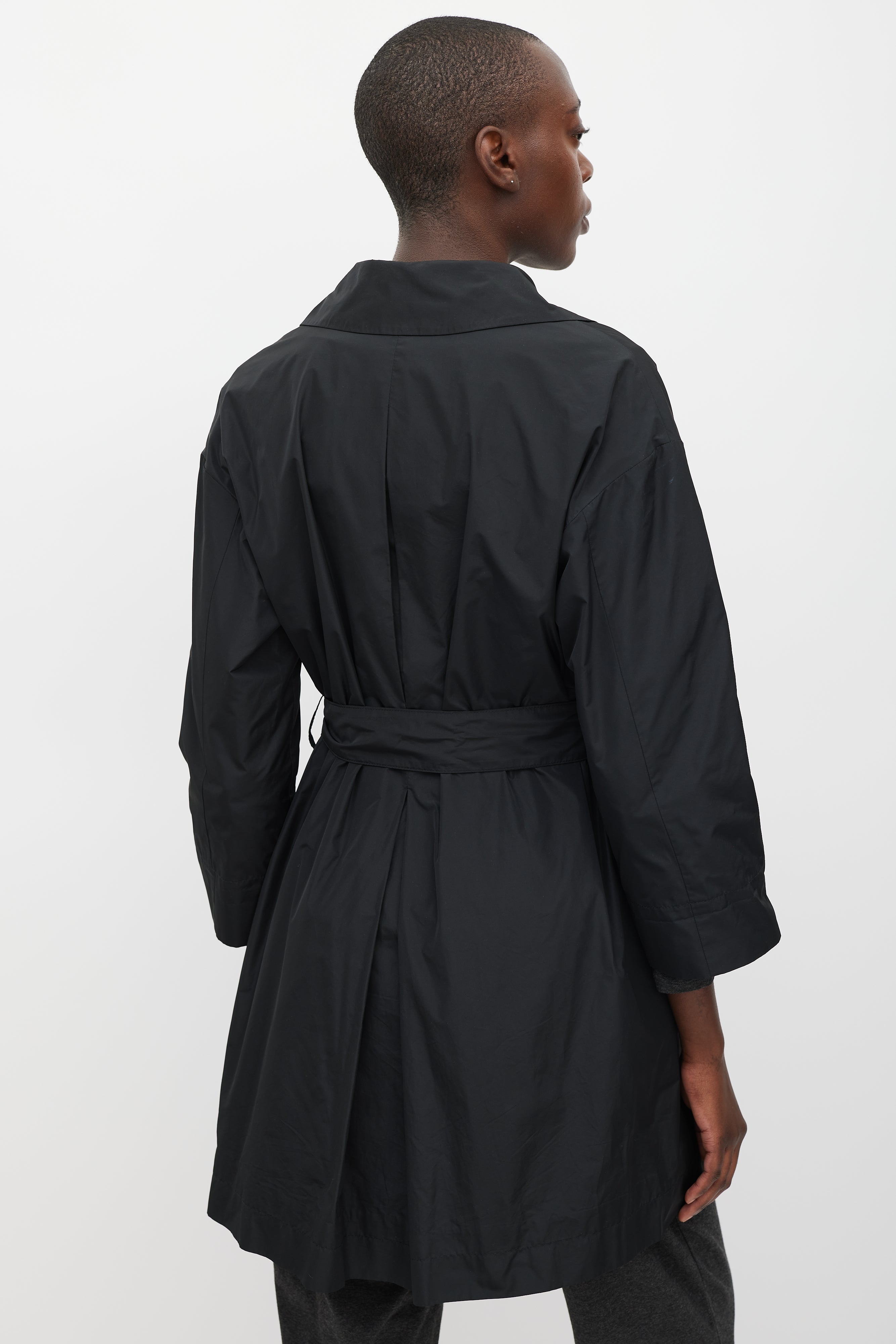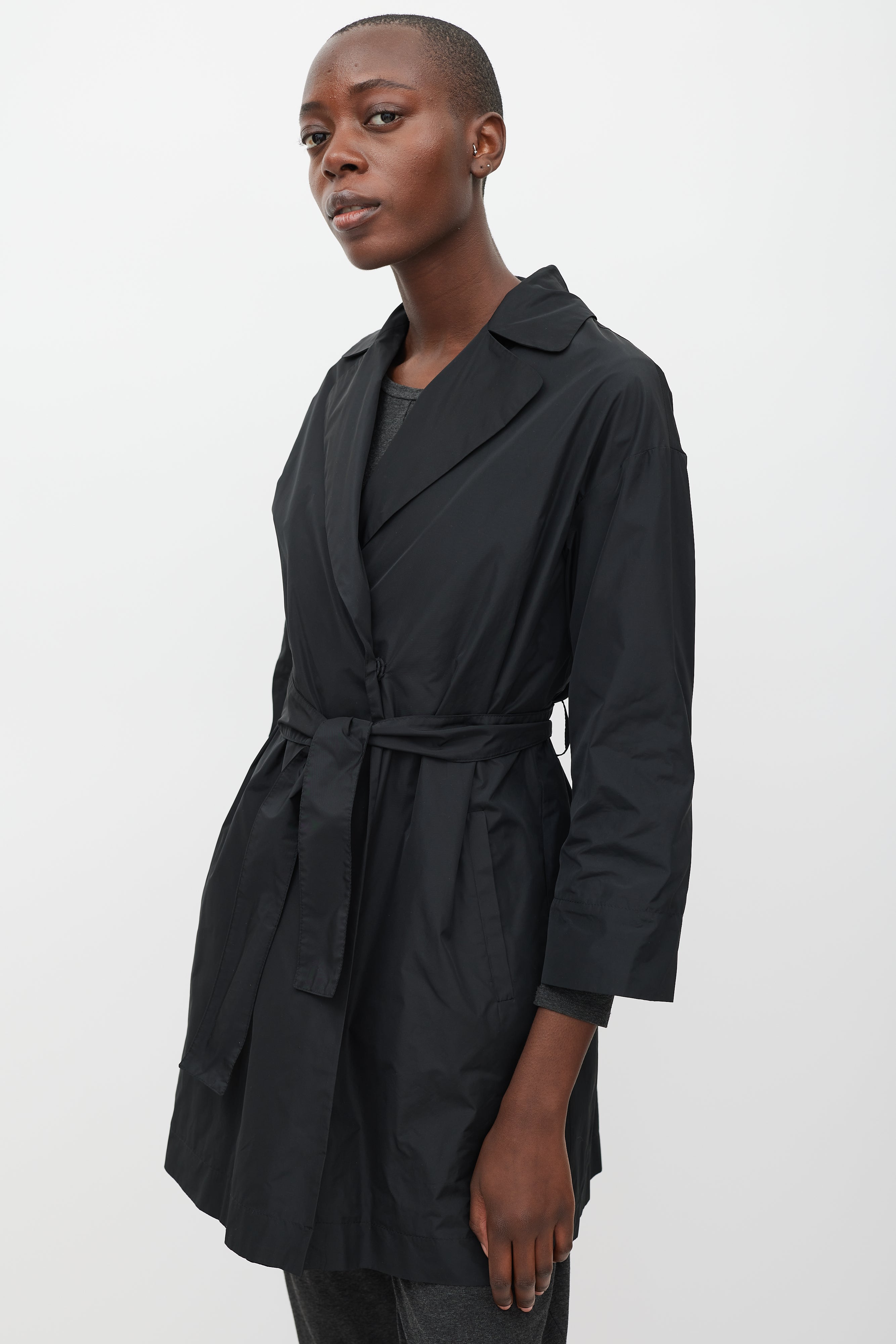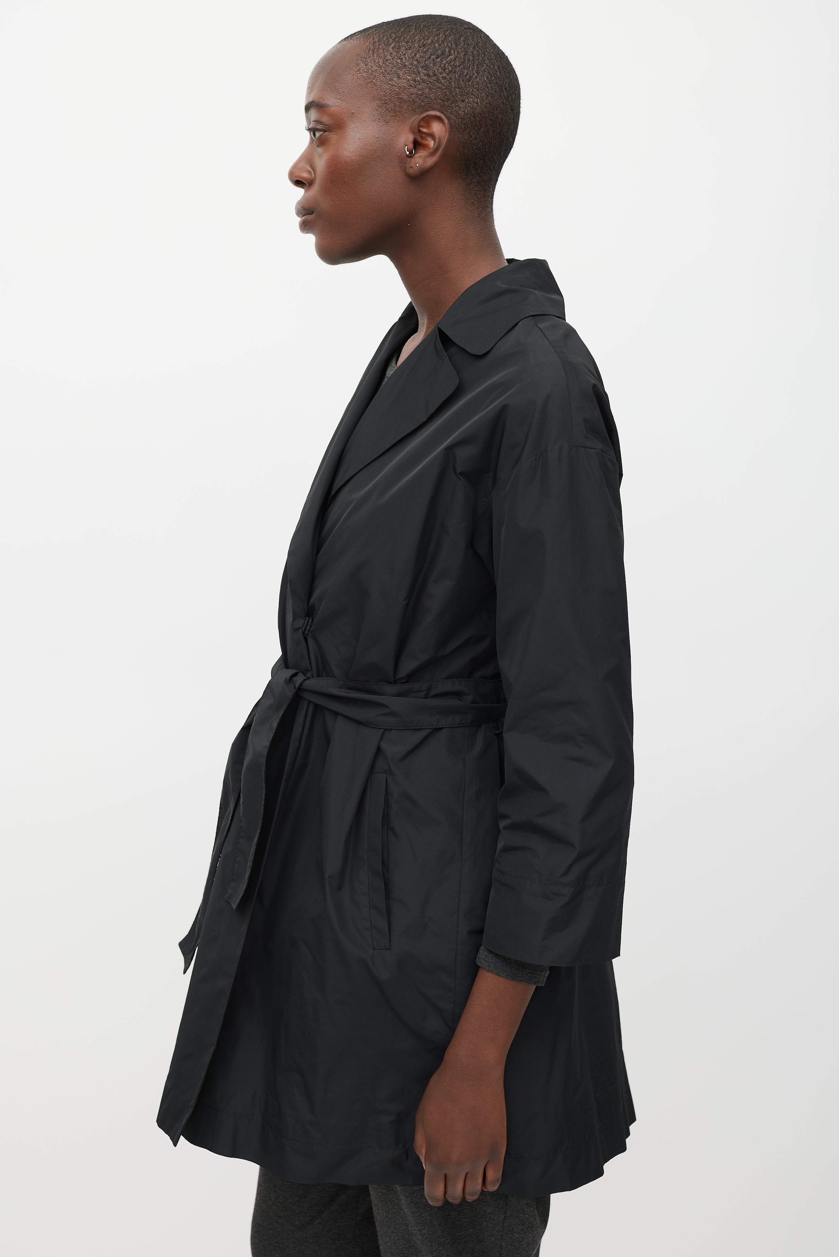 Pre-owned Max Mara Weekend X New Life black trench coat featuring a notched collar, concealed 2x1 double breasted snap button front, two front slip pockets, tie waist, back kick pleat, and three quarter length sleeves. Lined.