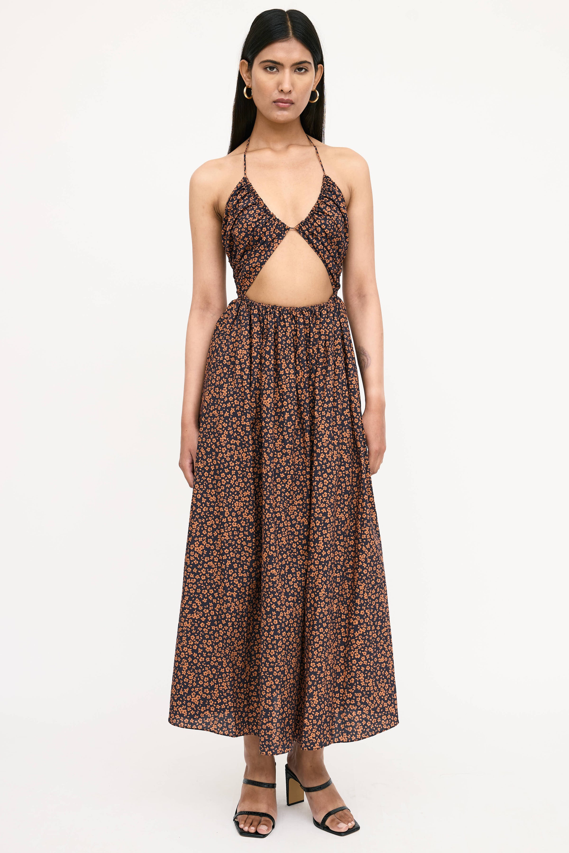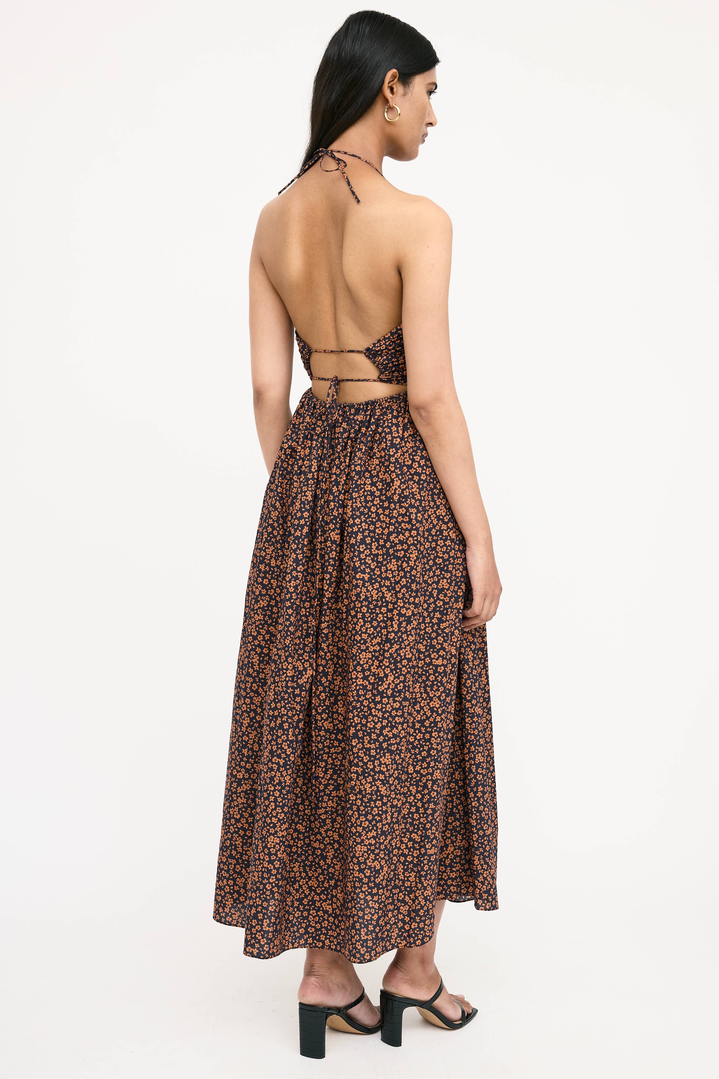 Matteau black maxi dress featuring an orange floral pattern throughout, halter neckline, sleeveless styling, elastic waist with cut out, two slip pockets at hip, and tie closure at back.