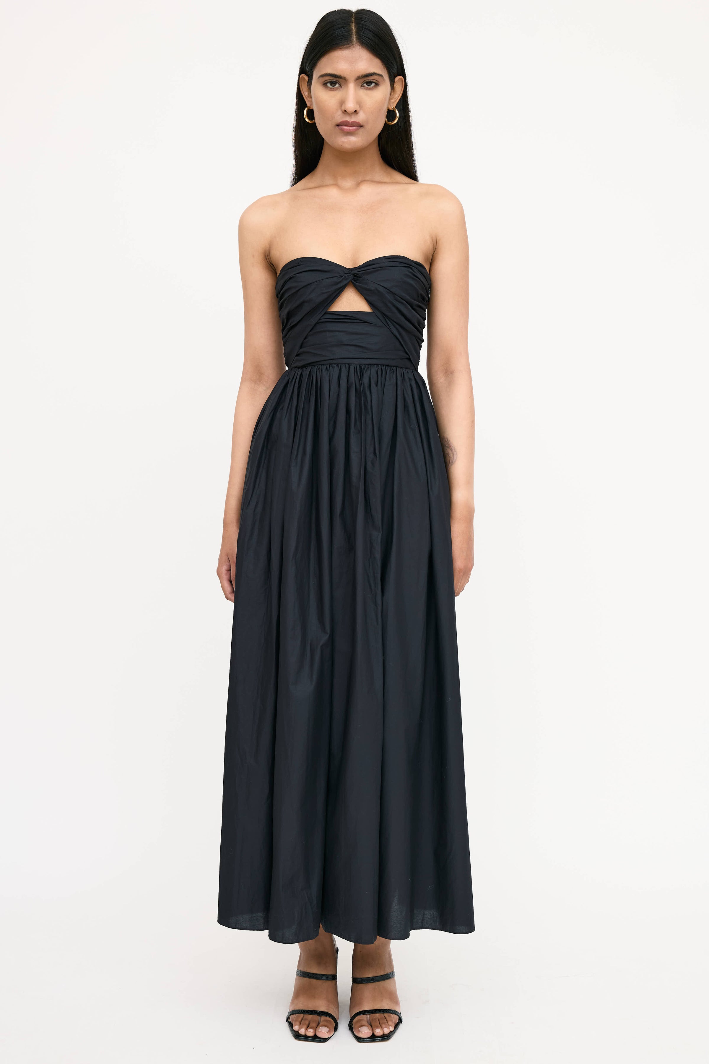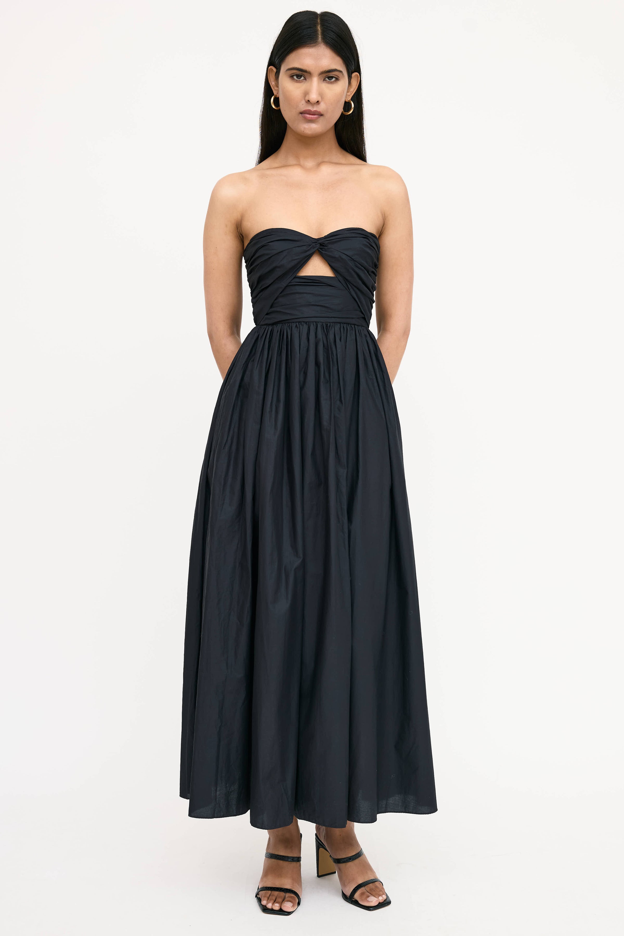 Matteau black midi dress featuring a gathered sweetheart neckline with cut out, pleated skirt, zip closure at side.