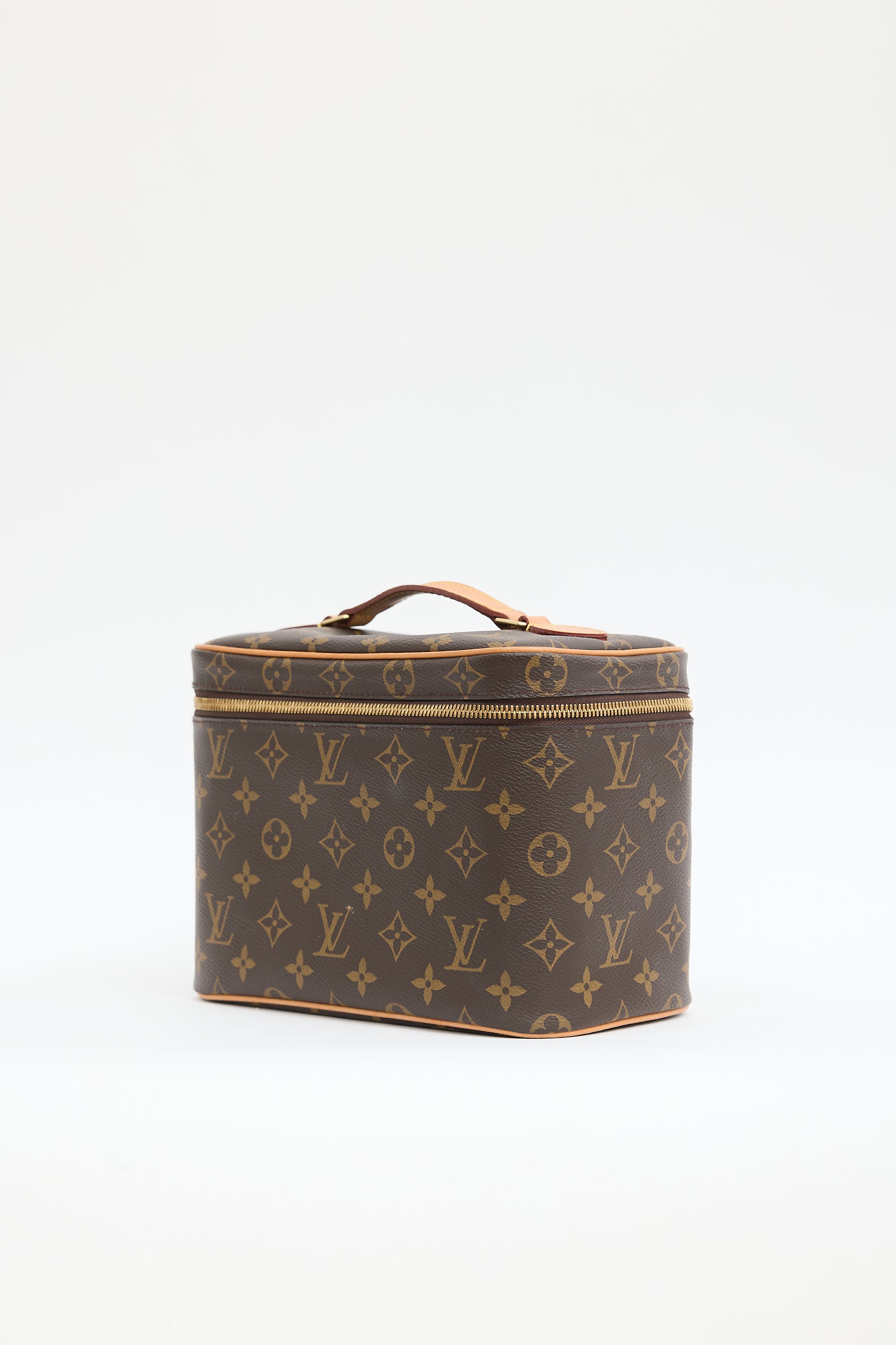 Pre-owned Louis Vuitton 2019 brown Nice BB vanity case featuring signature monogram coated canvas, brown Vachetta leather trim, single top handle, two way zip around closure, and one lined main compartment with one zip pocket and one slip pocket.