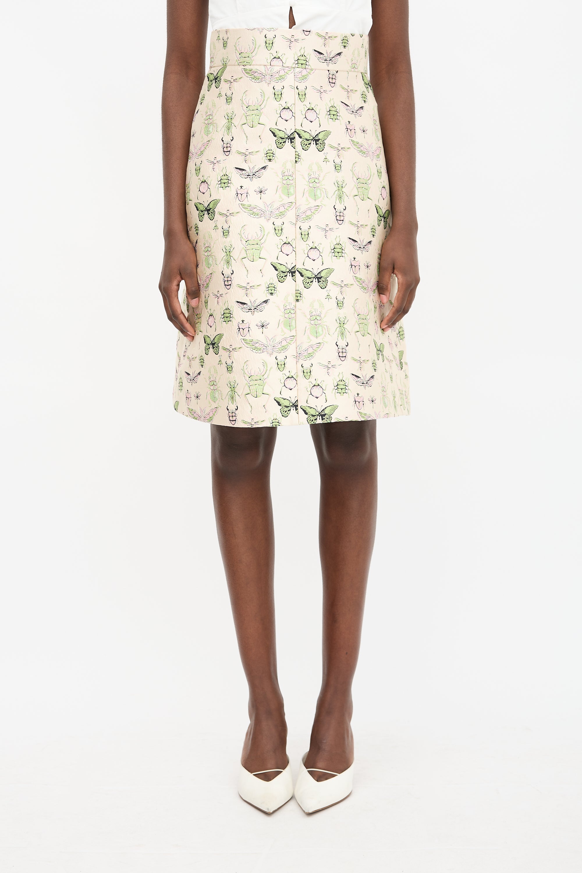 Pre-owned Red Valentino cream brocade midi skirt featuring a back zip closure, pink and green sparkly insect motif, and A-line silhouette.
