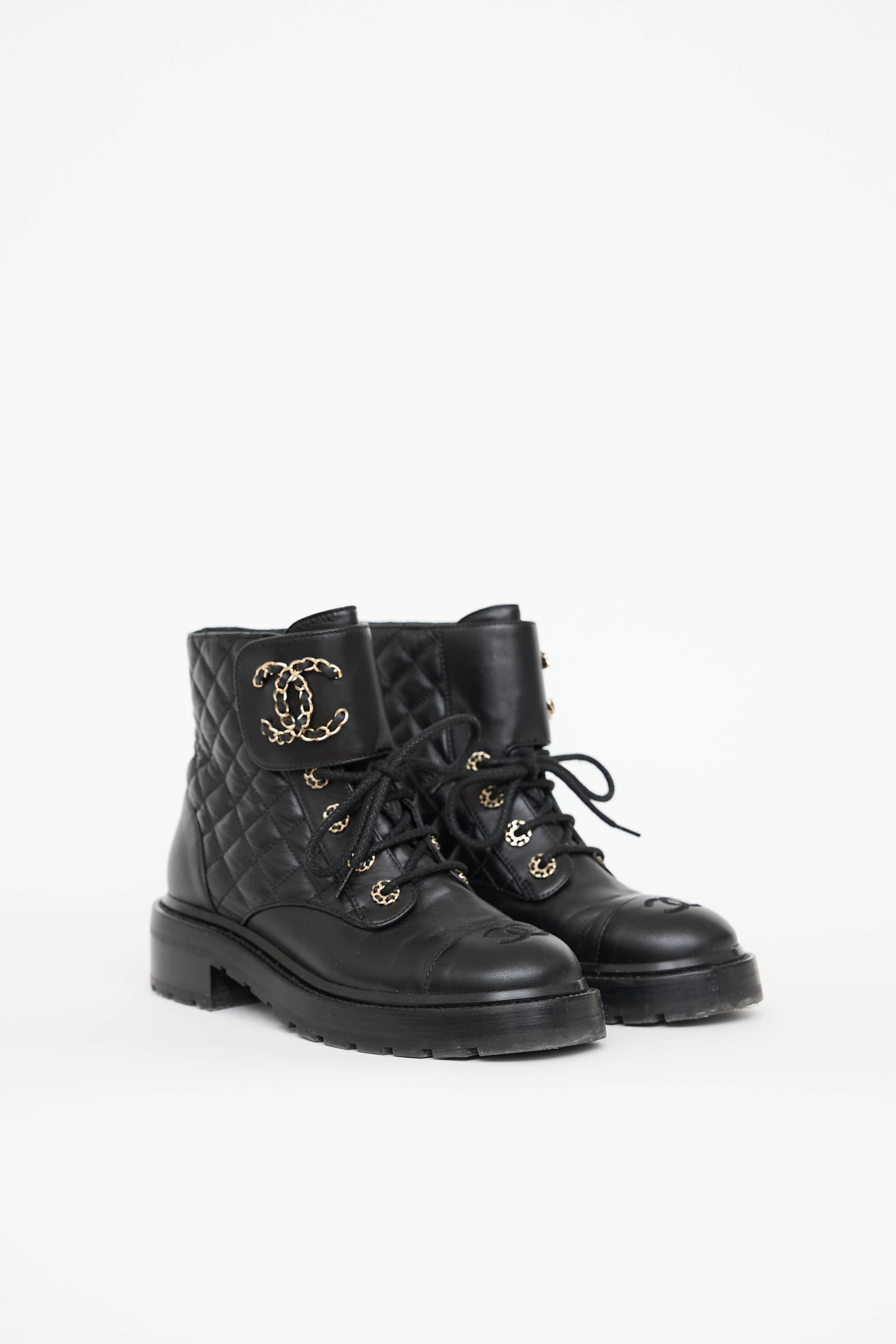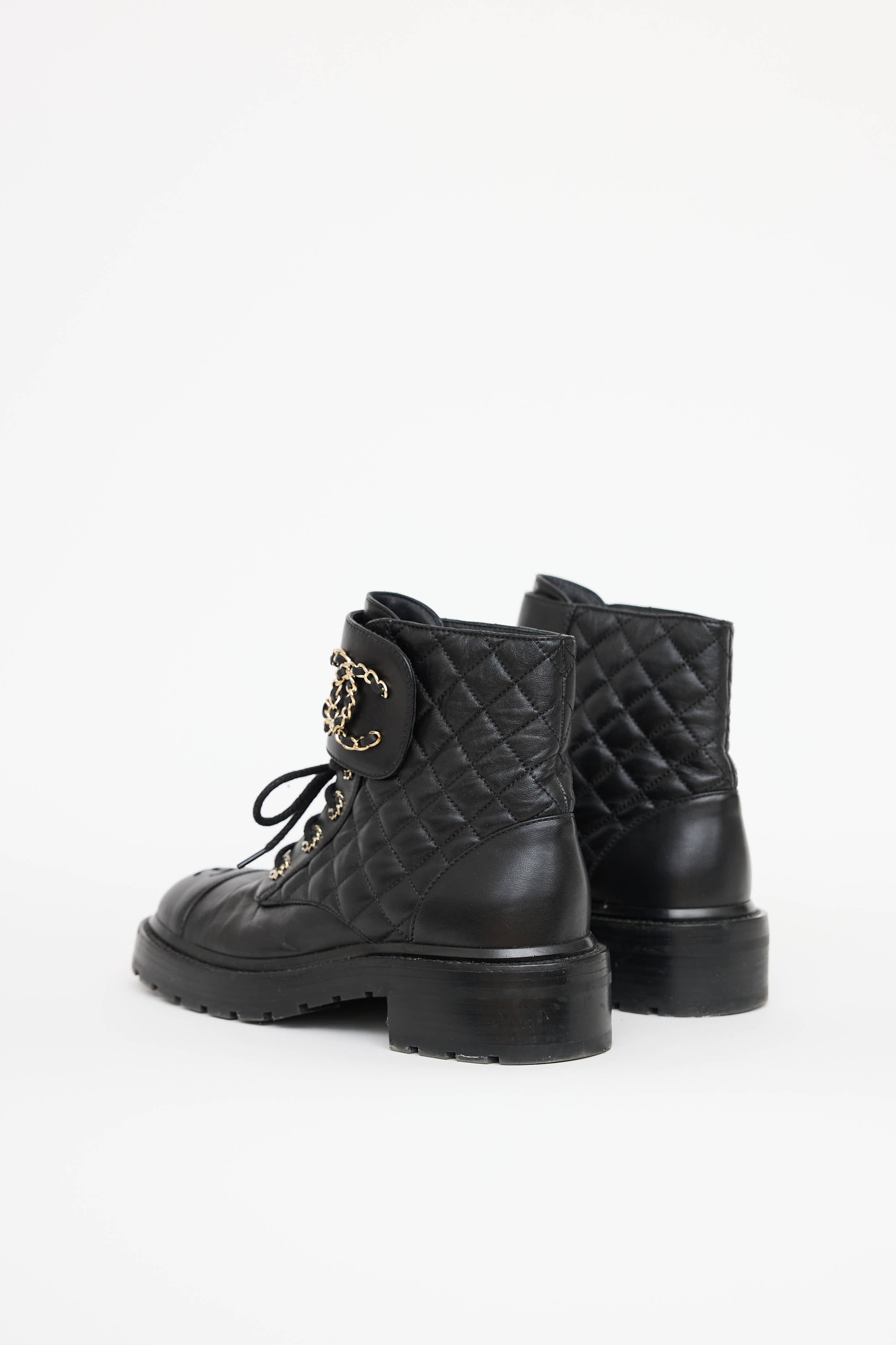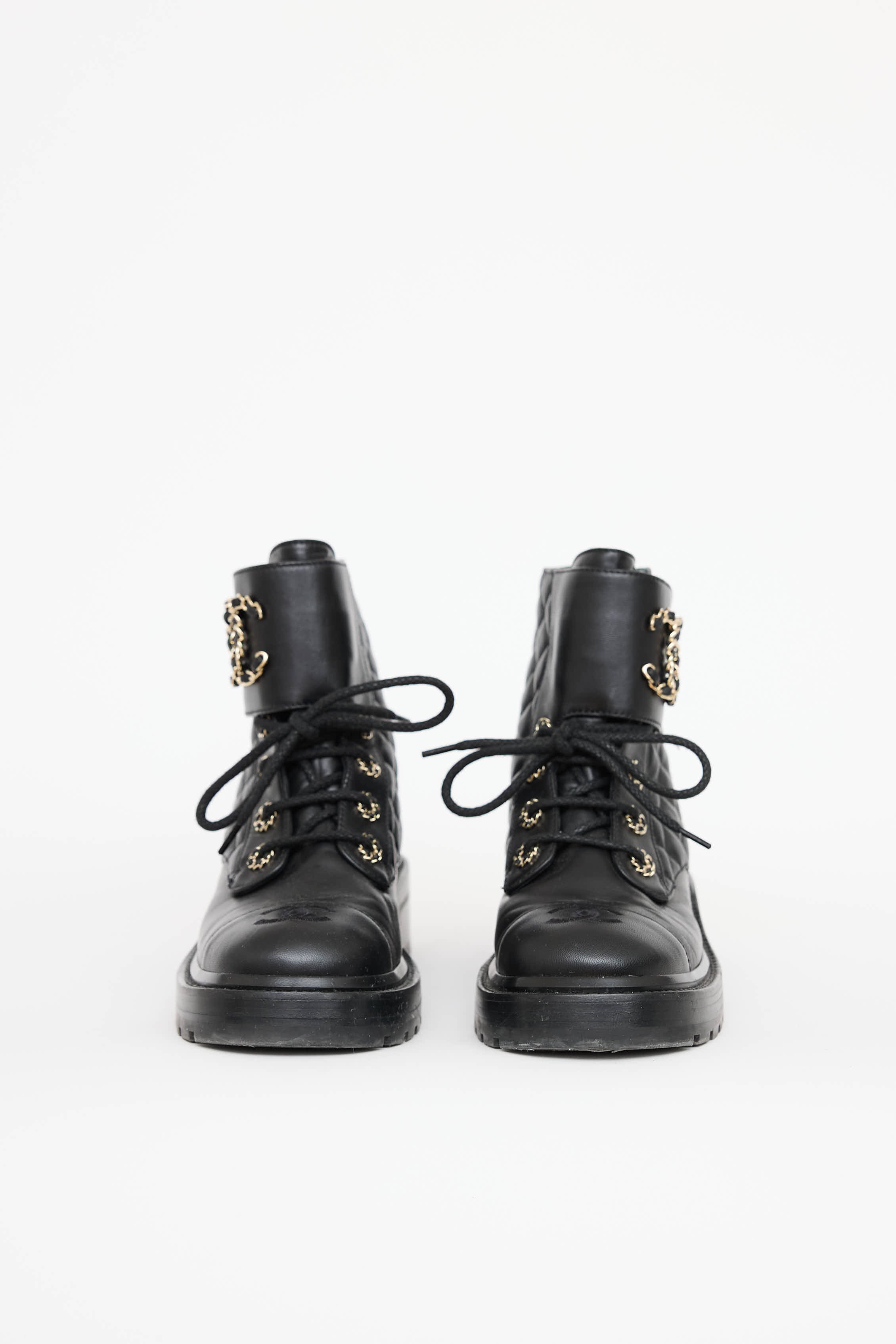 Pre-owned Chanel 21A black leather combat boot featuring round toe, embroidered CC logo at toe cap, lace up vamp, logo at ankle strap with signature gold tone chain link detail, quilted upper, stacked heel, and treaded outsole.