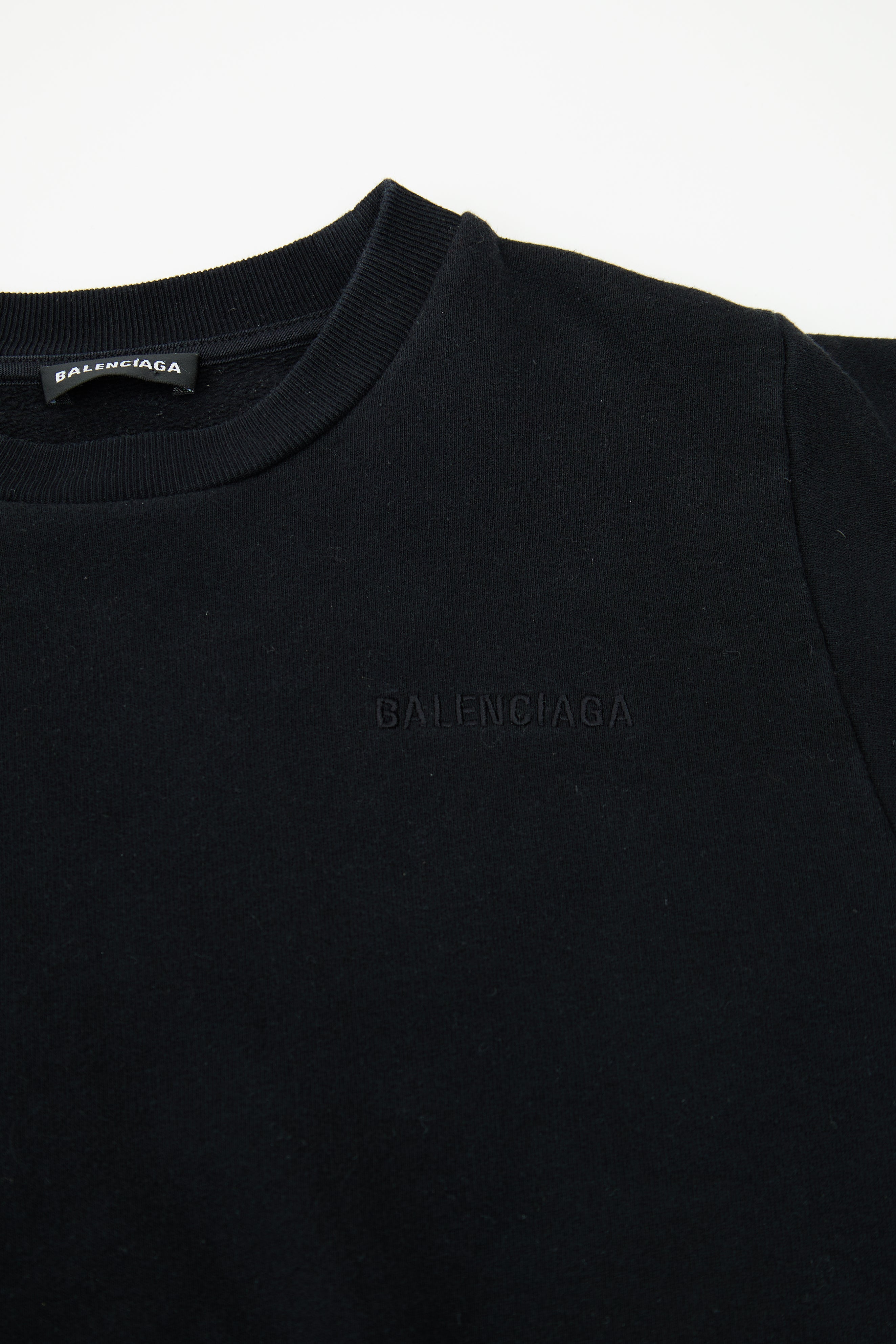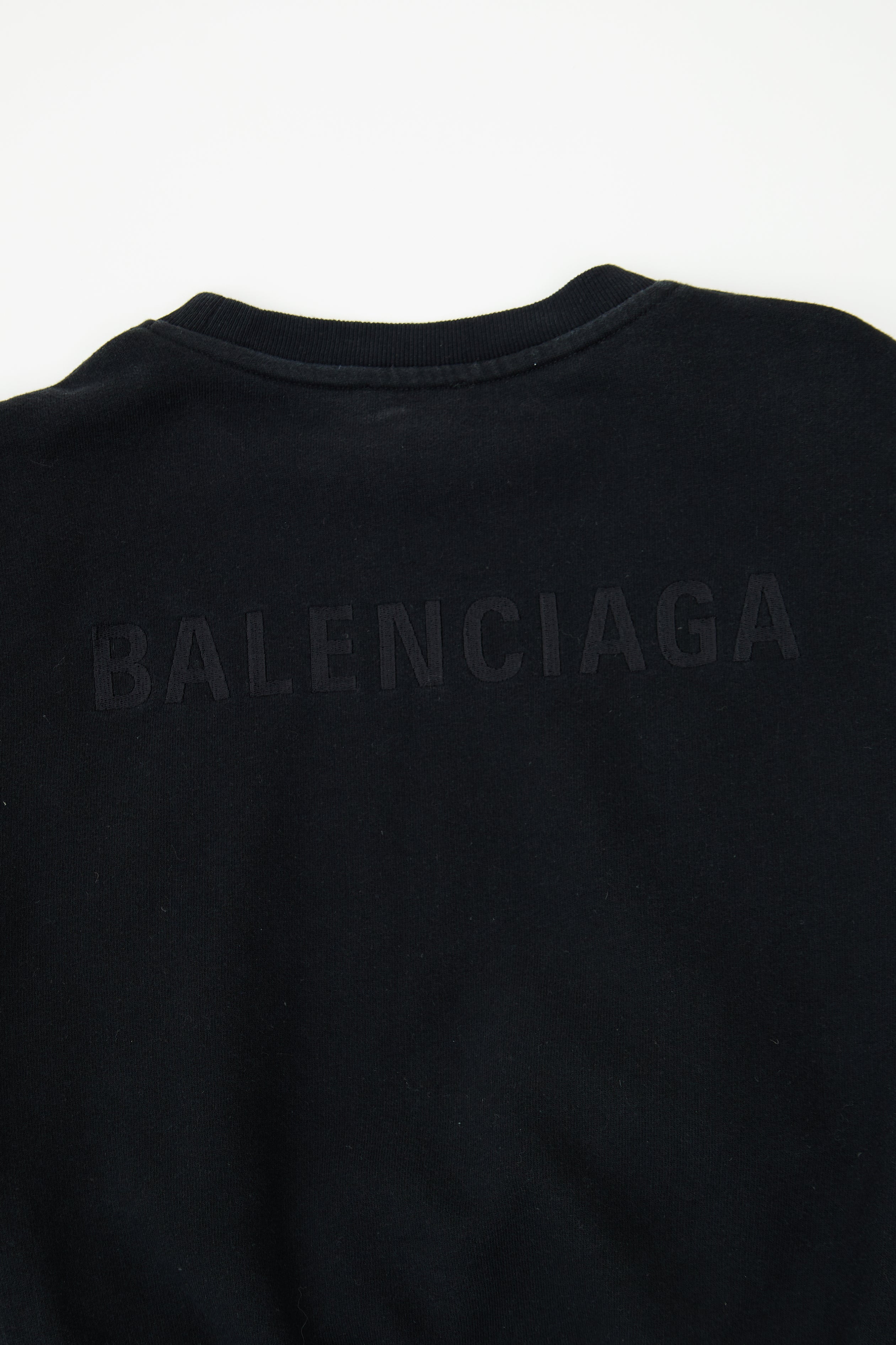Pre-owned Balenciaga black long sleeve sweatshirt featuring round ribbed neckline, ribbed cuffs and hemline band, and embroidered logo text across left chest and back.