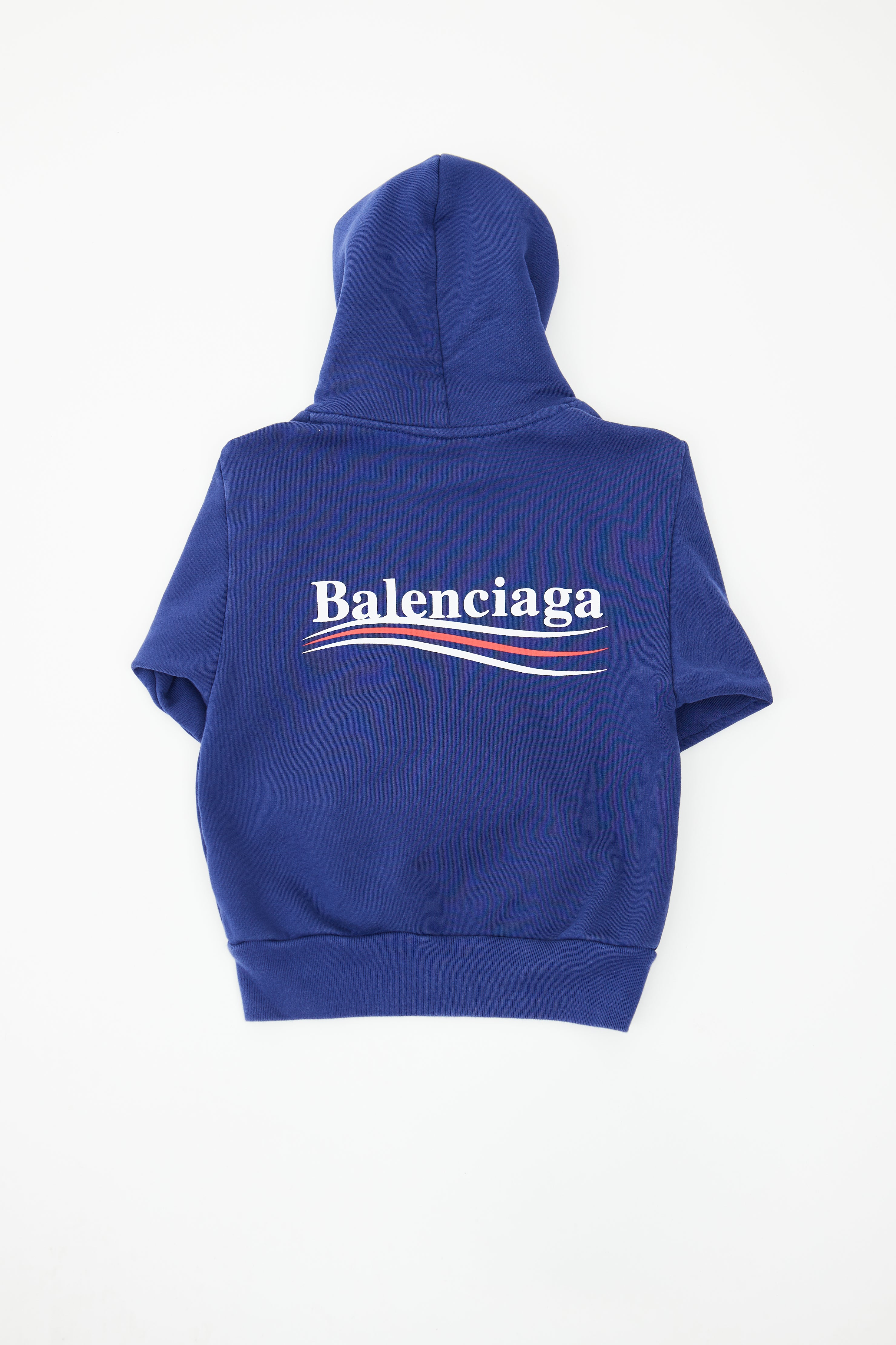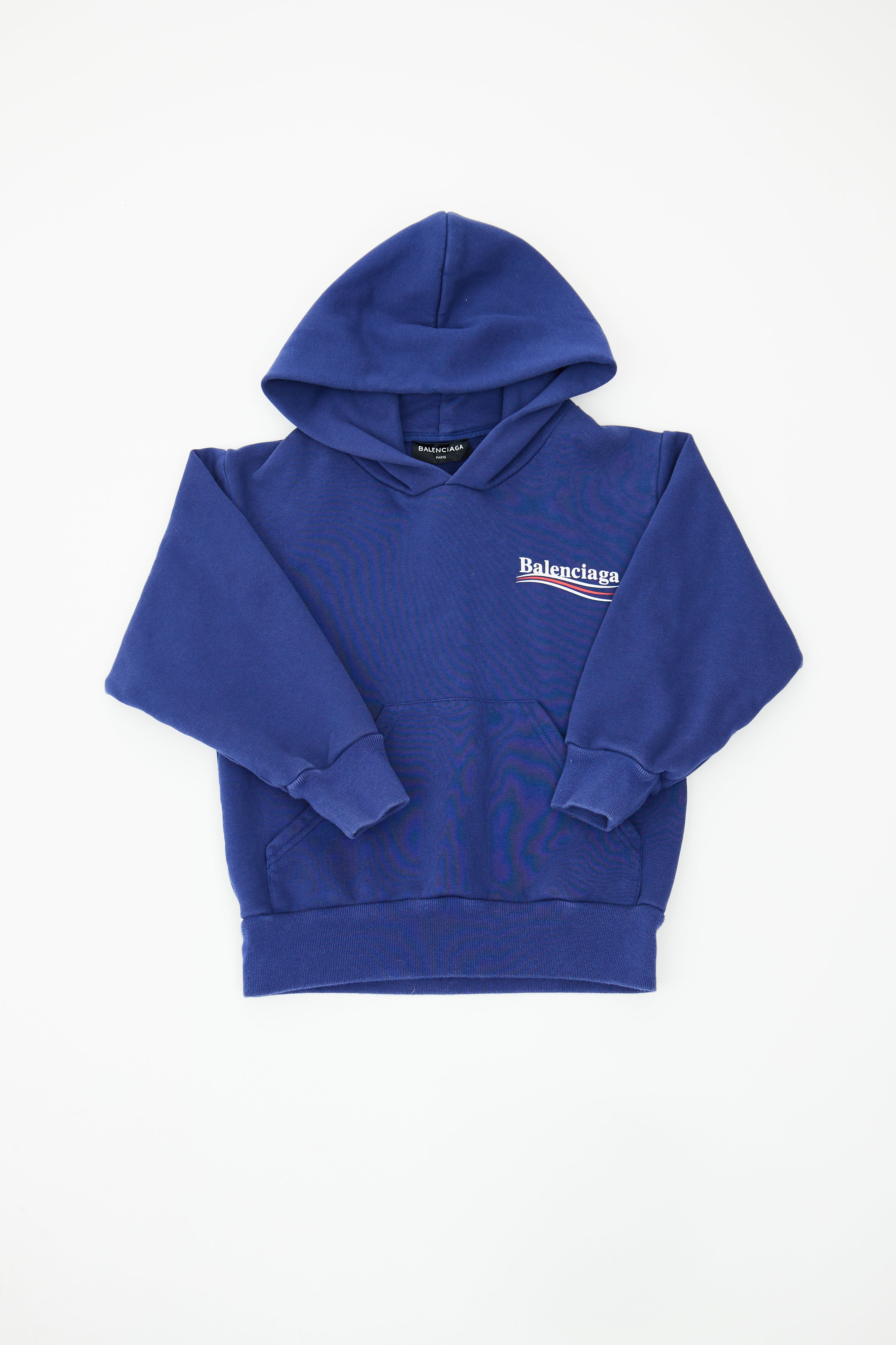 Pre-owned Balenciaga navy long sleeve hoodie featuring hood, logo text across left chest and back, and kangaroo pocket.