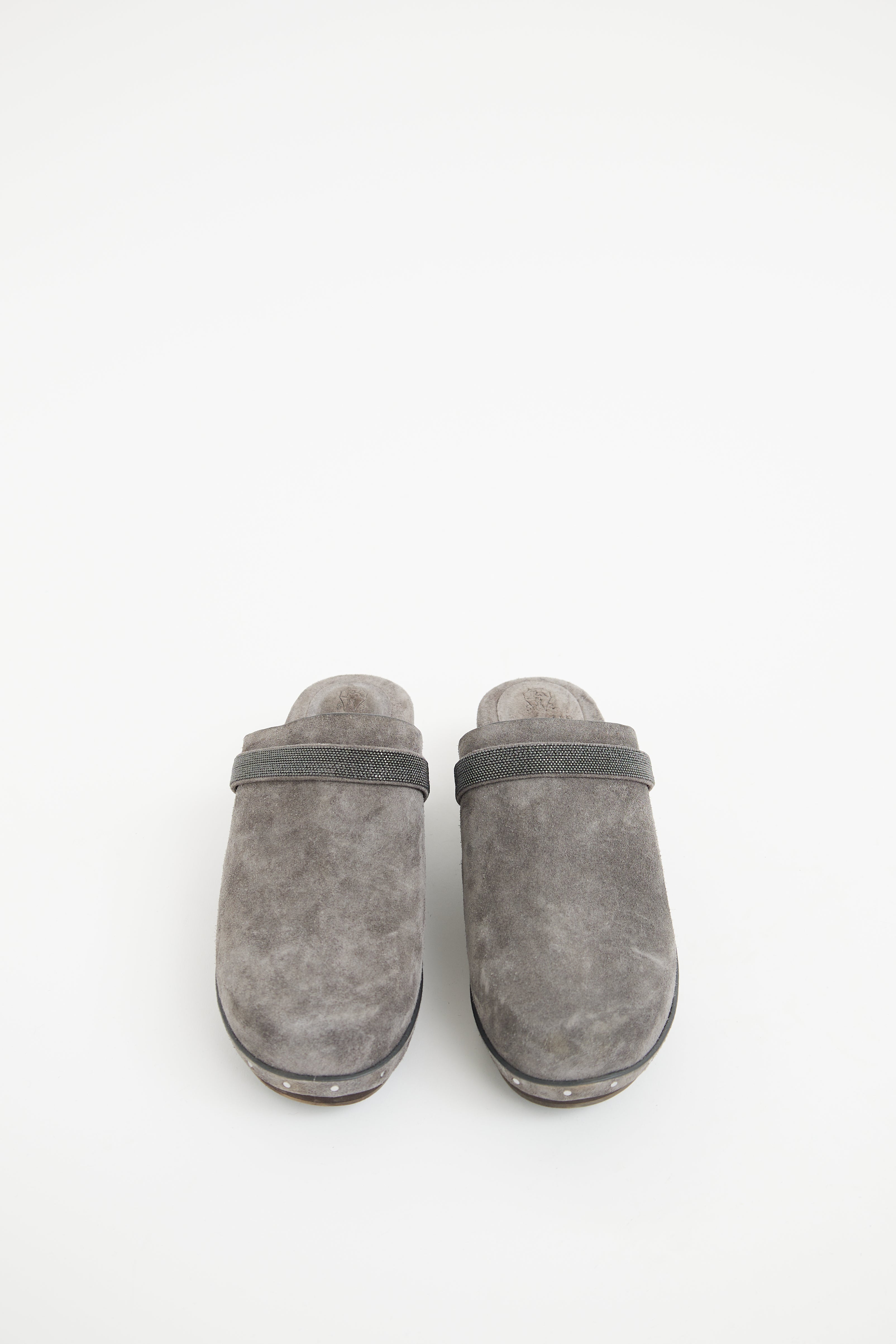 Pre-owned Brunello Cucinelli grey suede Monili clogs featuring round toe, beaded strap detail on upper, silver tone grey stud detailing on midsole and covered block heel.