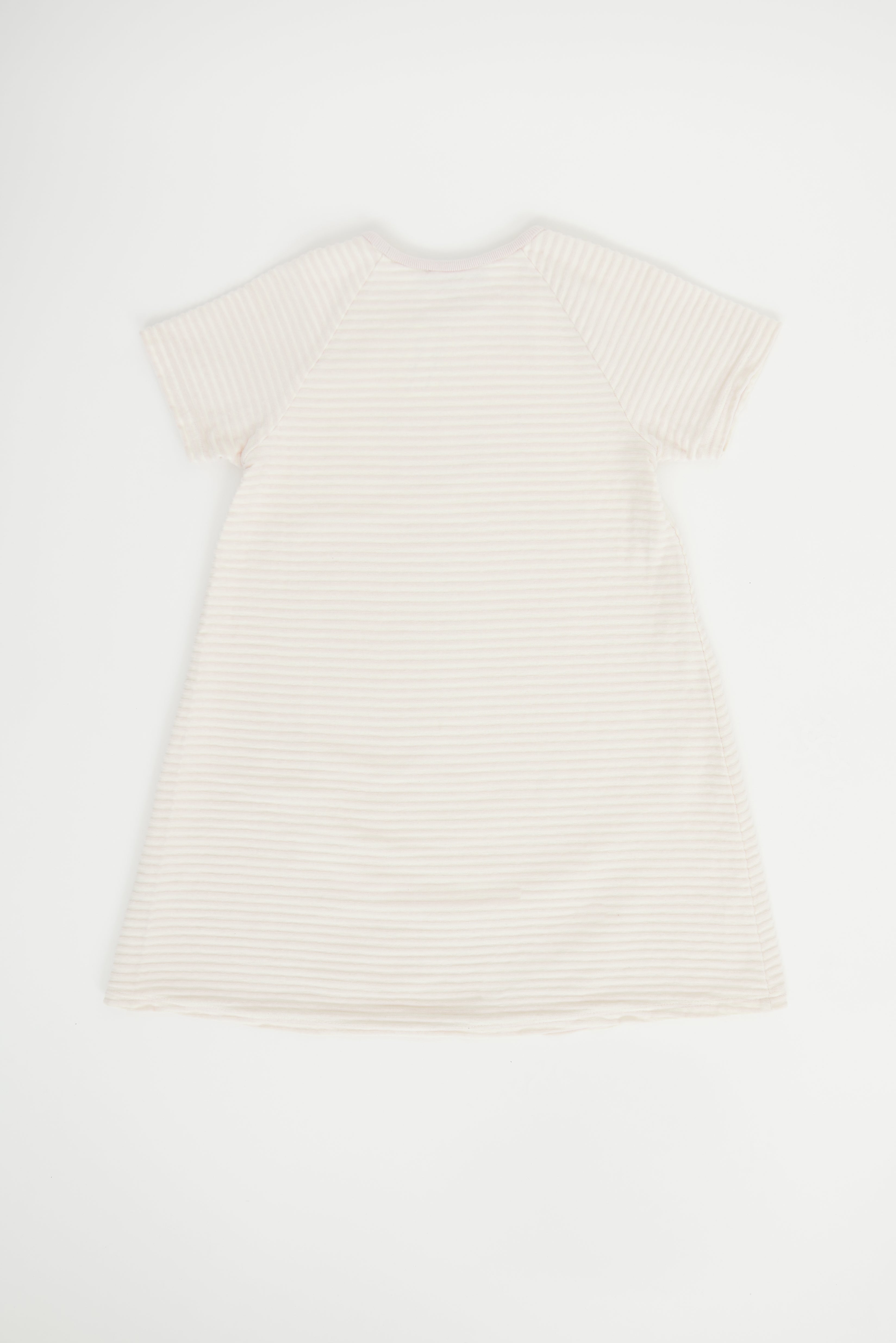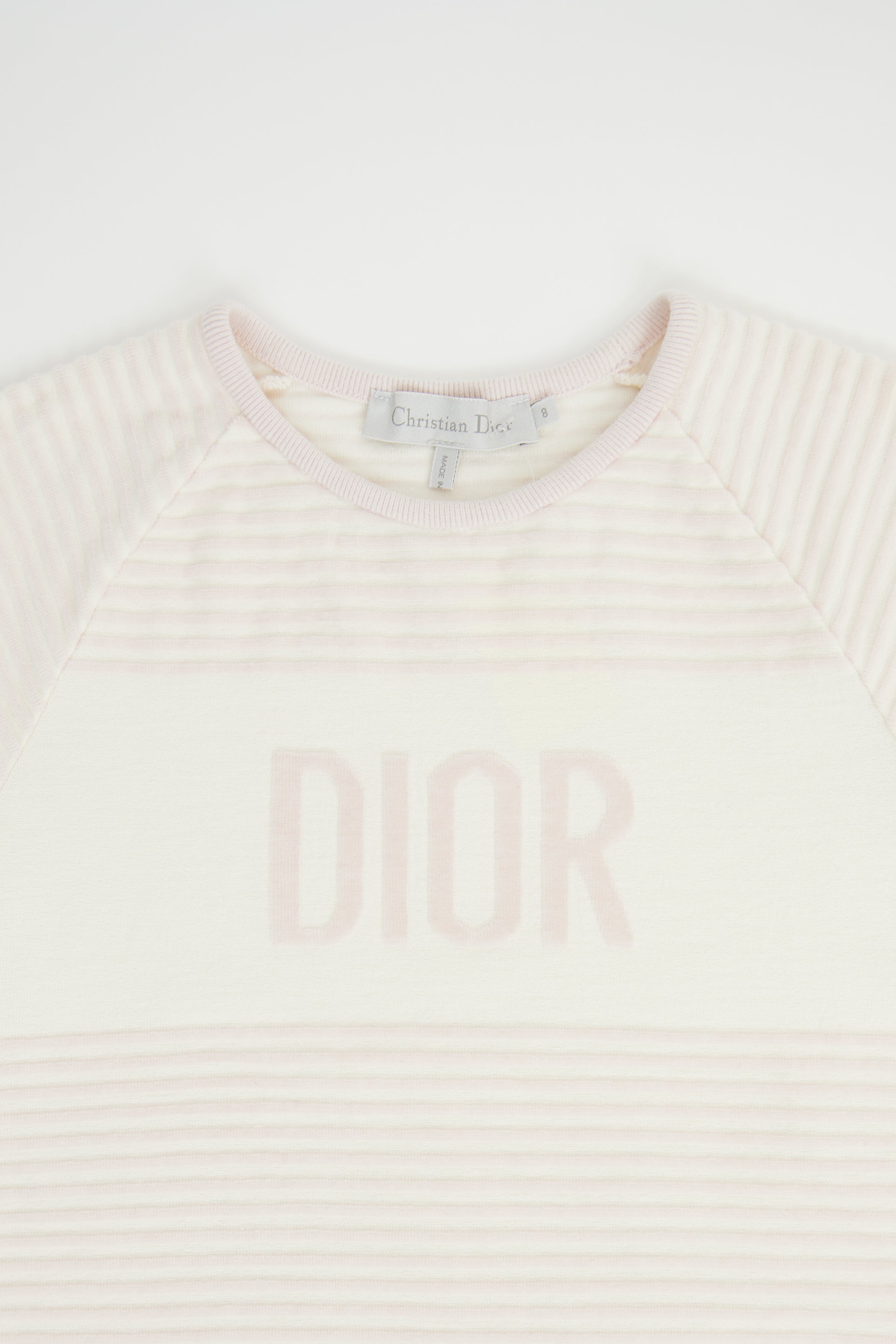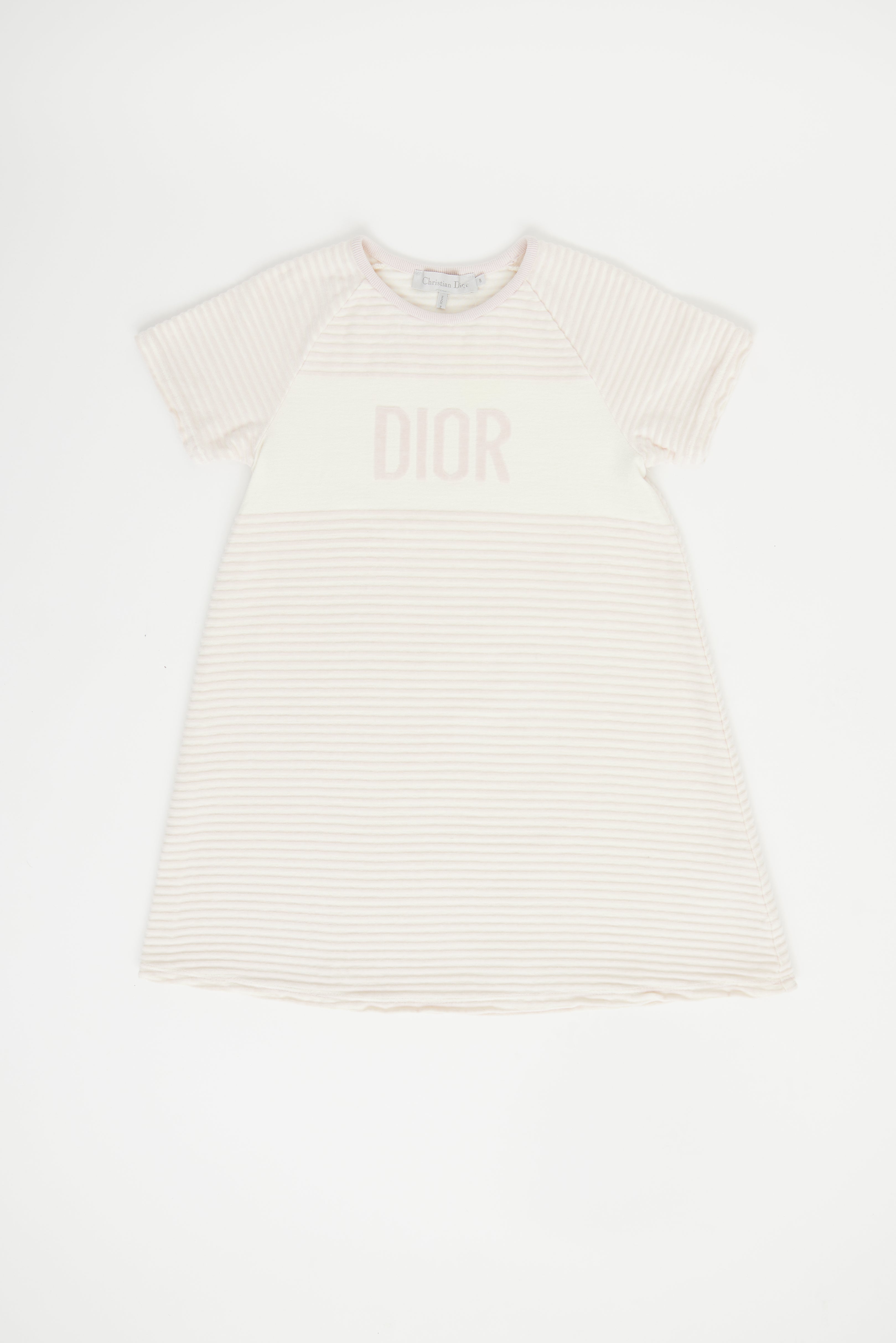 Pre-owned Dior pink and cream short sleeve velvet dress featuring round neckline, striping throughout, logo text across chest and flare fit.