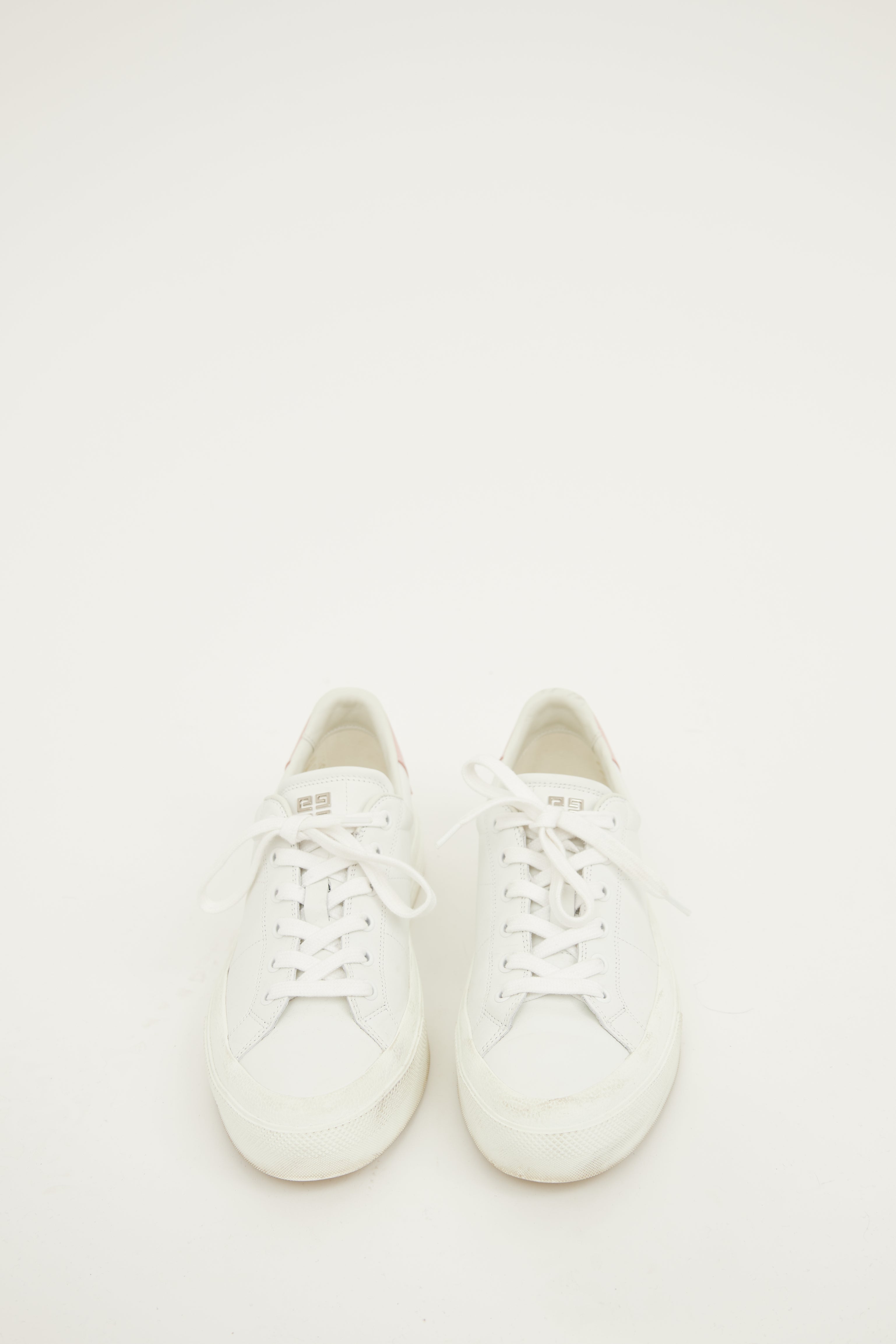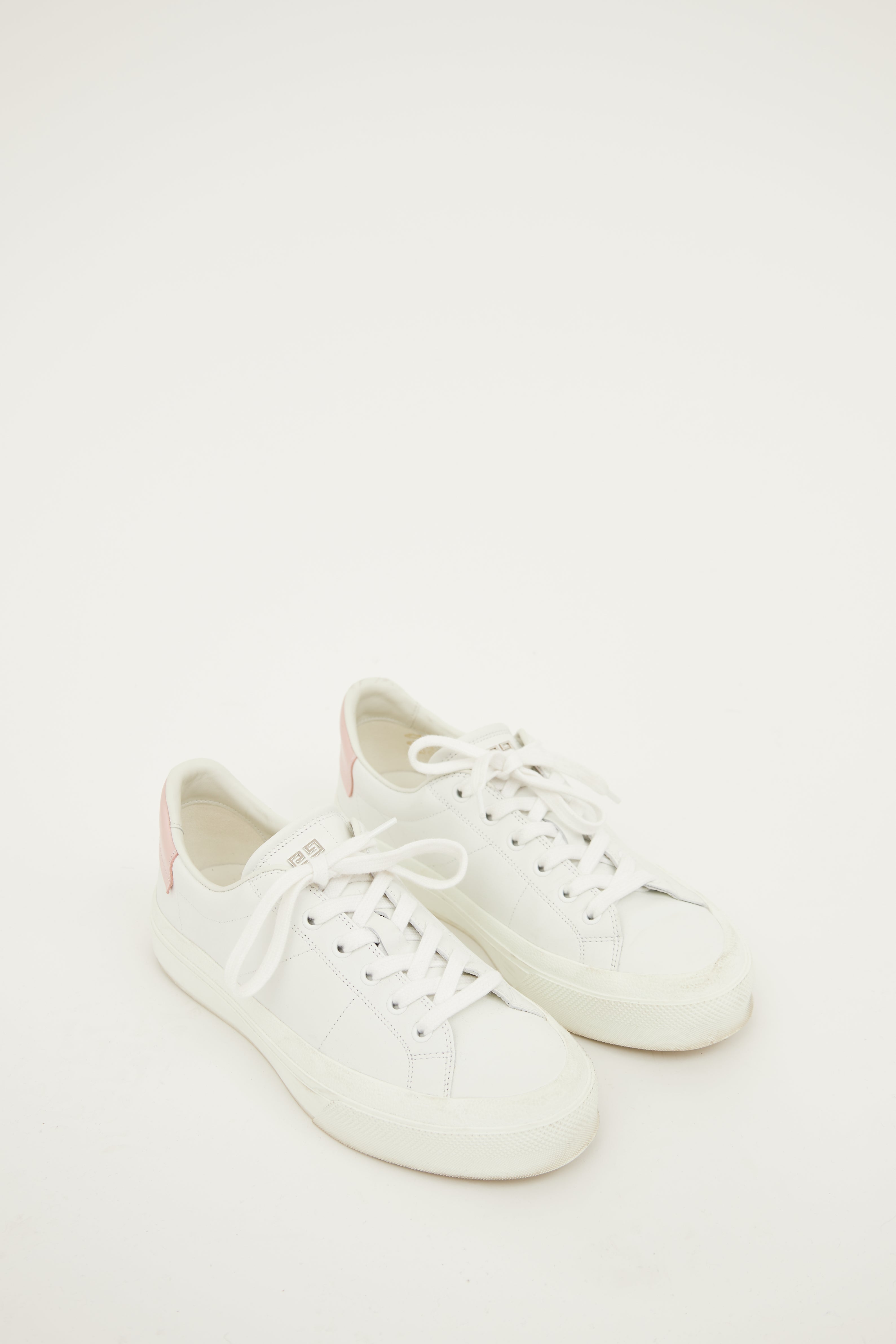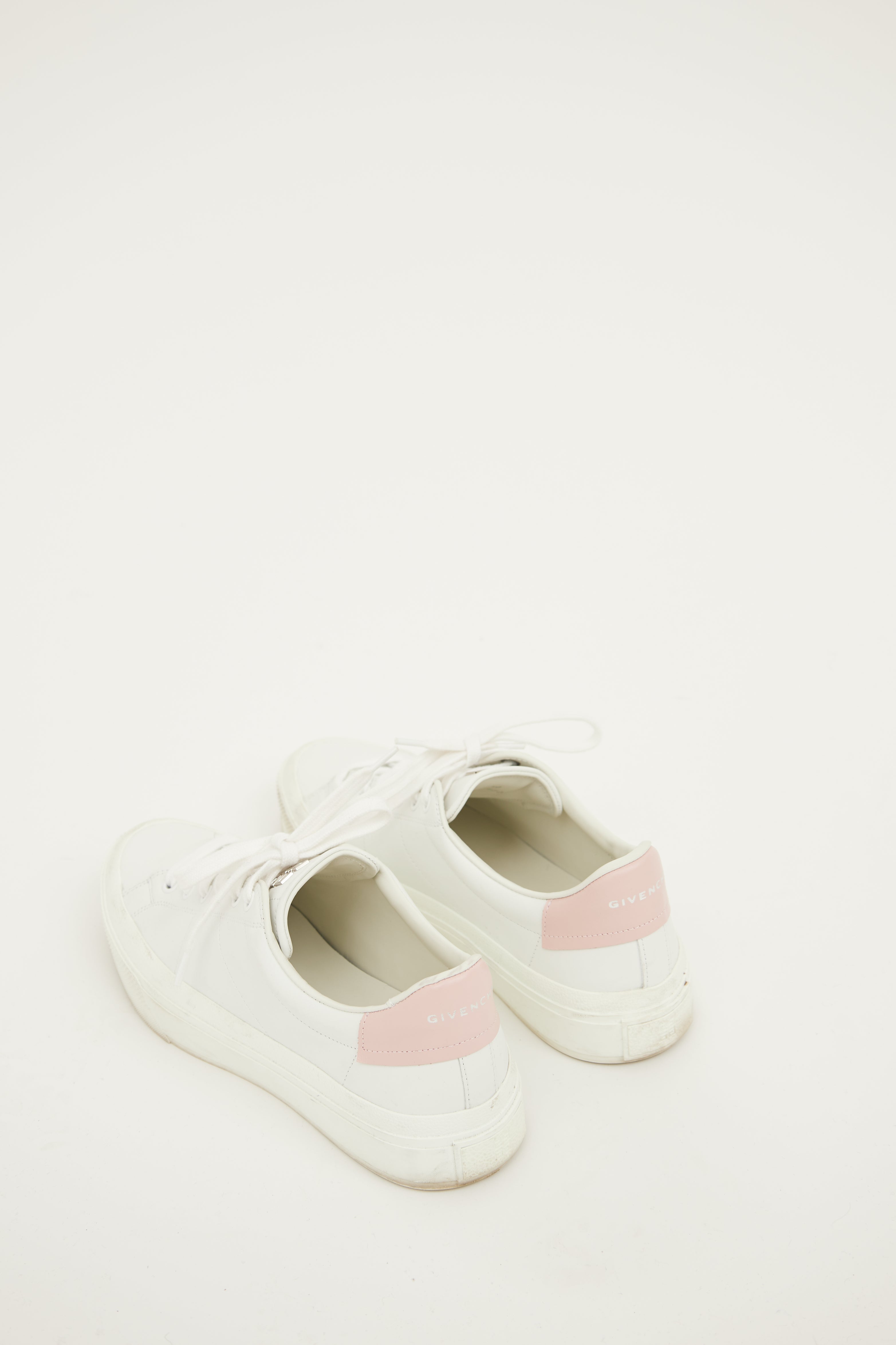Pre-owned Givenchy white and pink City Sport sneakers featuring round toe, lace up, pink panel counter with silver tone logo text, logo plaque on tongue, platform midsole with webbed detail and leather outsole.