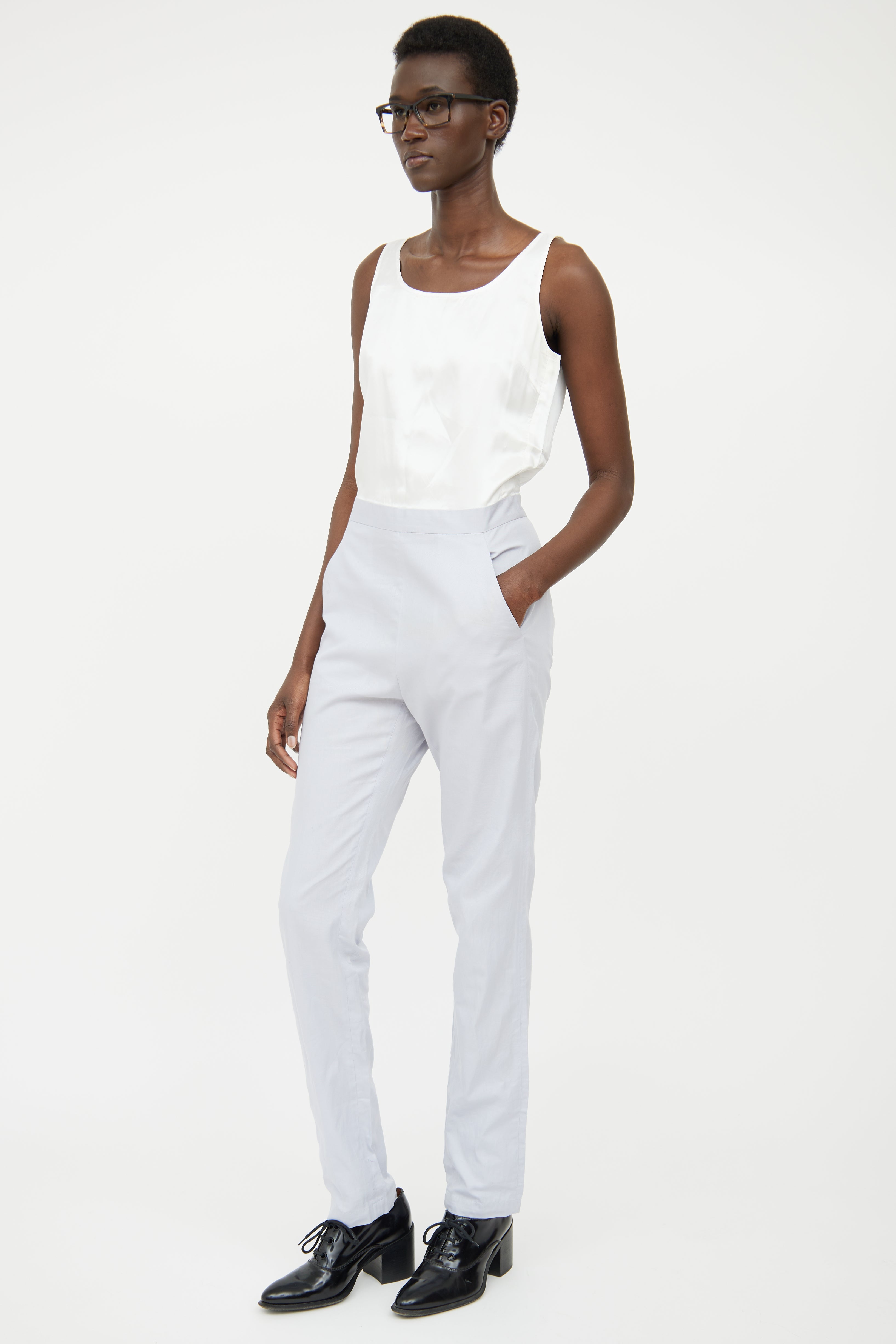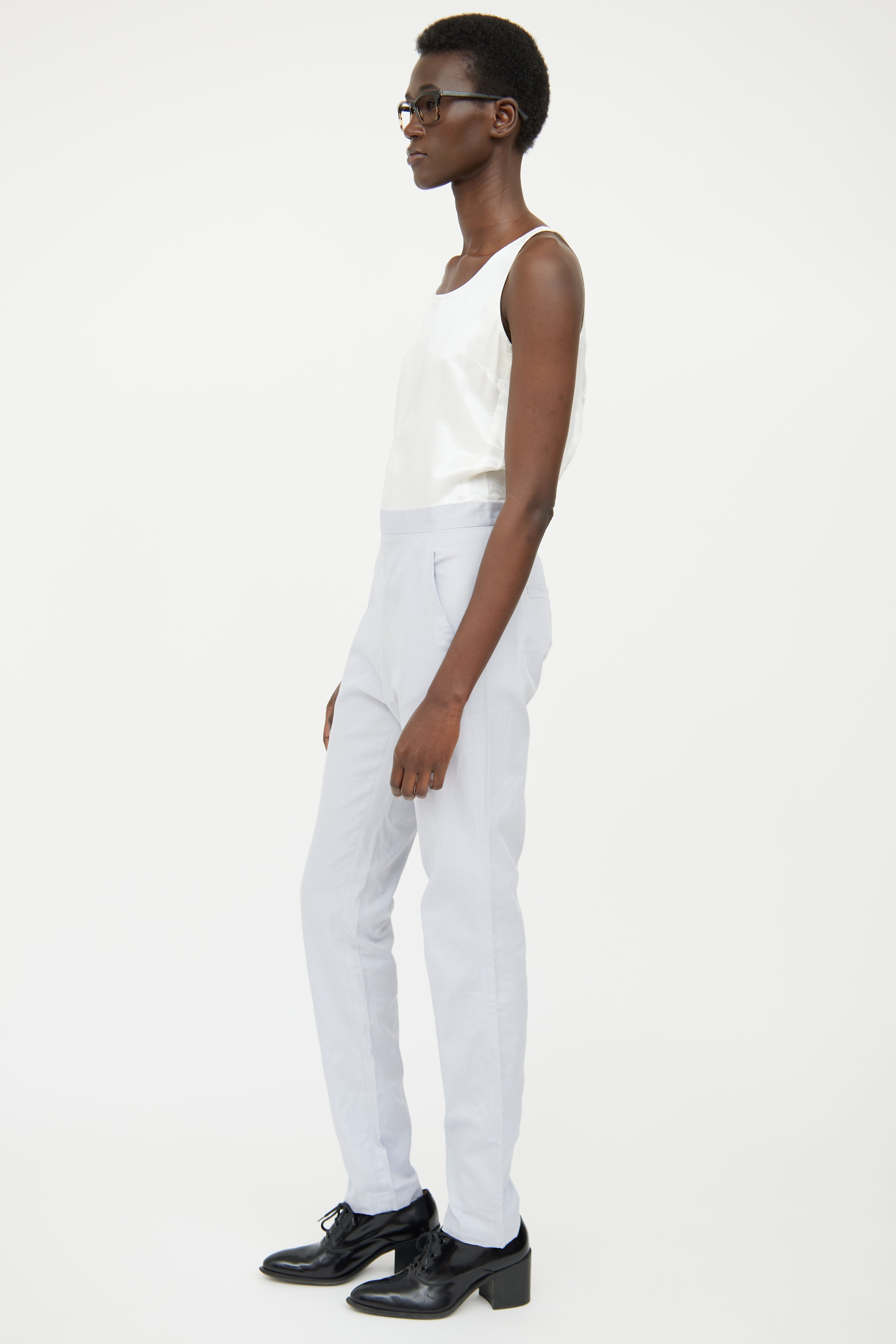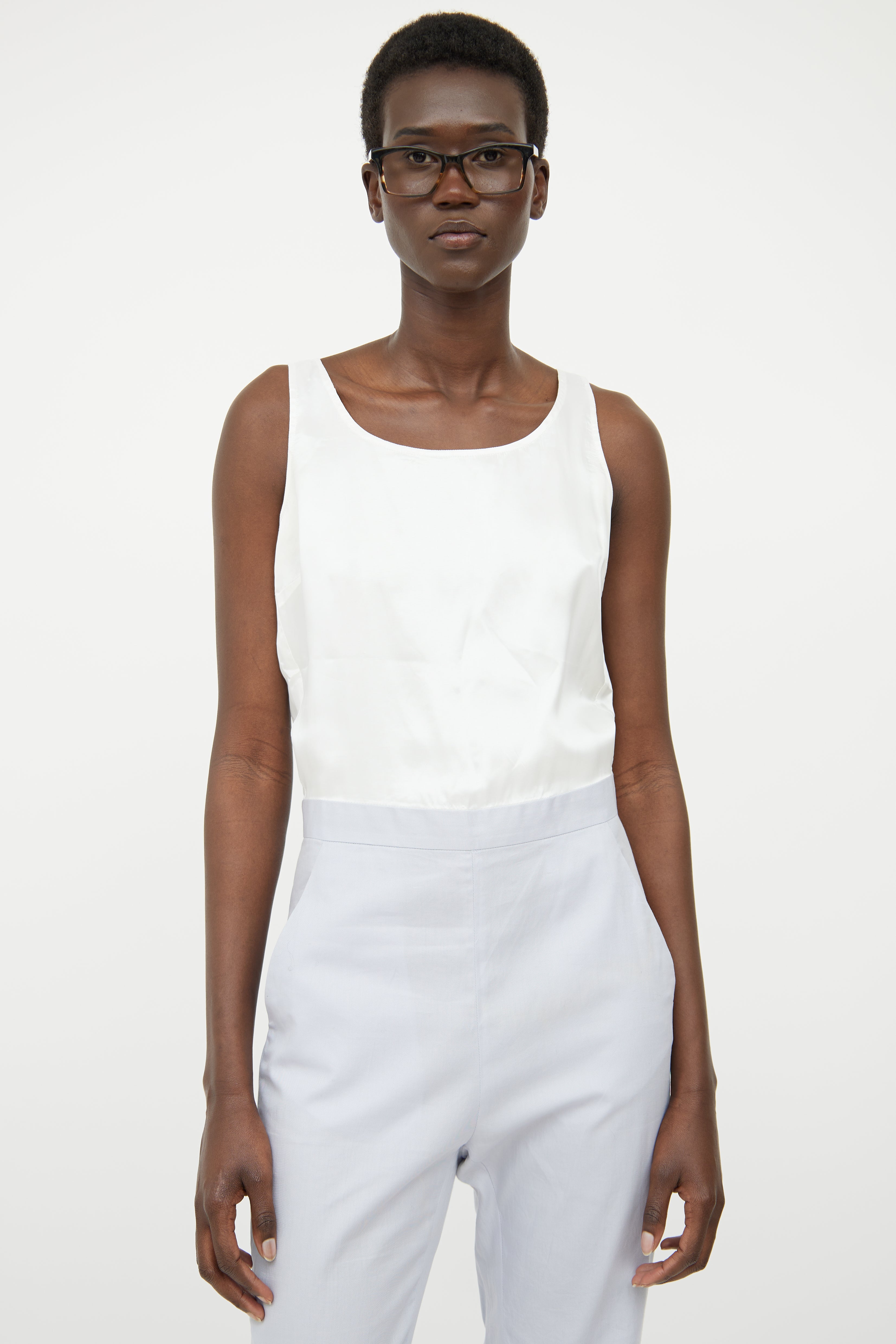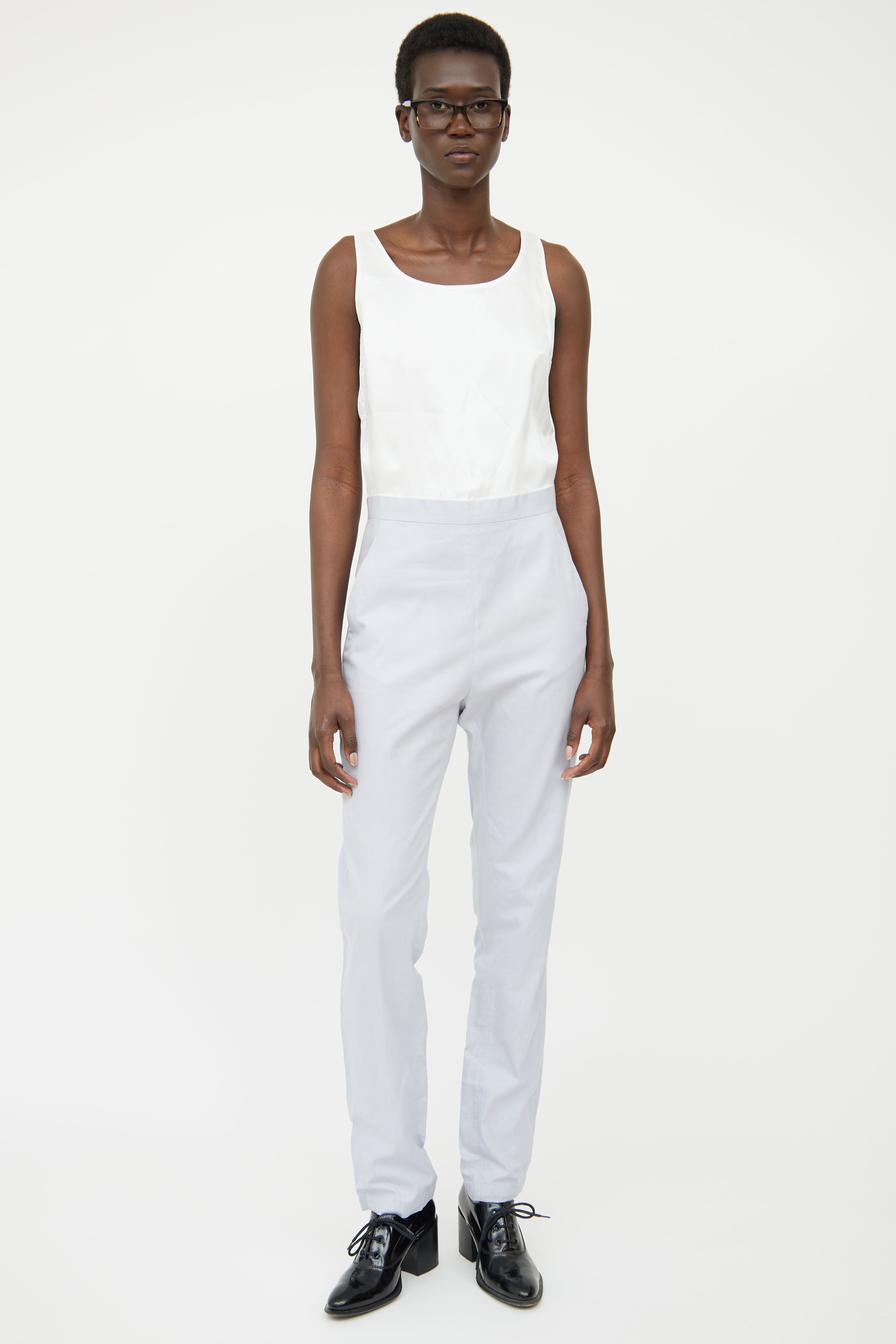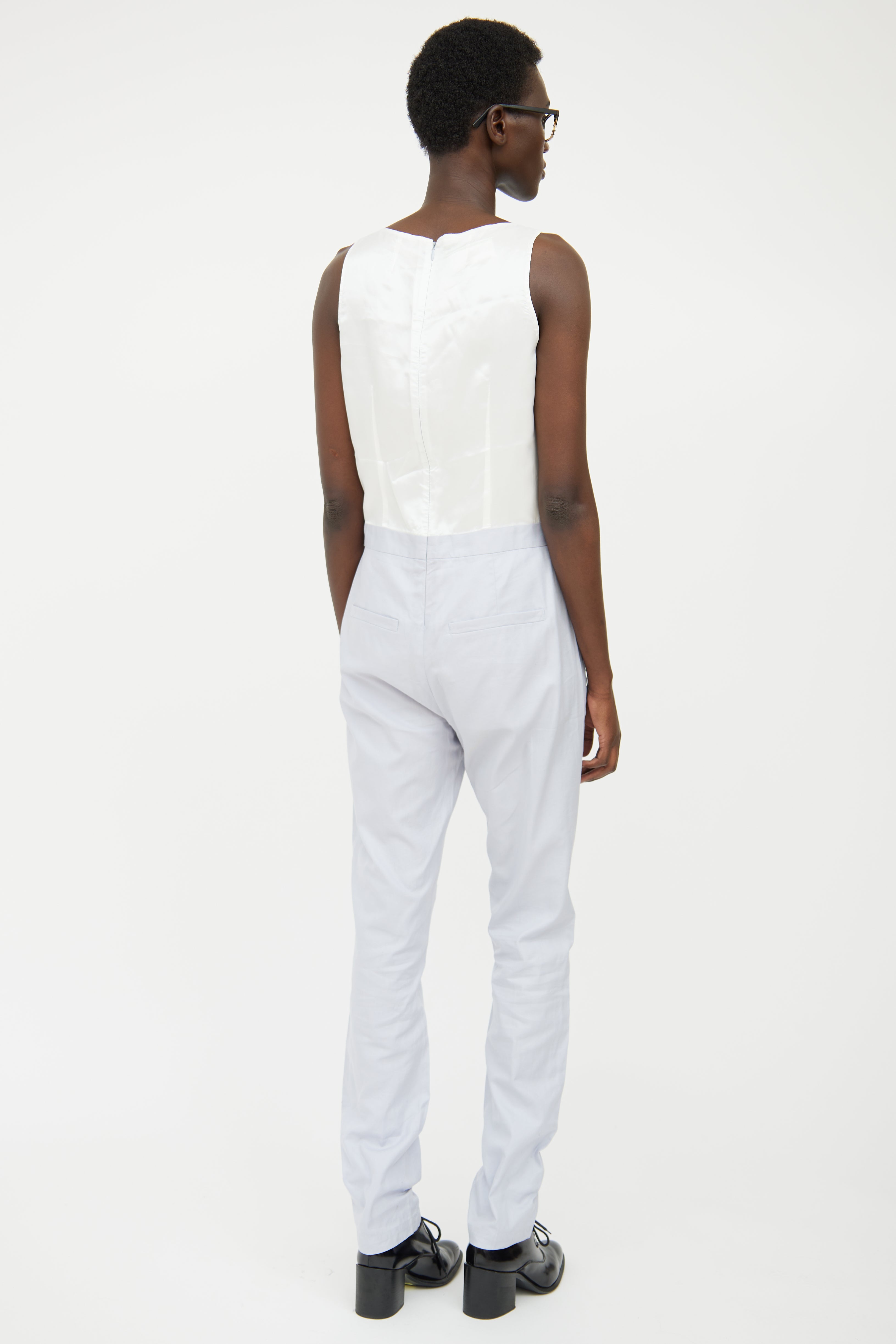 Pre-owned MM6 Maison Margiela white and blue sleeveless jumpsuit featuring round neckline, dual slip pockets on hip, dual stitched slip pockets on back and zip entry back. Clipped on model.