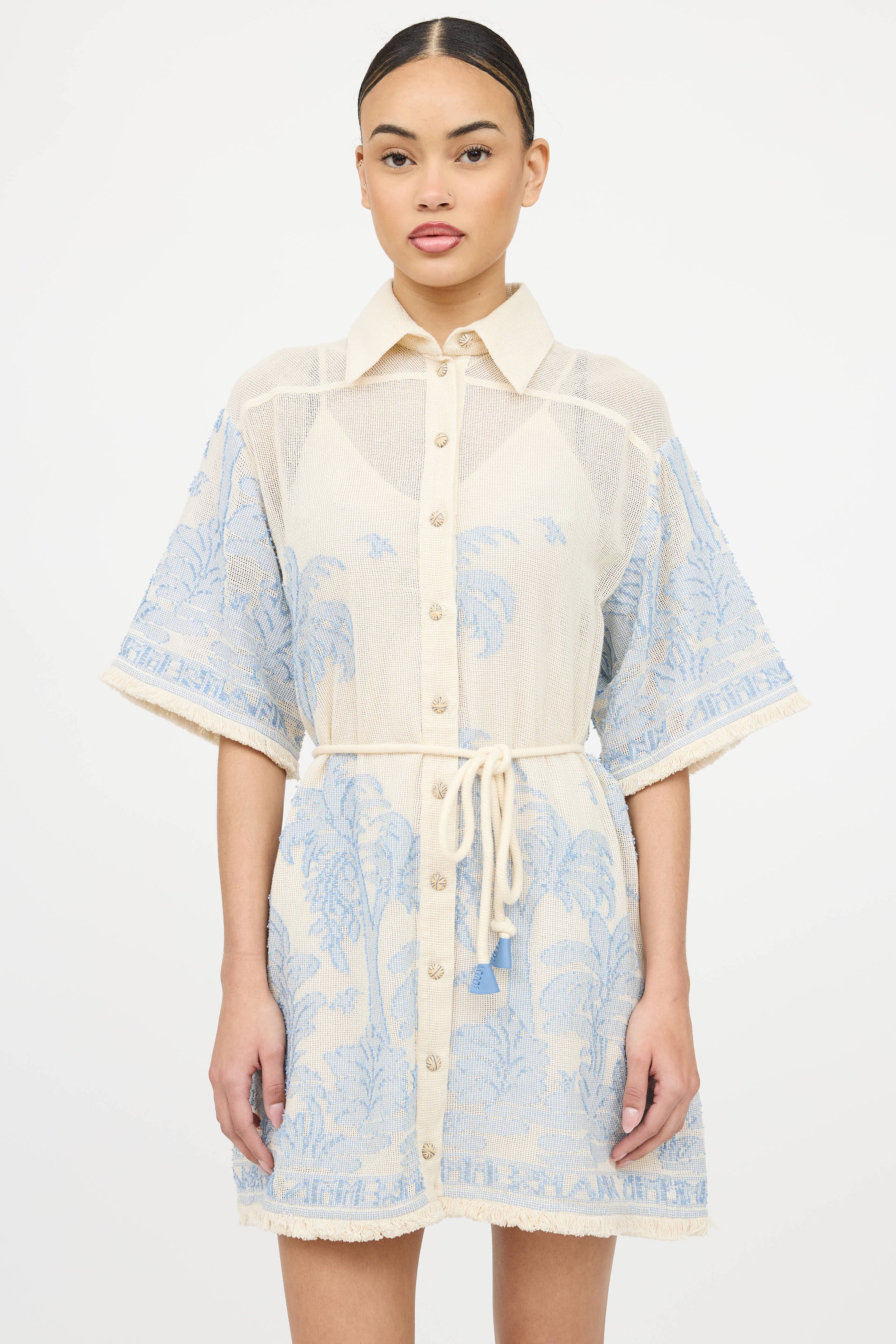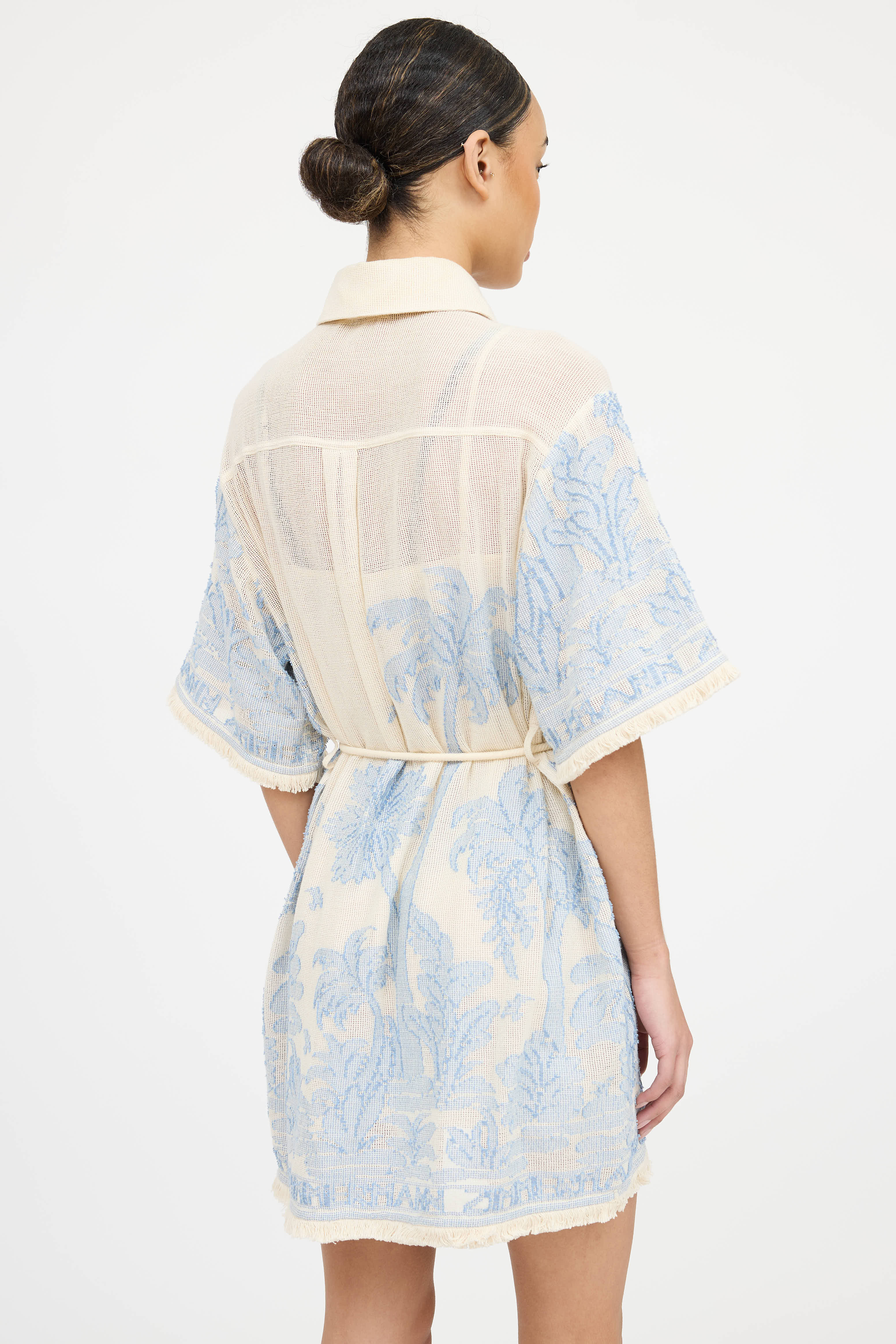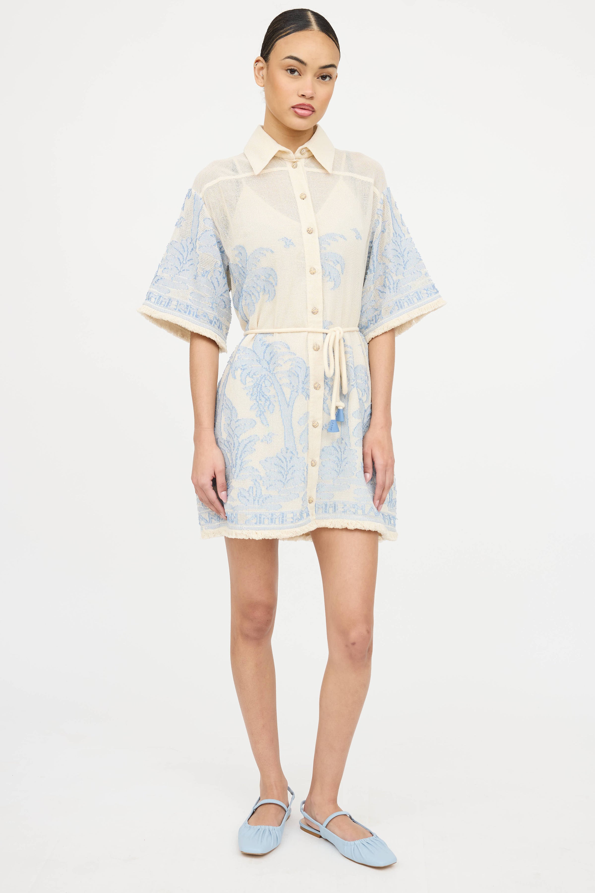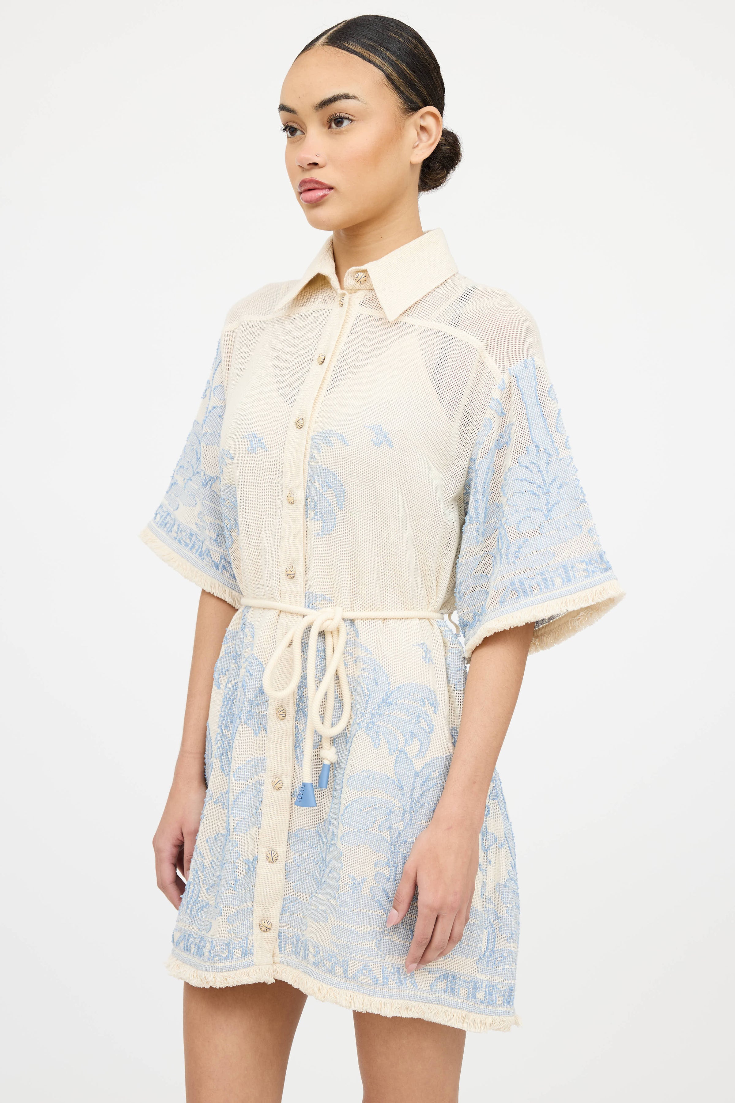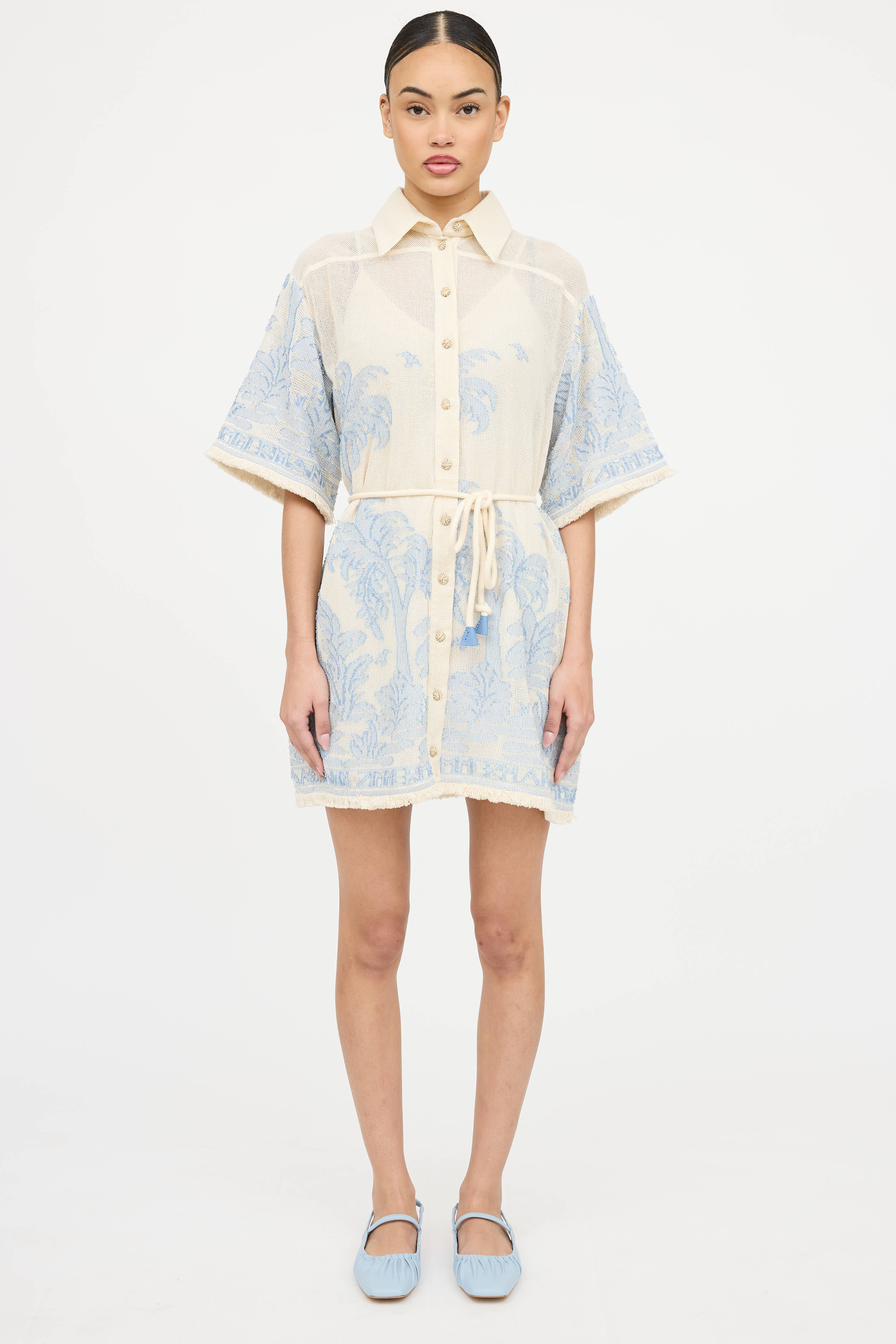 Pre-owned Zimmermann beige dress featuring a blue woven floral pattern throughout, pointed collar, short sleeves, adjustable knotted belt at waist, fringe hem, and button up closure. Includes matching slip.