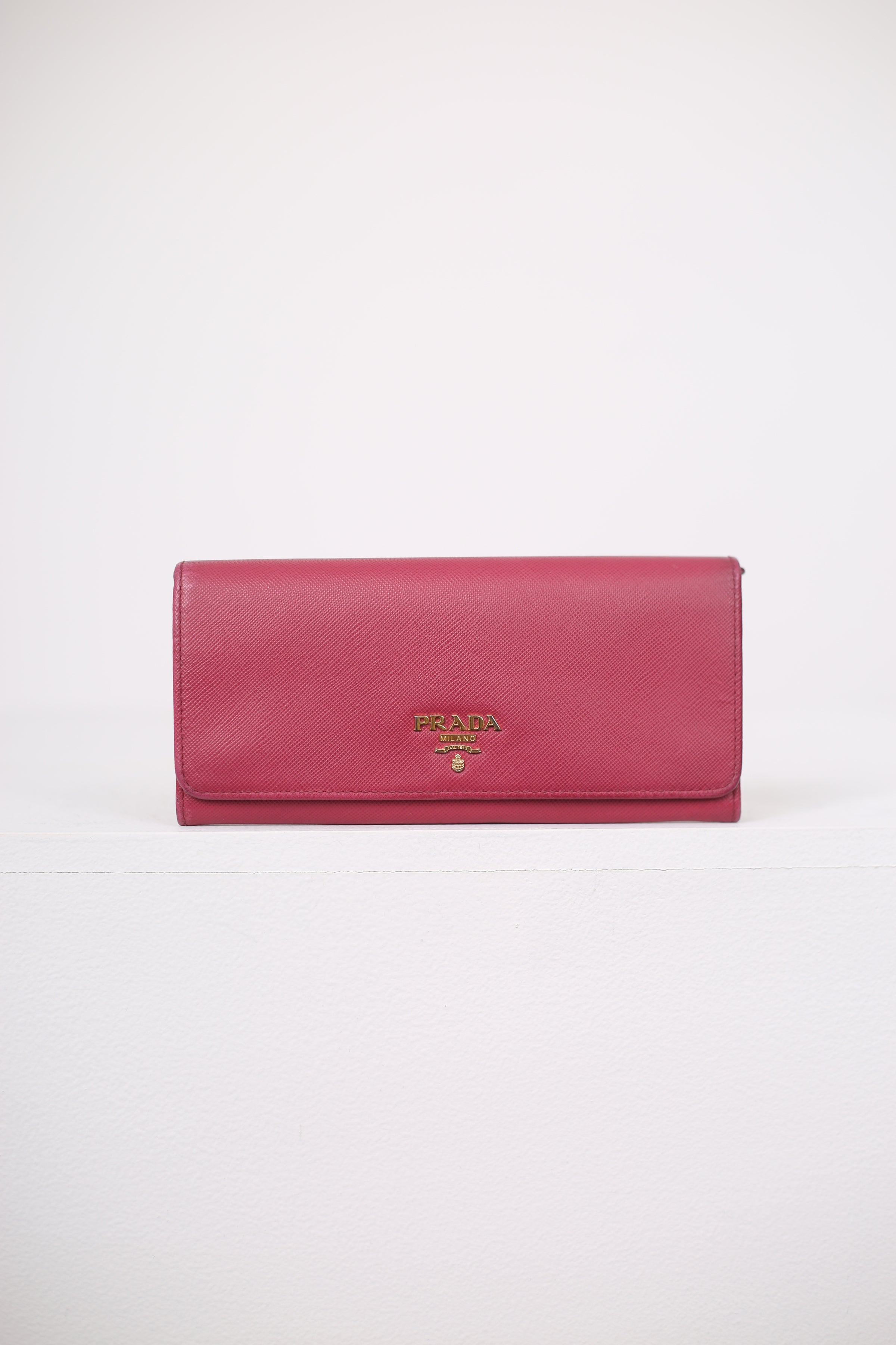 Prada 'Saffiano Continental' wallet featuring gold tone hardware and logo in front, flap top with double snap closure, zippered pocket in rear, three bill compartments, ten card holders, two large pockets and zippered change pocket.