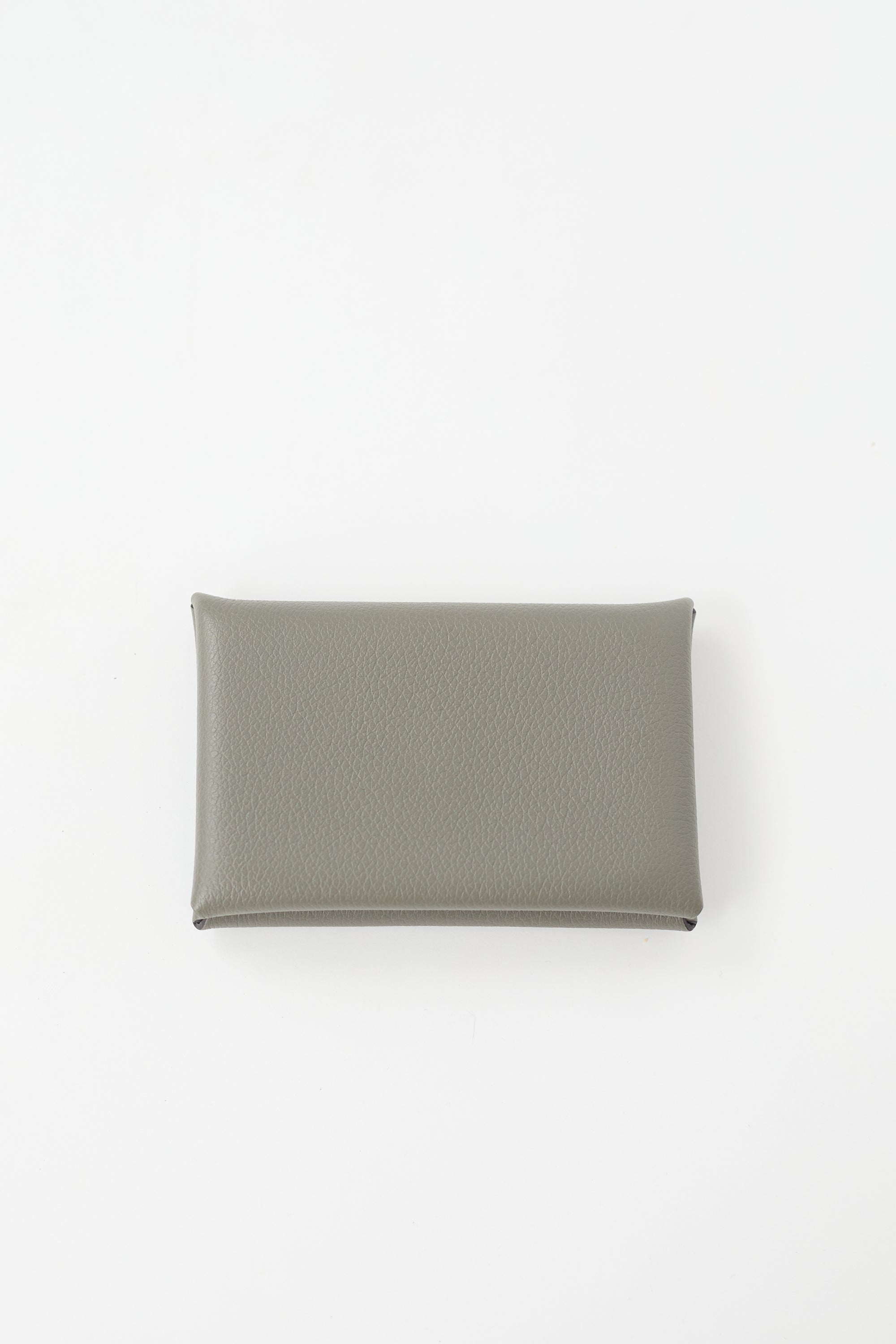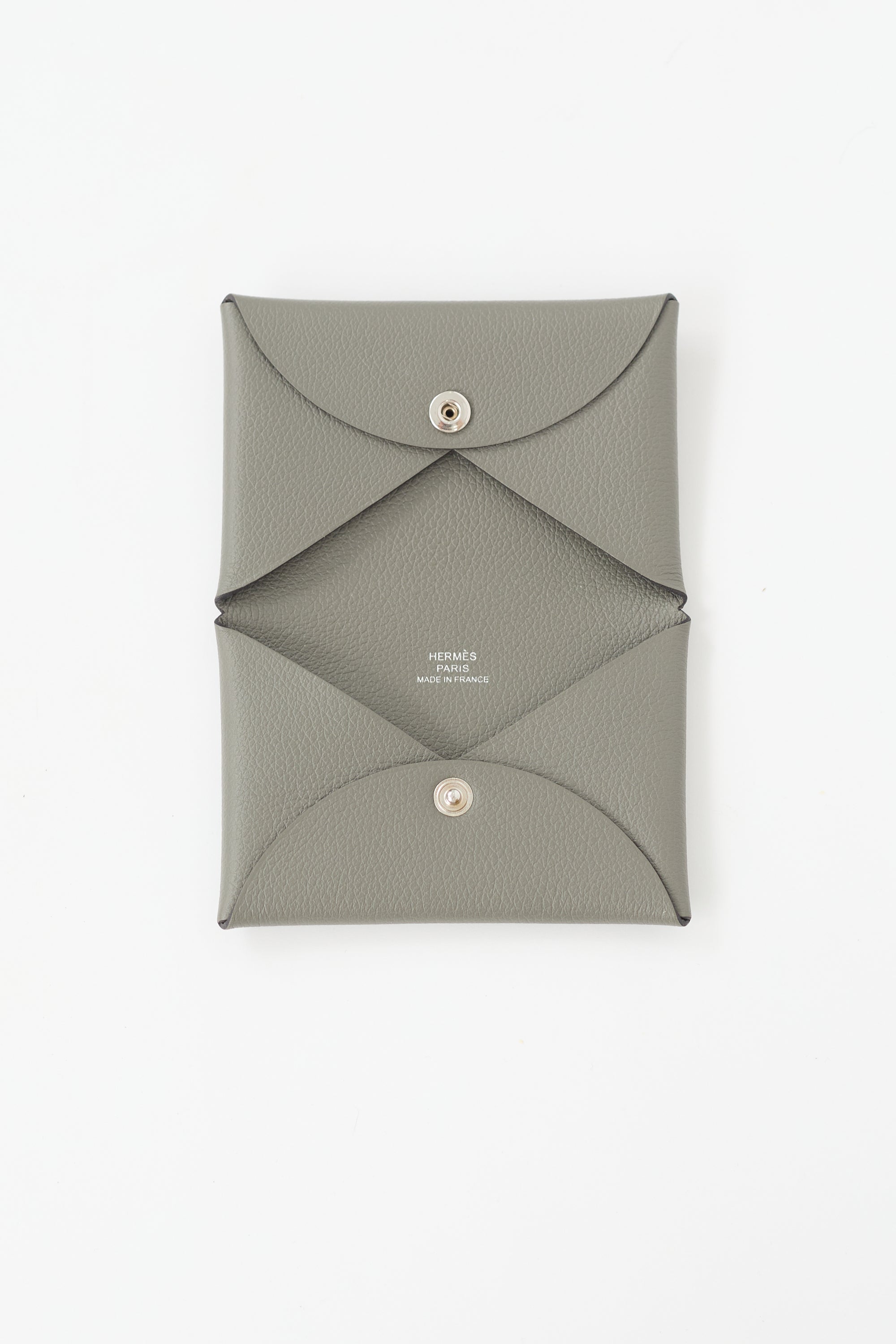 Pre-owned Hermès grey Mysore goatskin leather Calvi card holder featuring snap button closure, two slip pockets inside, and silver stamped logo. Includes original box.