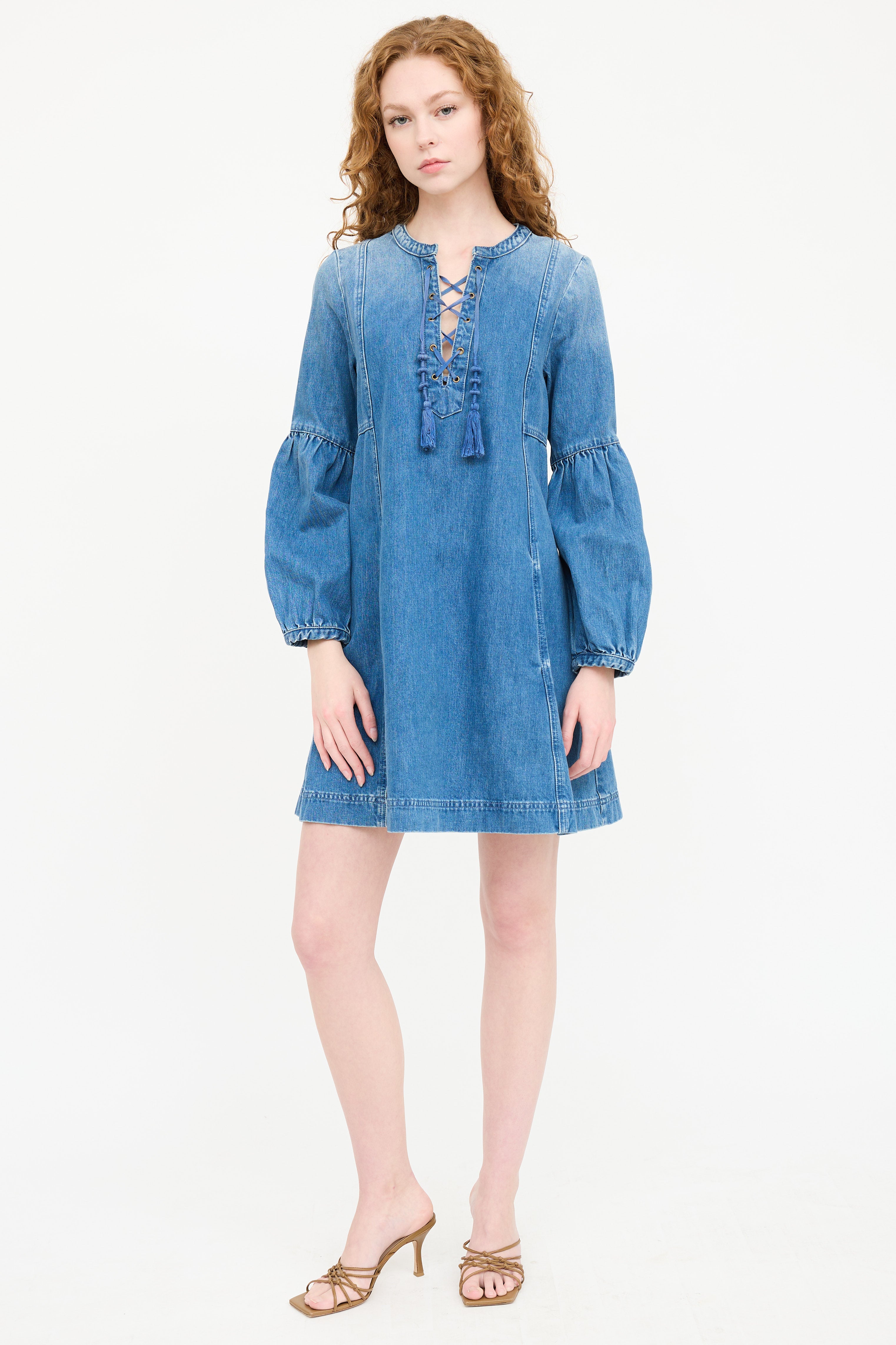 Pre-owned Ulla Johnson denim Deren light wash dress featuring a V-neckline with tie tassel detail, long sleeves, and two slip pockets at hip.