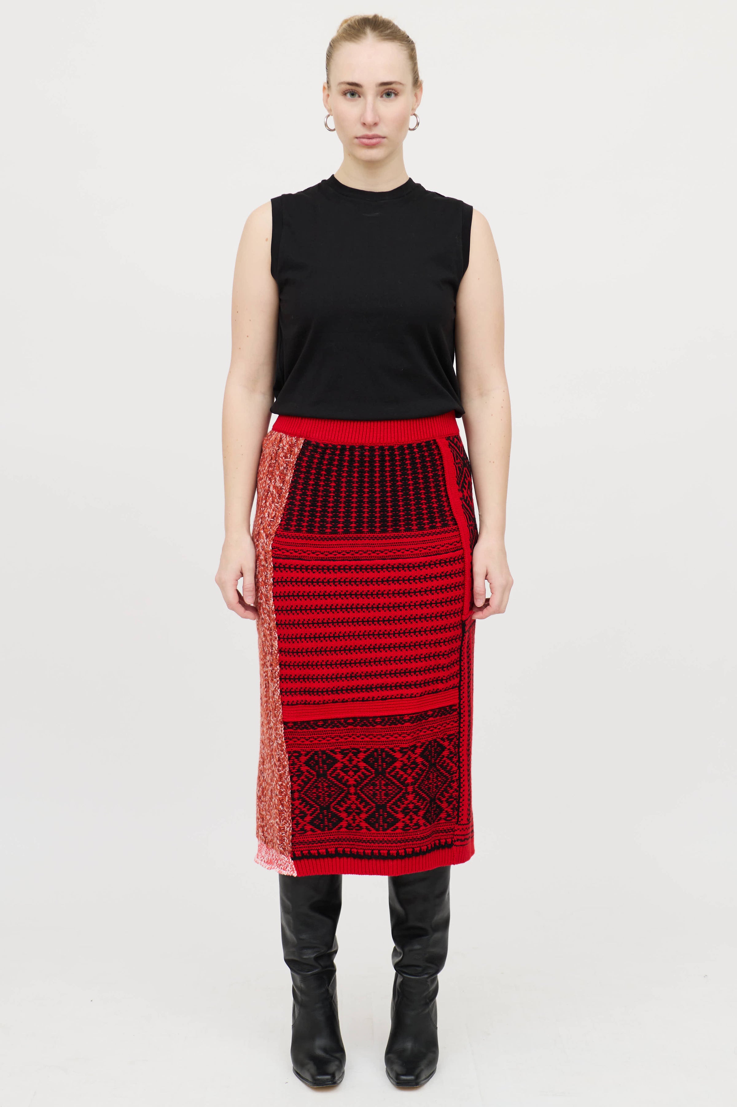 Pre-owned Burberry red and orange knit maxi skirt featuring ribbed trims and paneled knit with geometric pattern throughout.