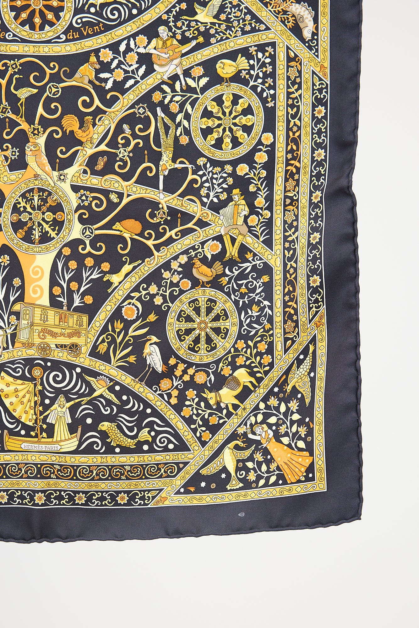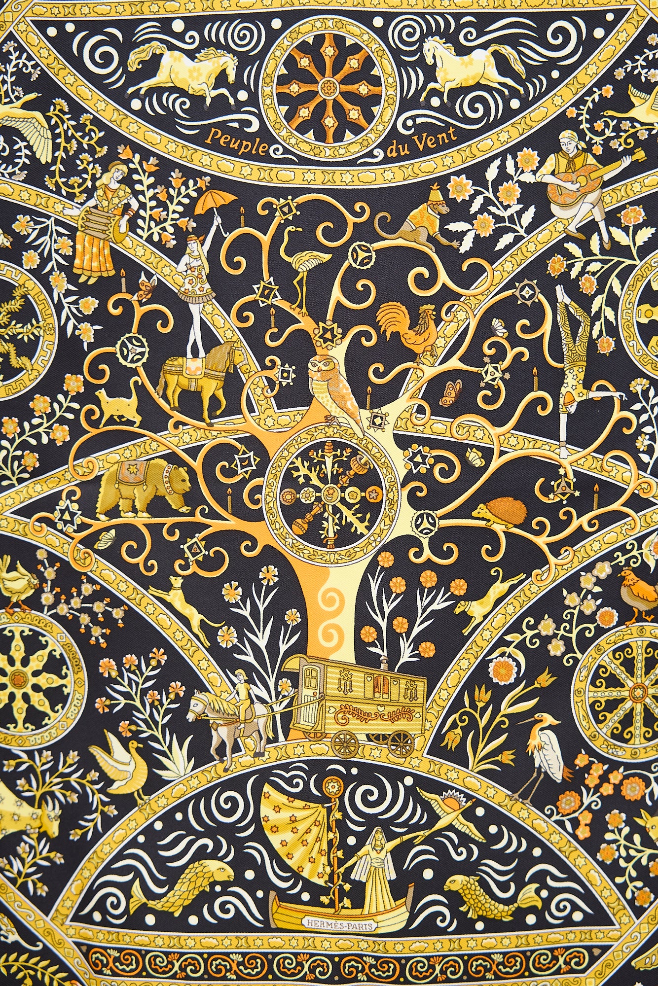 Pre-owned Hermès 2010 black, yellow, and orange silk 45 scarf featuring Peuple du Vent design by Christine Henry, mystical motif, and hand rolled edges.