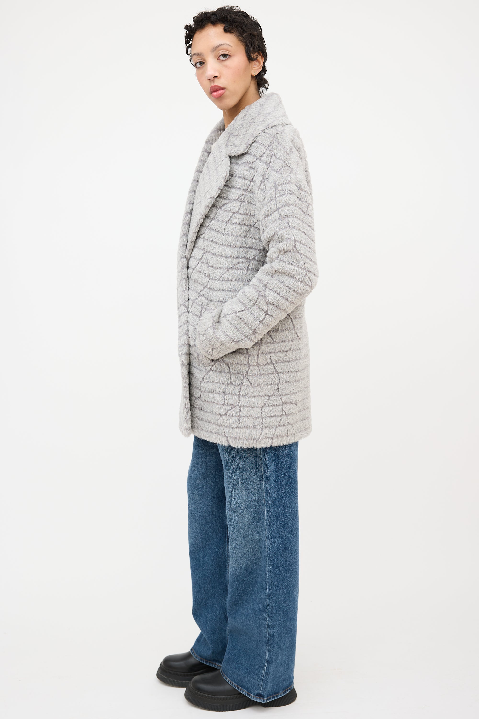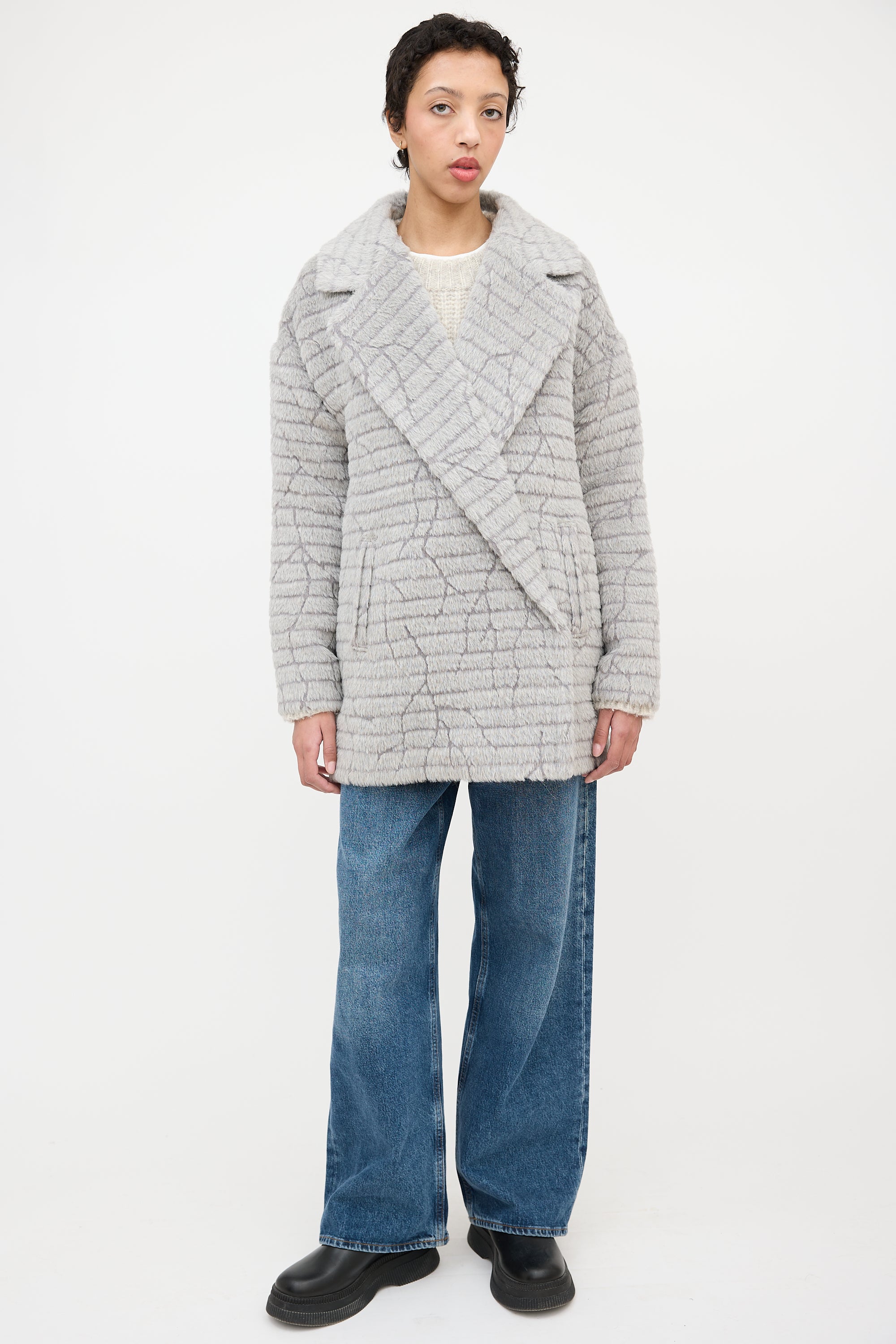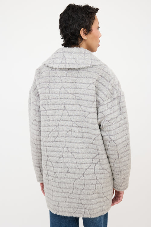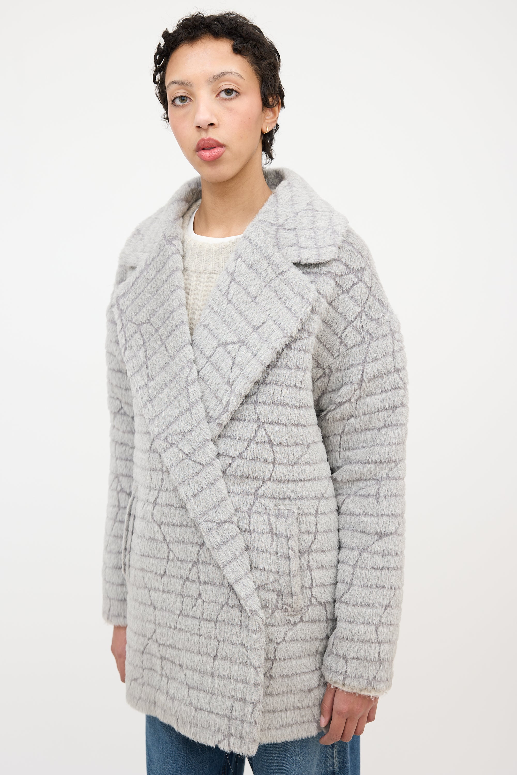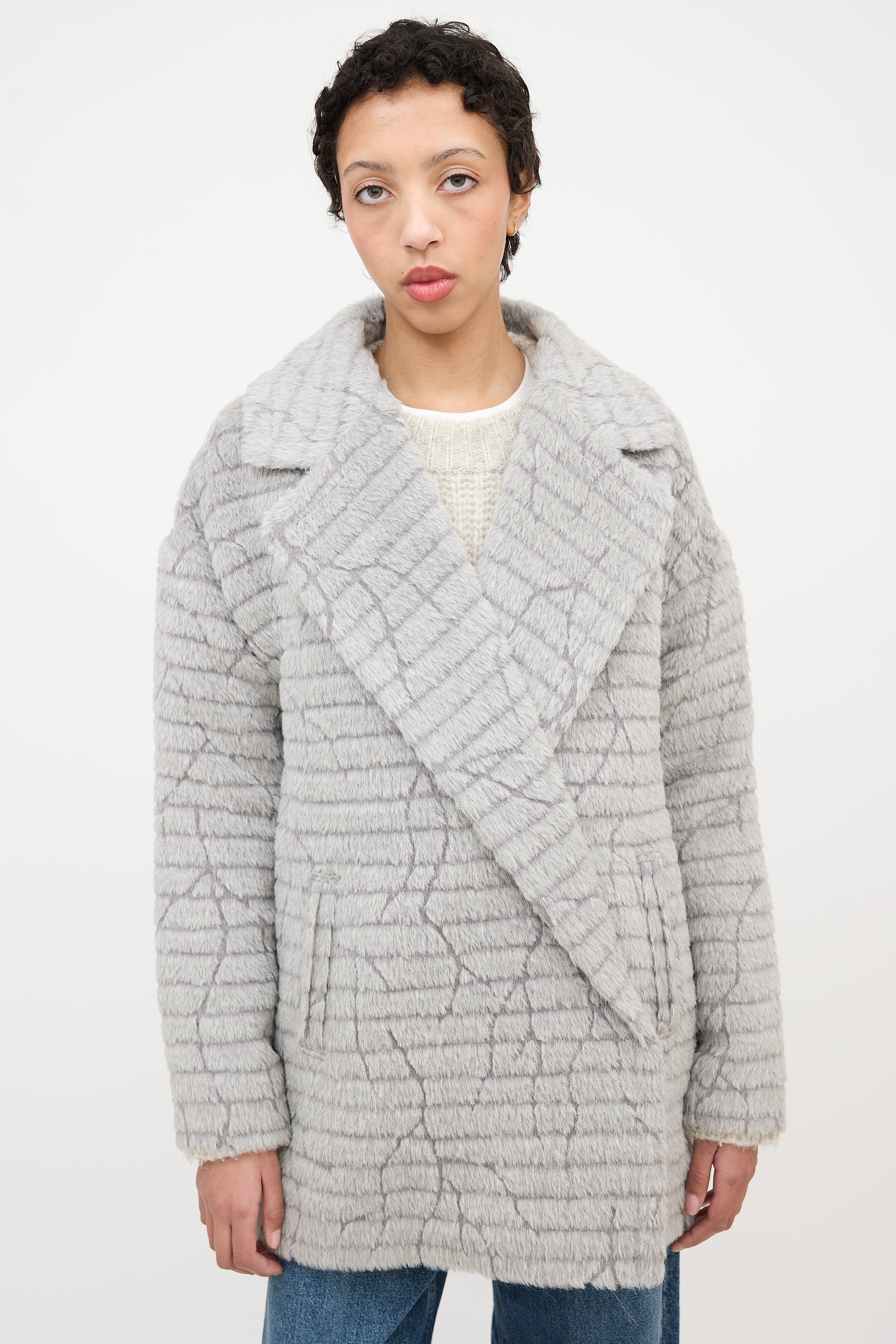 Pre-owned Sentaler grey textured alpaca wool blend mid length coat featuring wide notched collar, single button and concealed snap button front, and two front pockets. Lined. Comes with extra button.