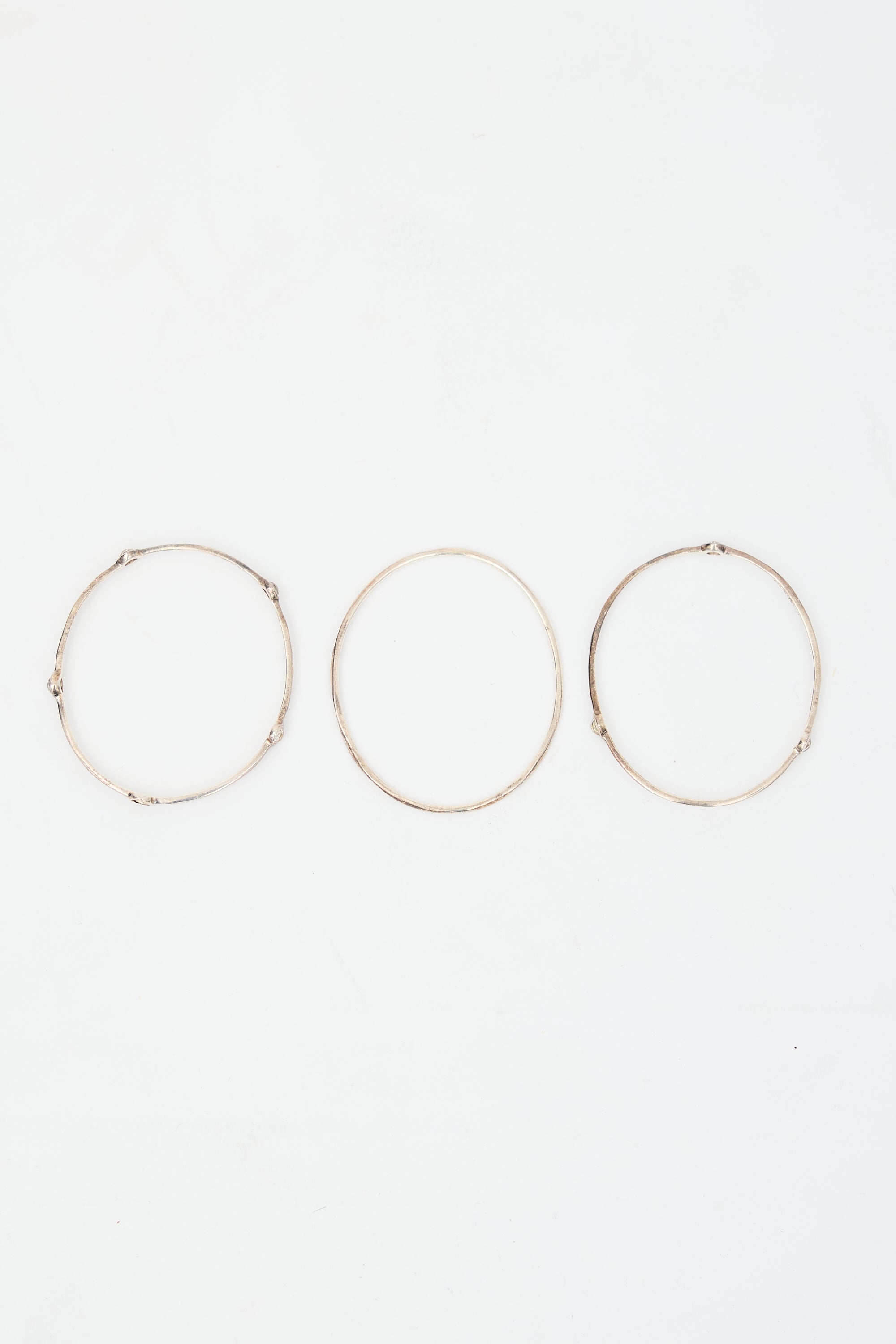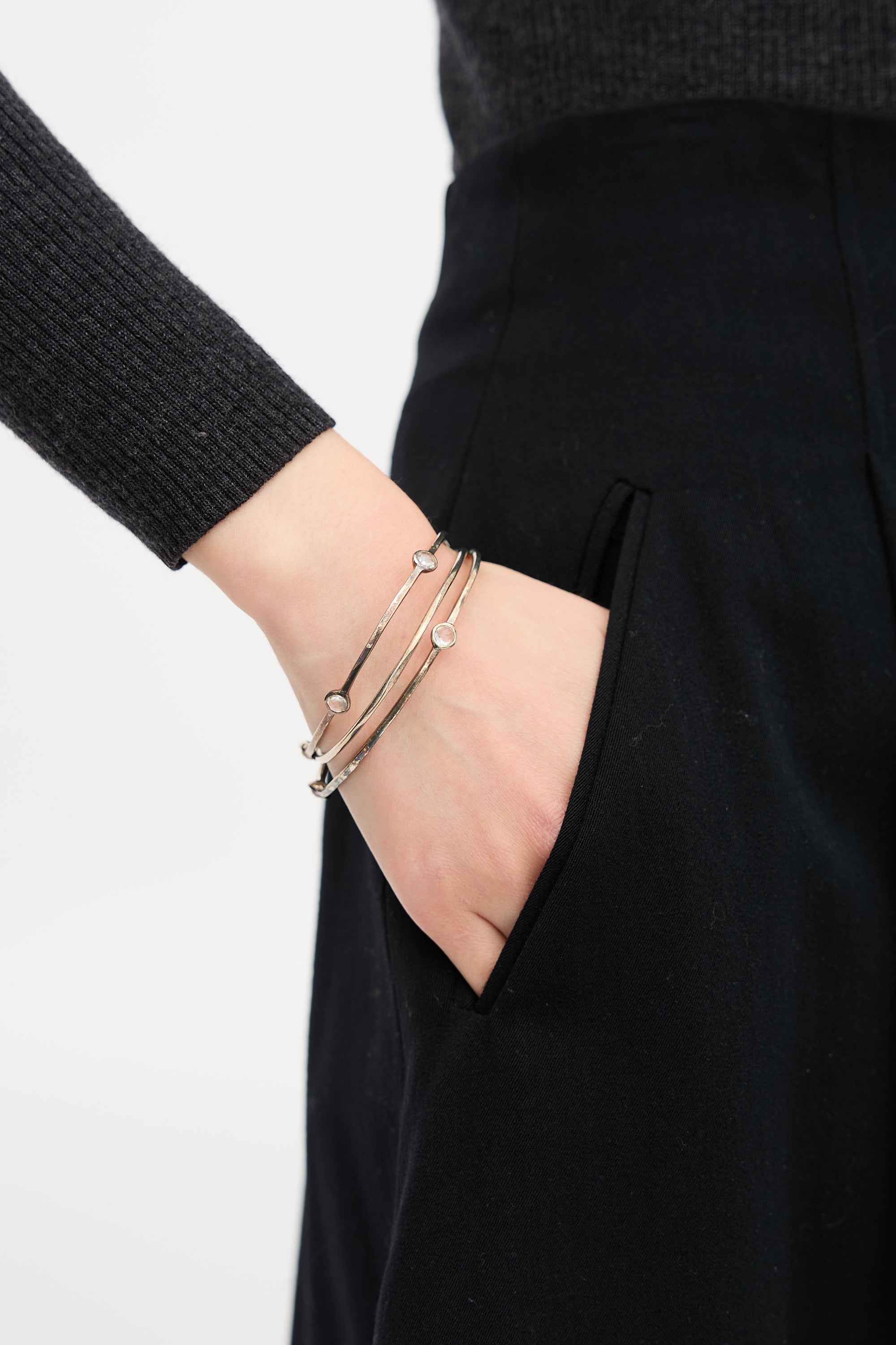 Pre-owned Ippolita 925 sterling silver station bangle set featuring one solid bangle, one bangle with three inset crystals, and one bangle with five inset crystals. Comes with original dust bag.