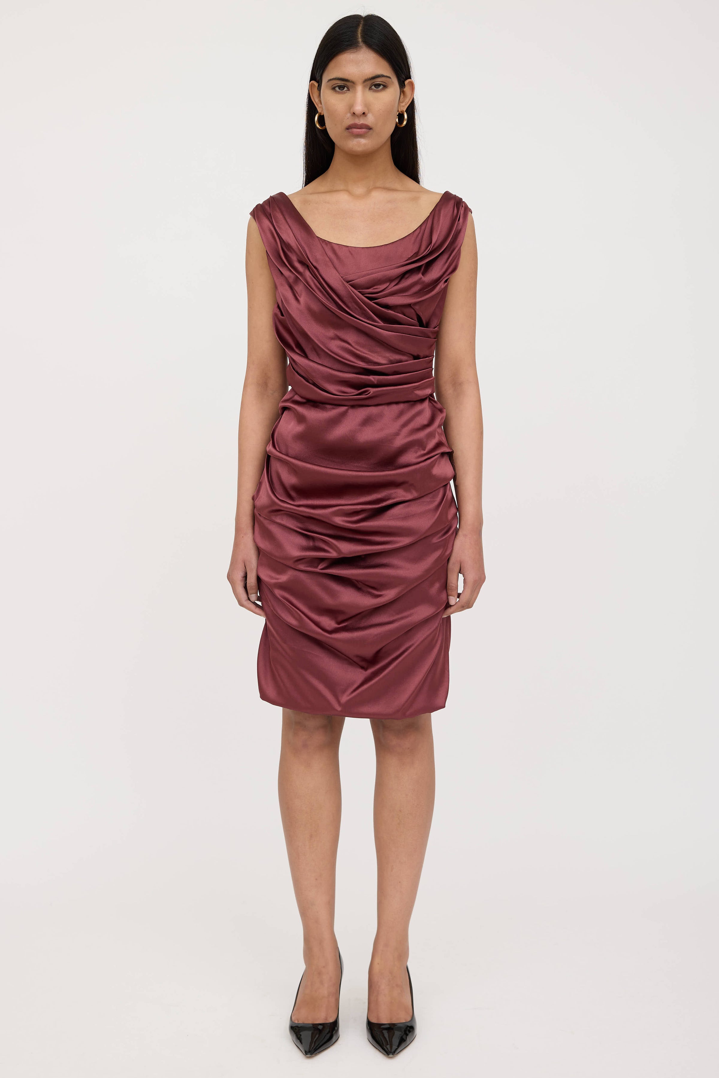 Pre-owned Dolce & Gabbana purple satin dress featuring a scoop neckline, ruched pleated detailing throughout, sleeveless styling, and zip closure at back. Lined.