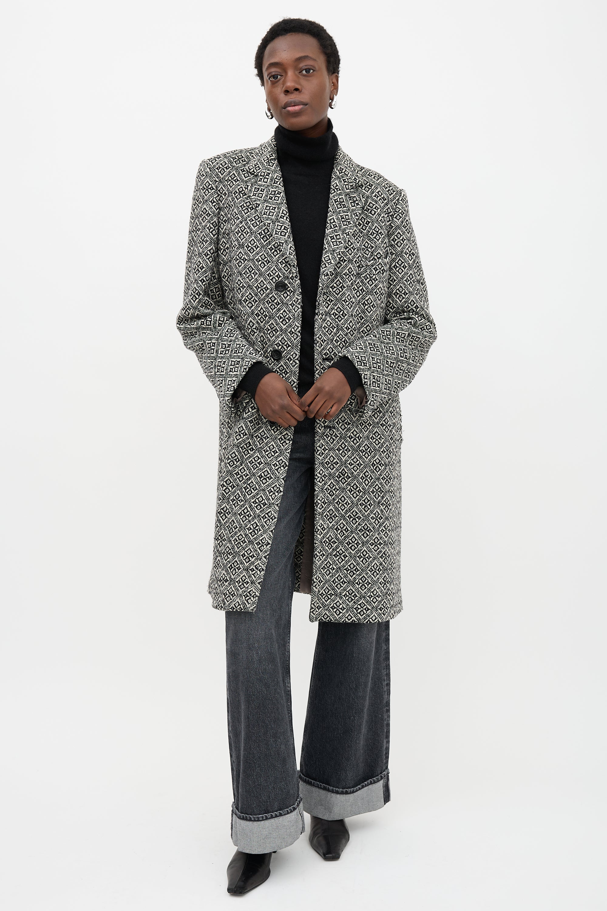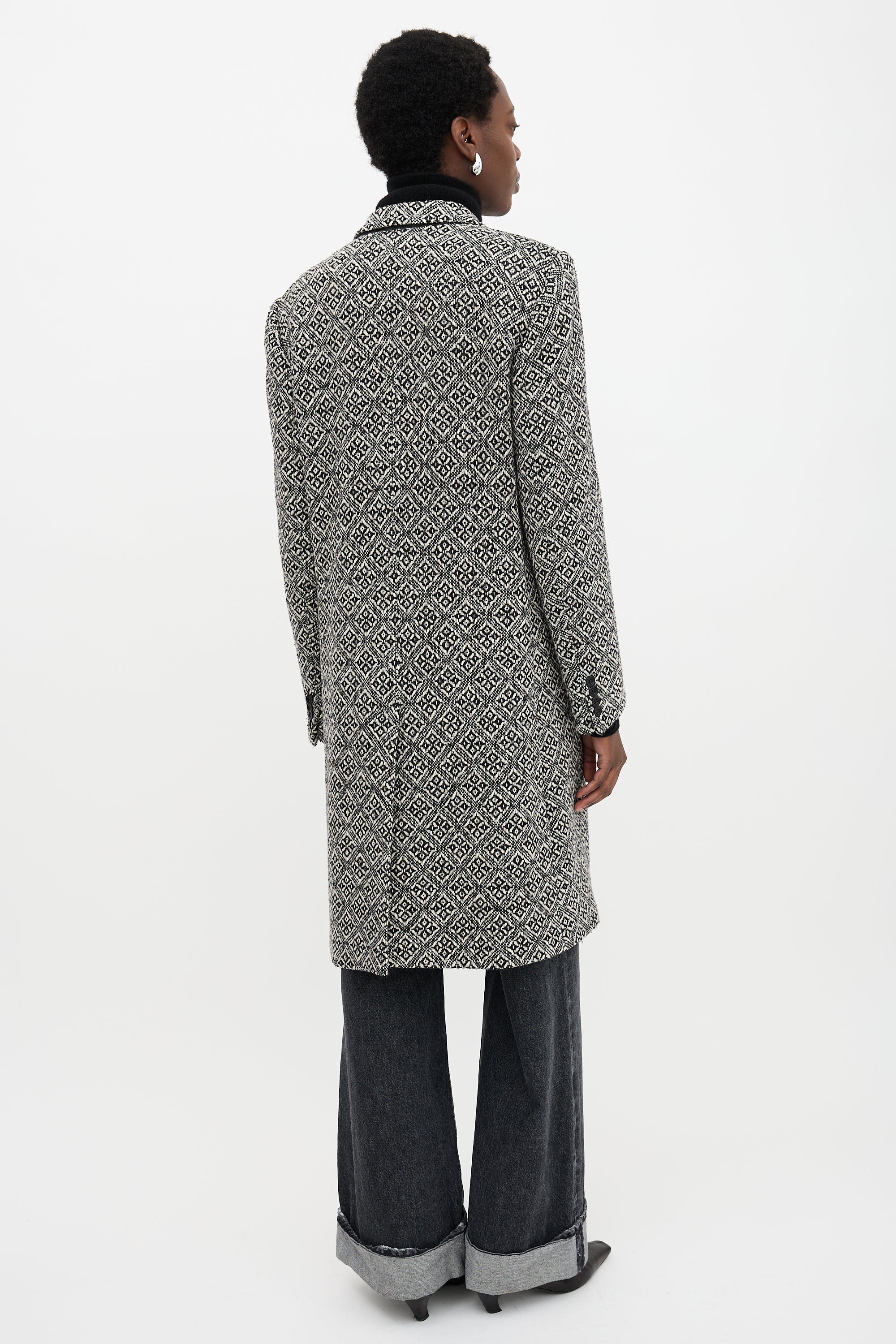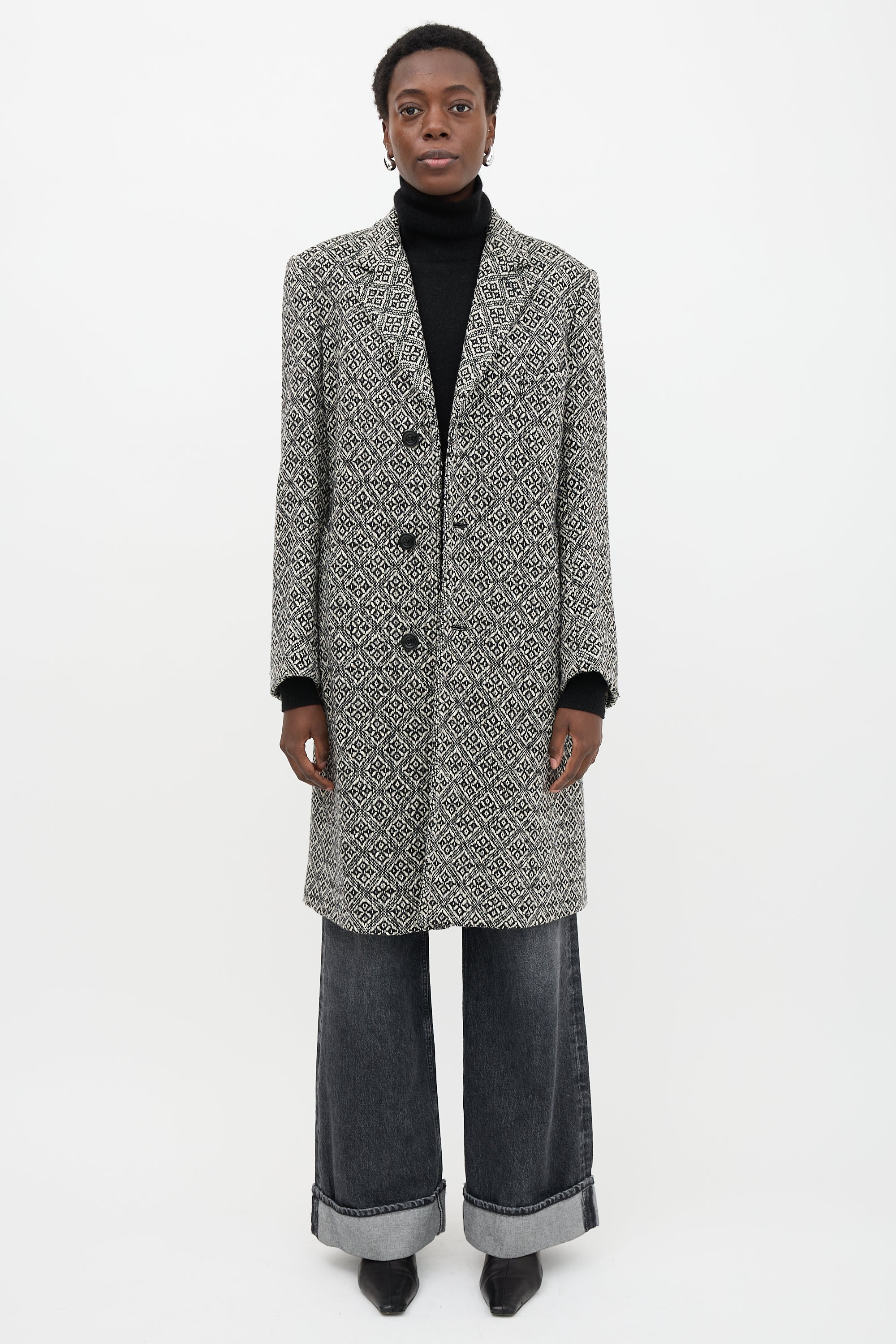 Pre-owned Dries Van Noten black and white coat featuring woven geometric pattern, notched lapel, button up front, three front pockets, back vent, padded shoulders, and buttoned cuffs. Lined.