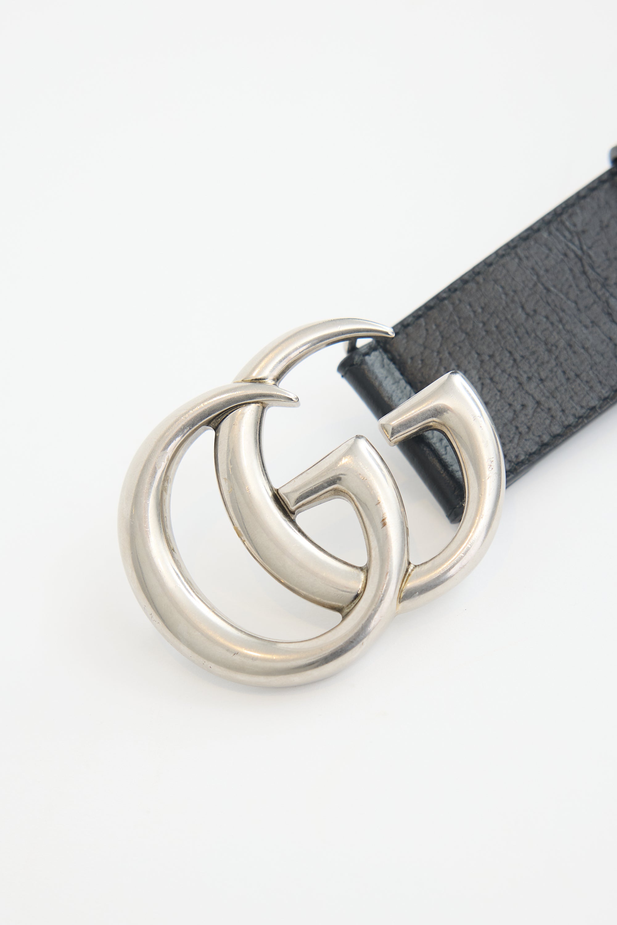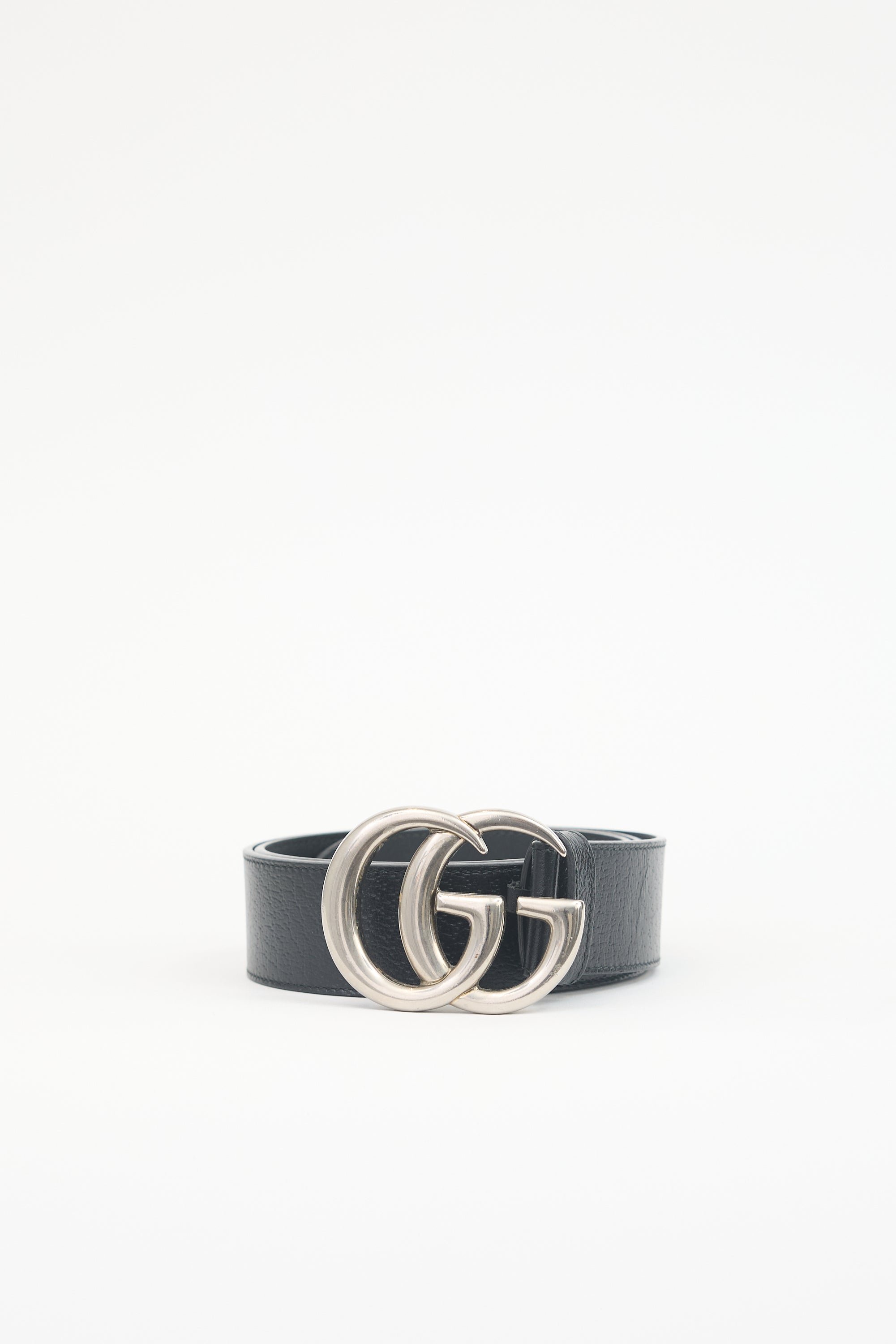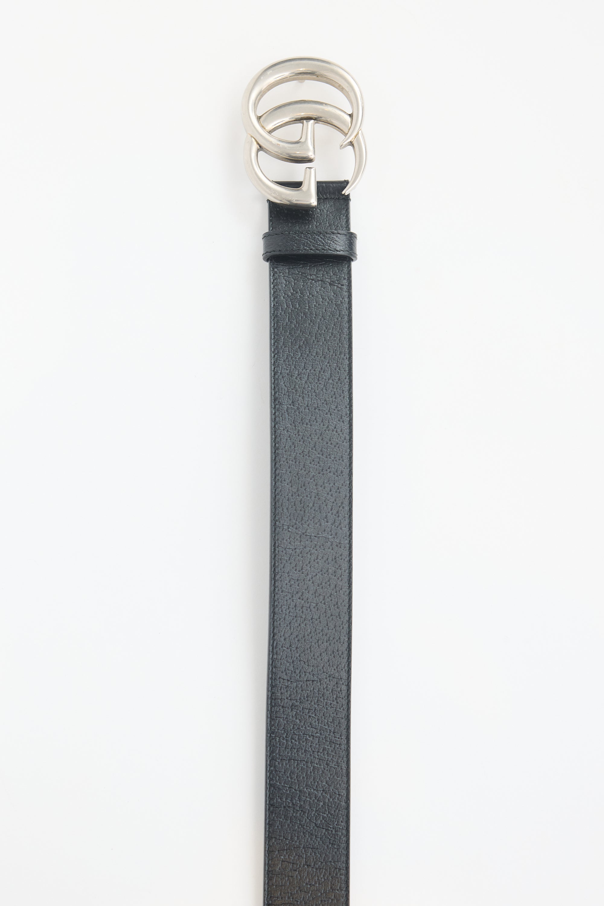 Pre-owned Gucci black pebbled leather belt featuring signature silver tone GG Marmont logo and push pin fastening.