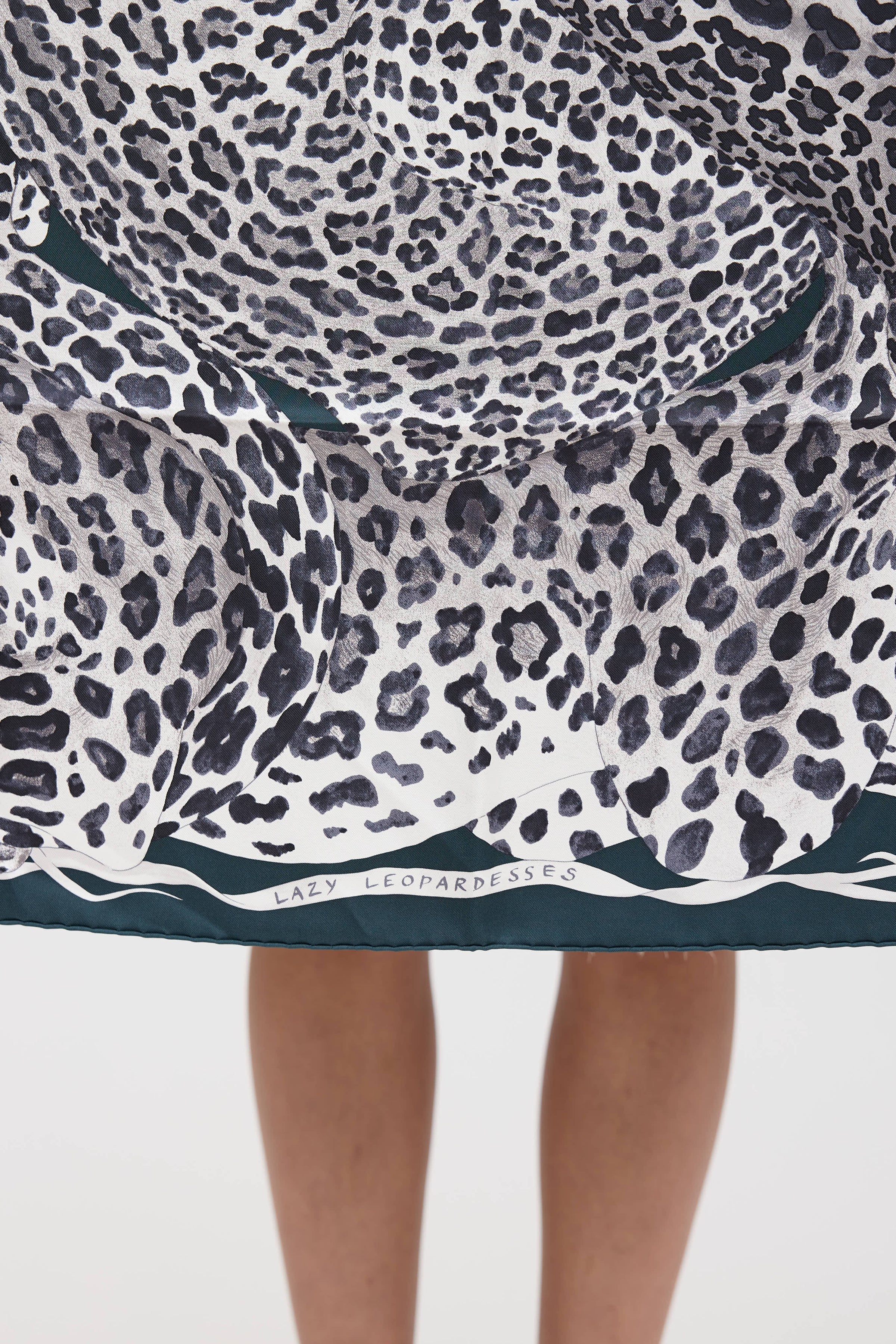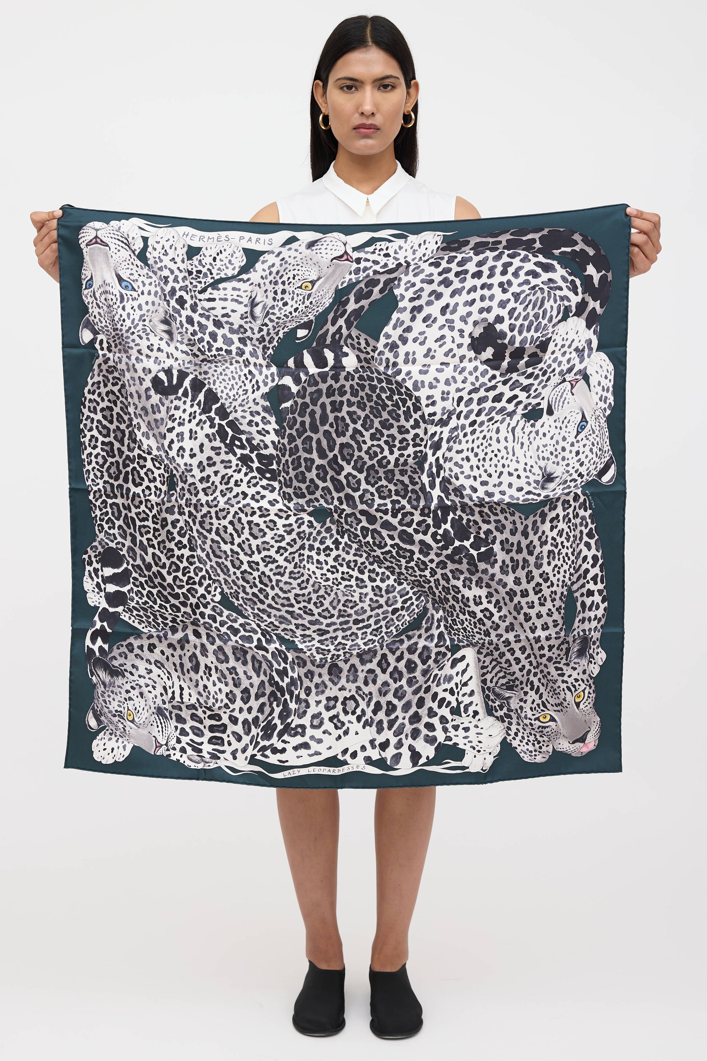 Pre-owned Hermès black and grey Lazy Leopardesses silk scarf featuring Lazy leopardesses print by Arlette Ess and black hand rolled edges.