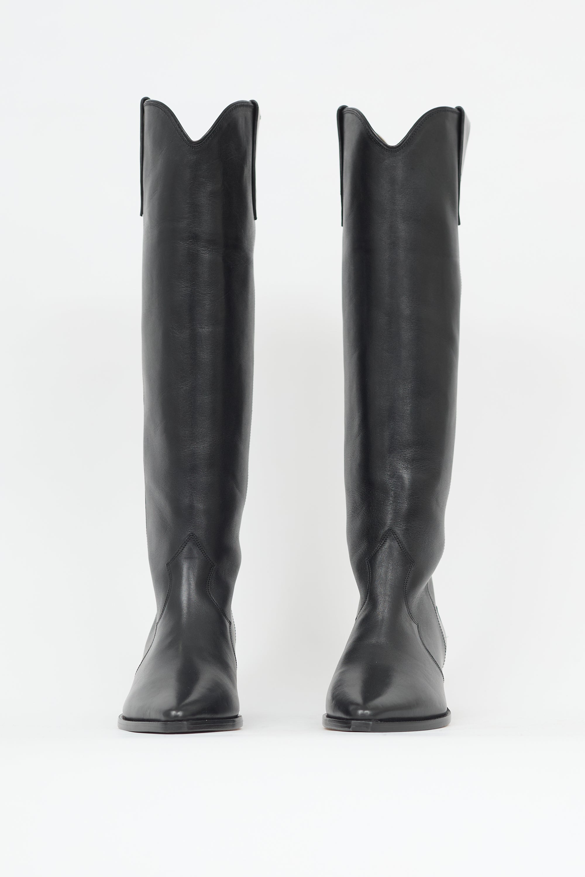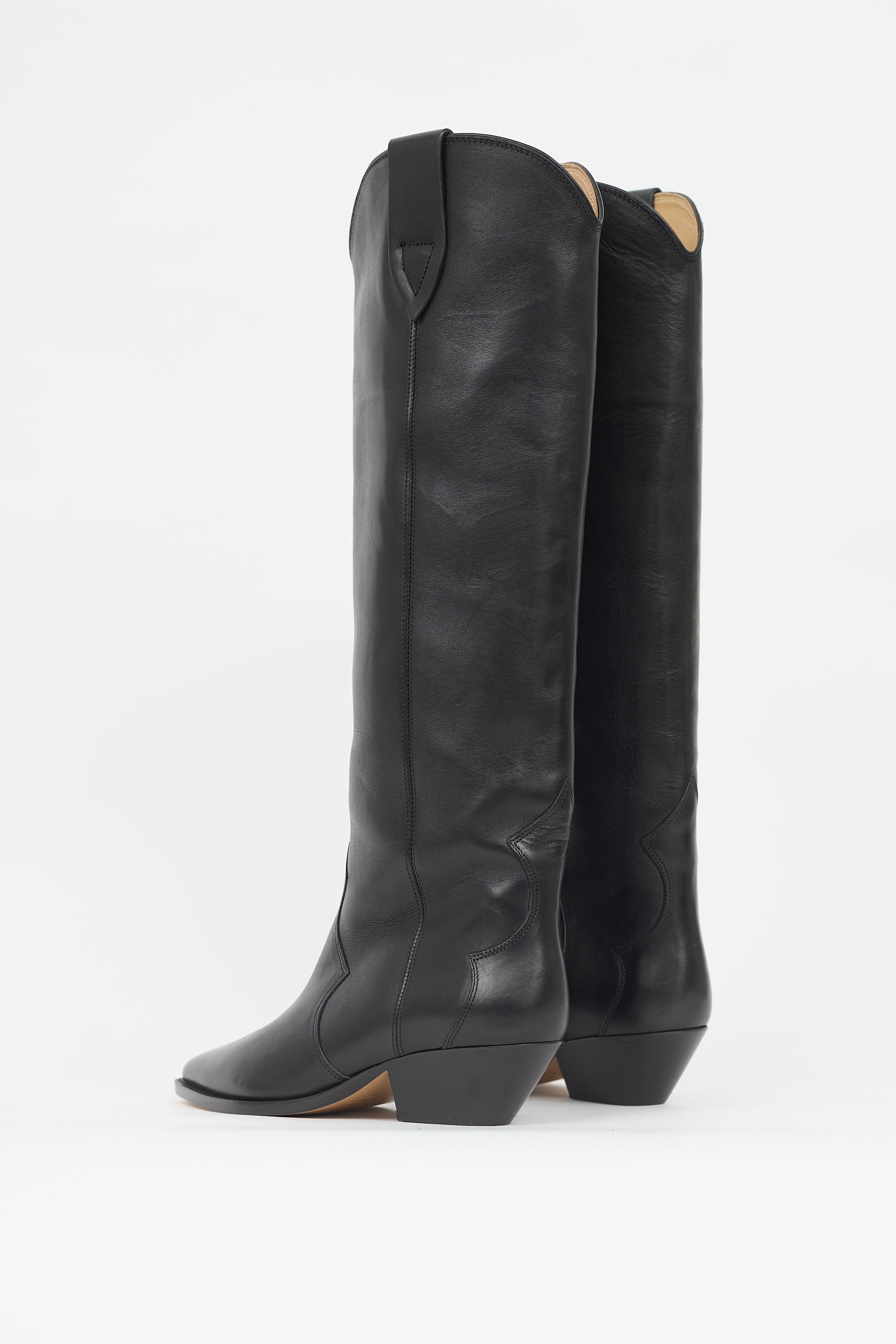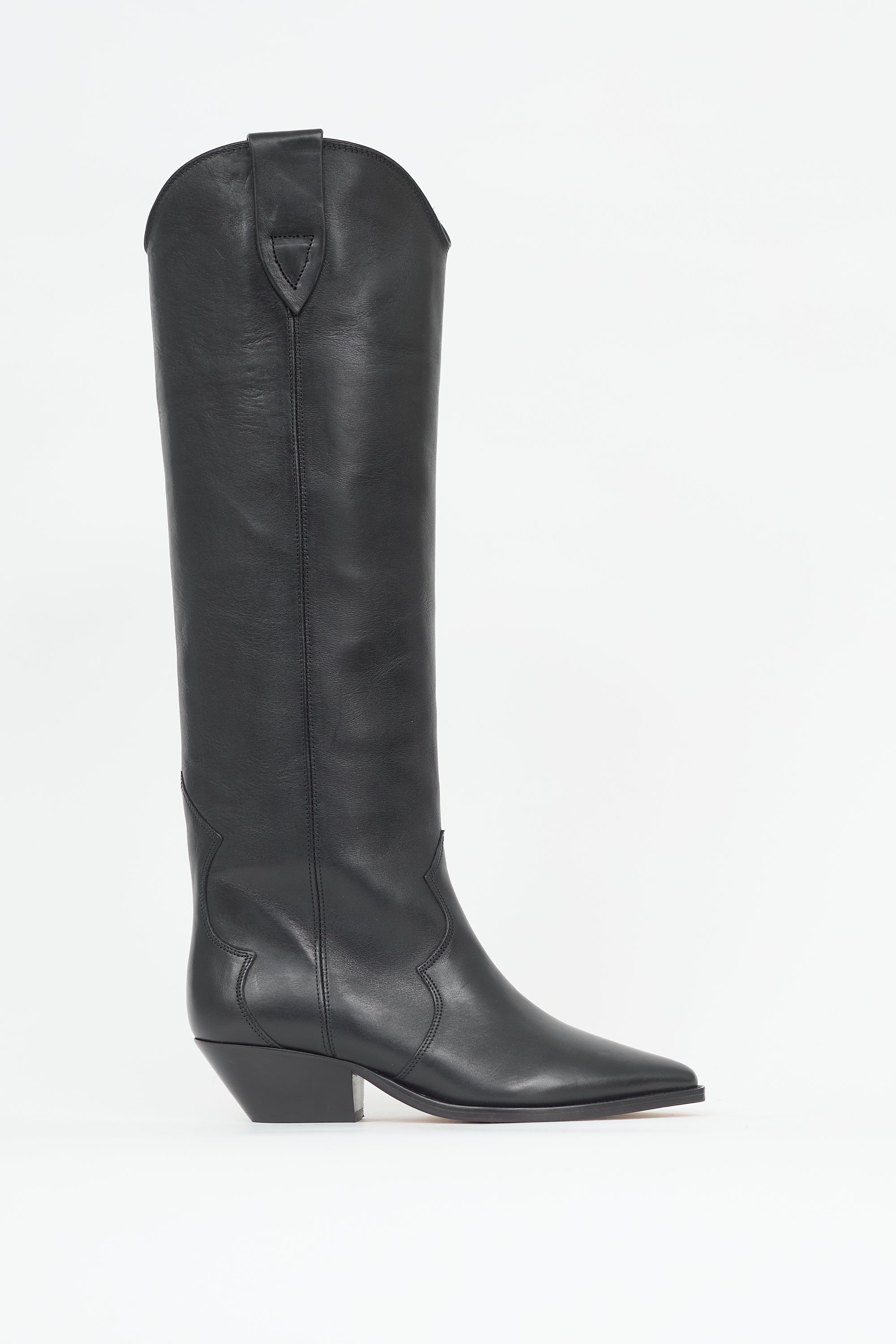 Pre-owned Isabel Marant black leather Denvee boots featuring pointed toe, panelled upper, pull tabs at opening, and slanted block heel. Includes original dust bag.
