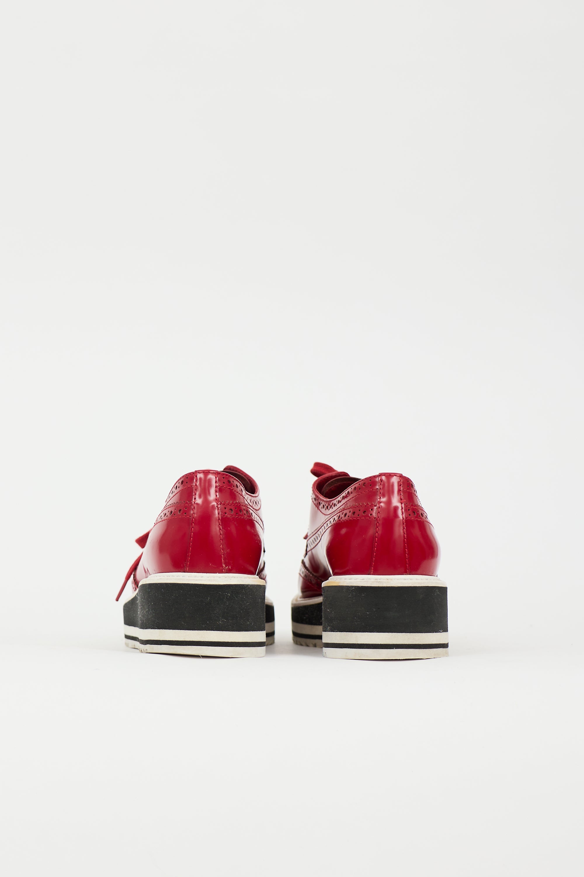 Pre-owned Prada red leather derby featuring almond toe, brogue cut out, lace up front, and white and black platform sole.