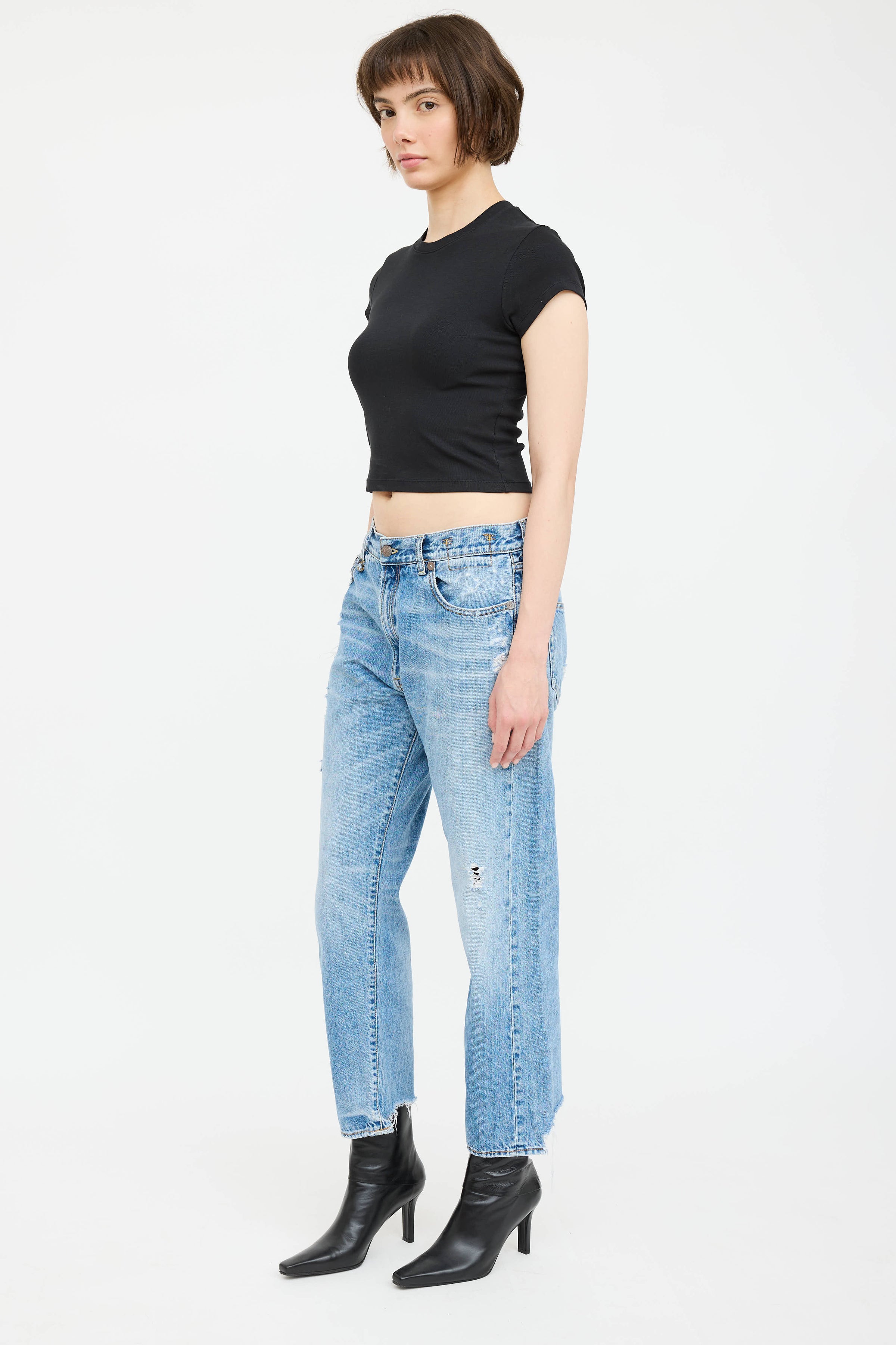 Pre-owned R13 light wash Boyfriend jeans featuring five pocket styling, leather logo patch at back, straight leg, intentional distressing throughout, and zip fly with button closure.