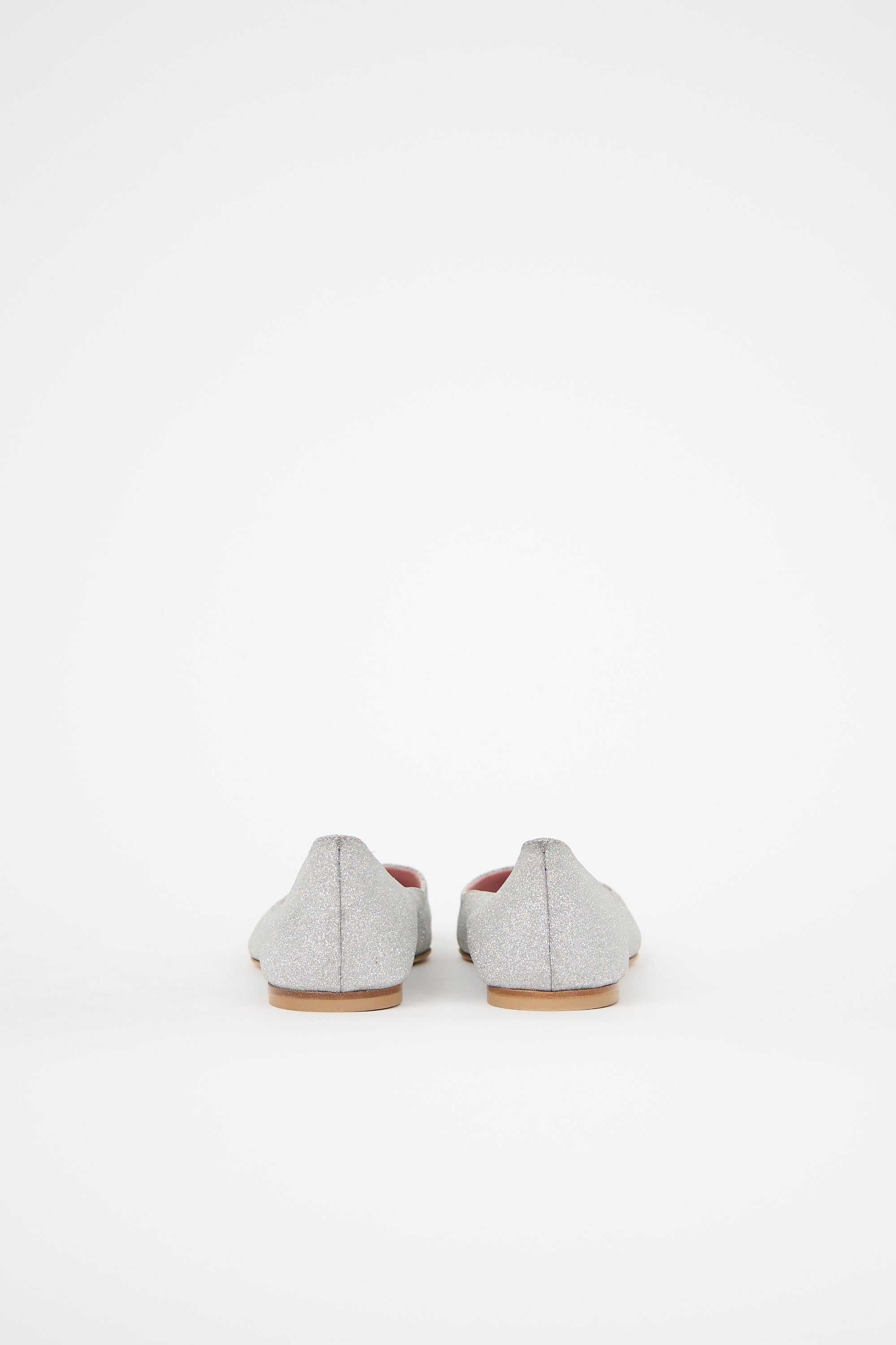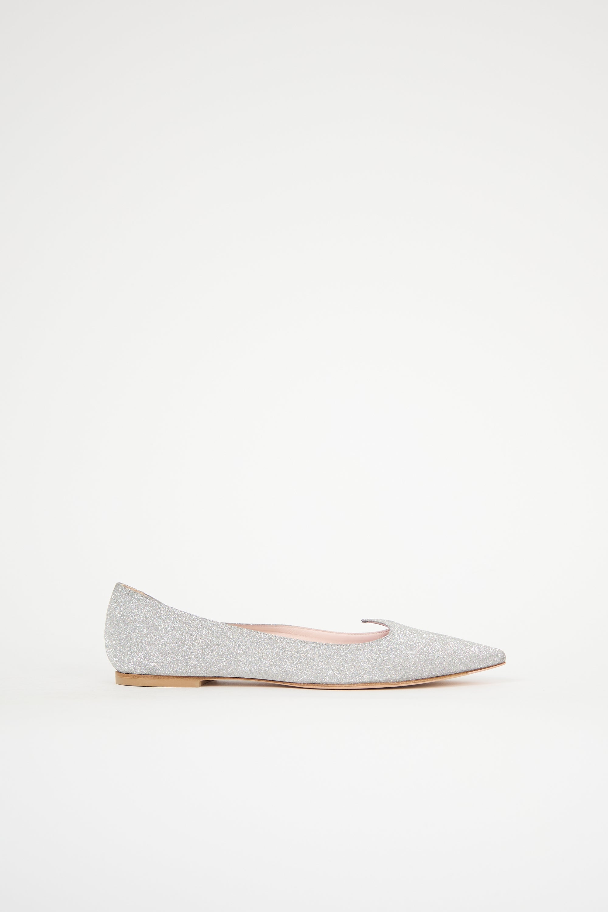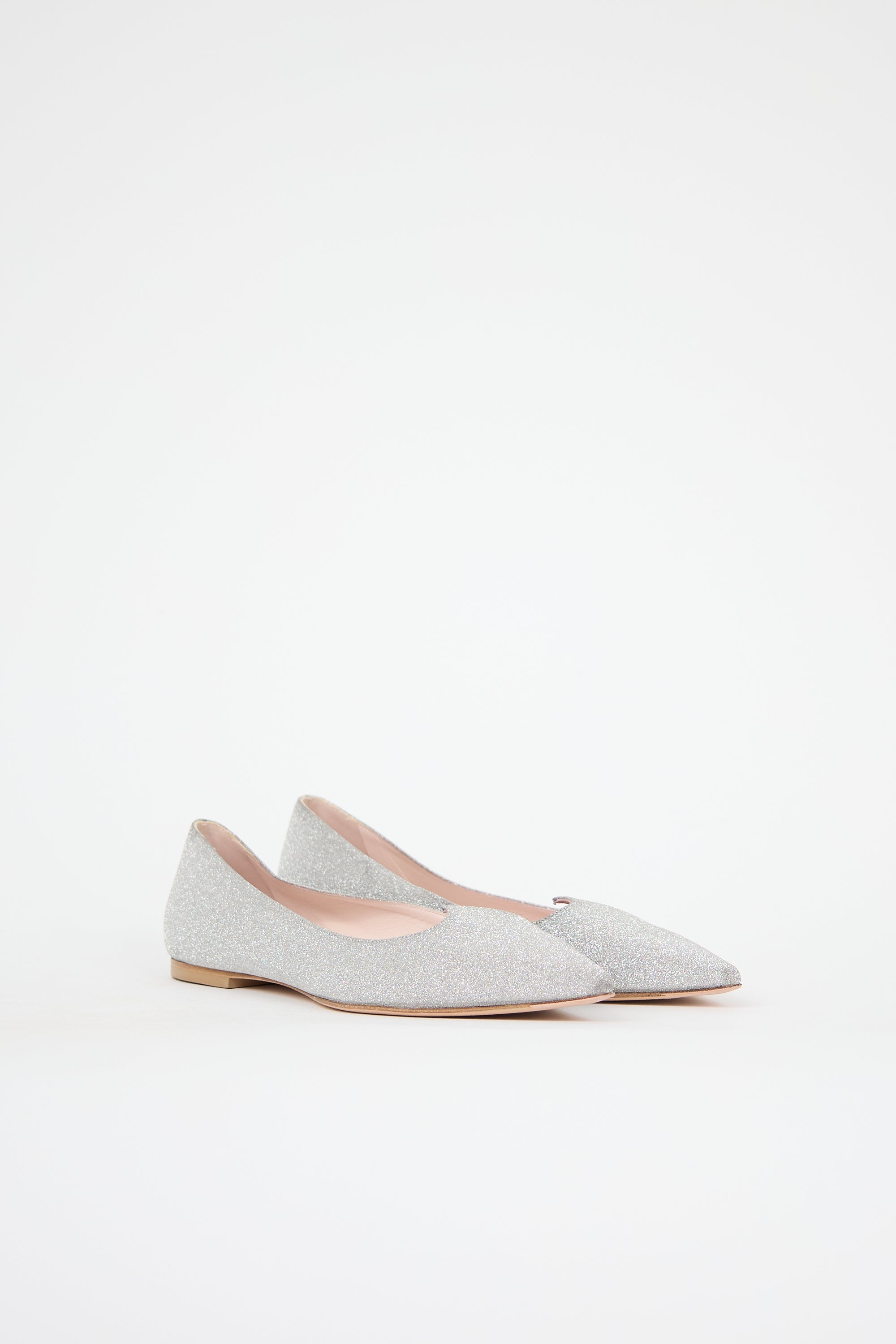 Pre-owned Roger Vivier silver leather I Love Vivier flats featuring pointed toe, tapered topline, and glitter upper. Comes with original dust bag and box.