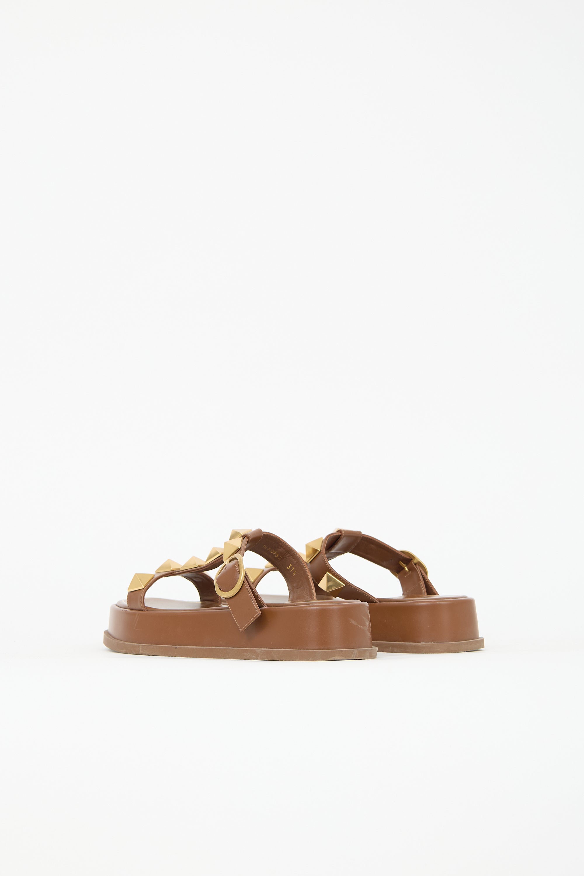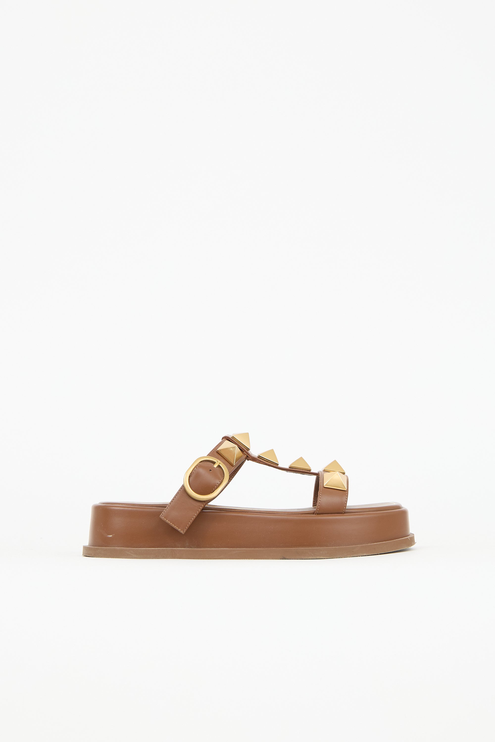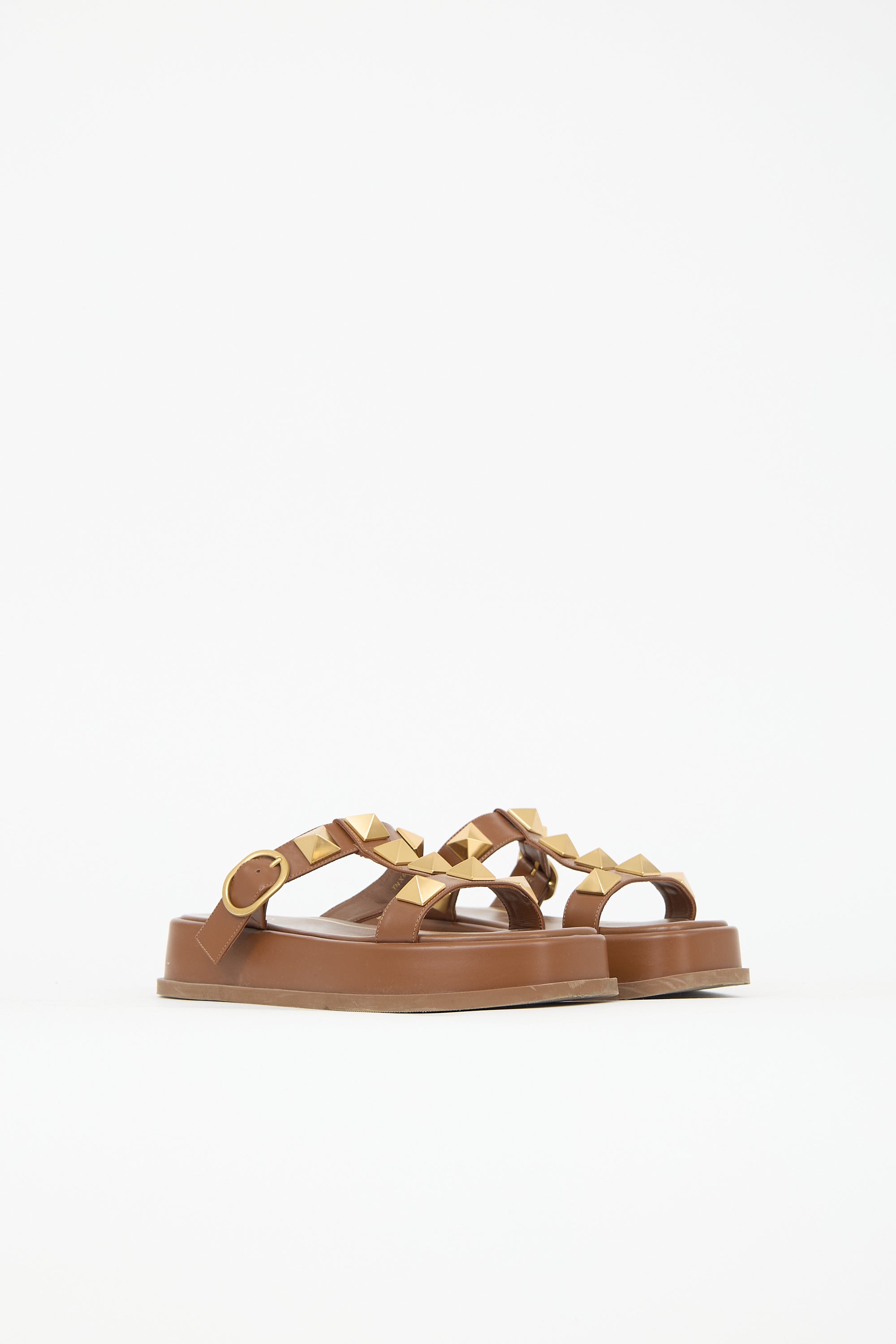 Pre-owned Valentino brown leather sandals featuring square toe, gold tone Roman stud embellished upper, adjustable instep strap, and covered platform.