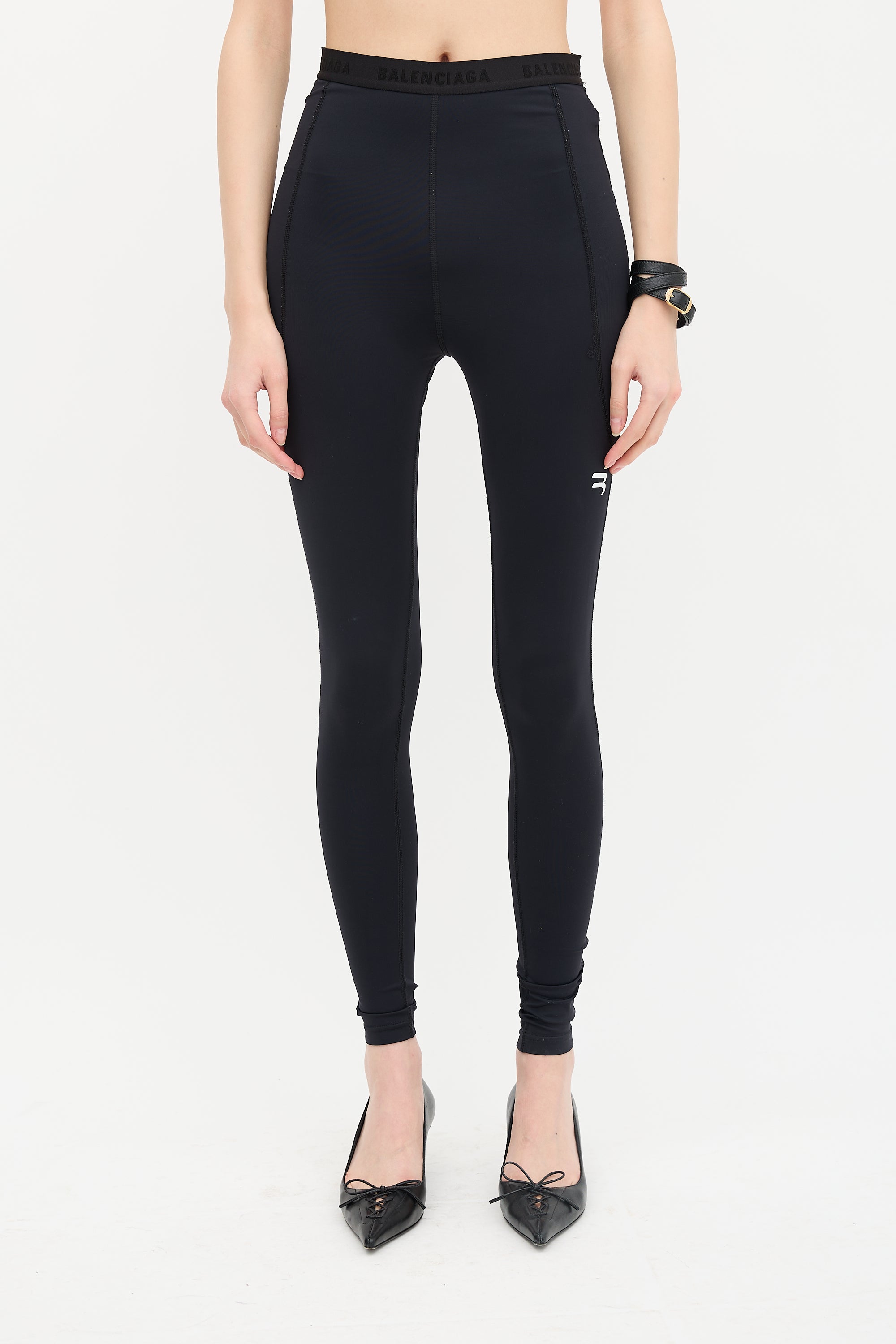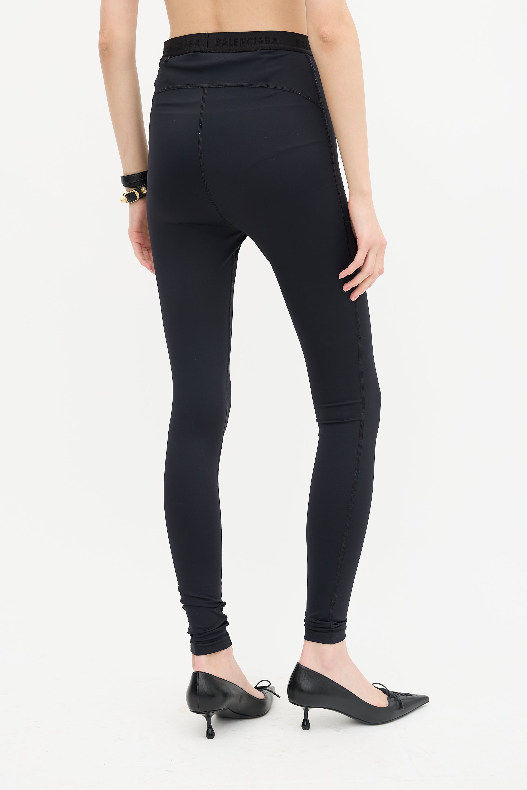 Pre-owned Balenciaga Activewear black spandex high waist leggings featuring an elasticized logo waistband, zip pocket at back waist, topstitched details, and white logo at left leg.