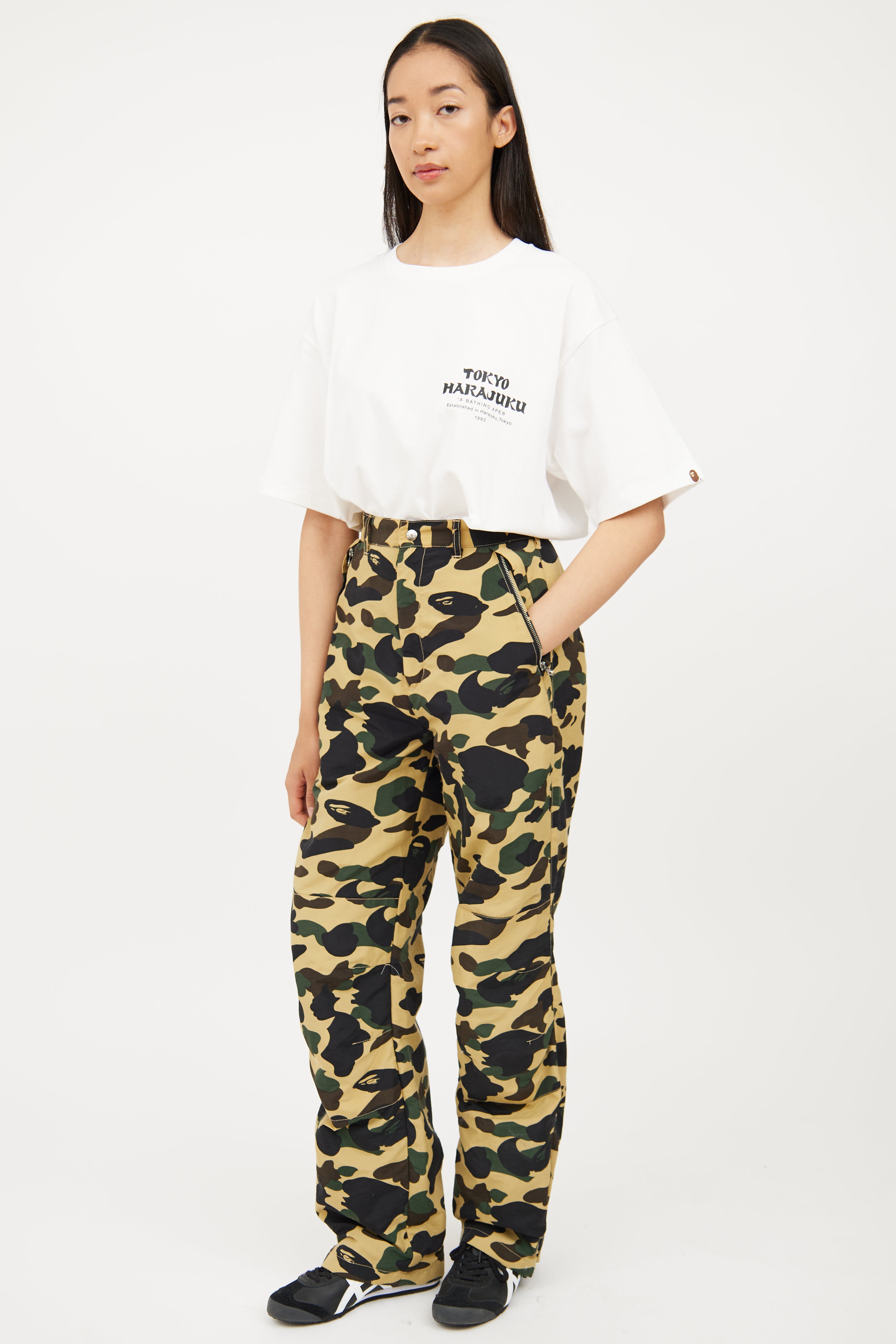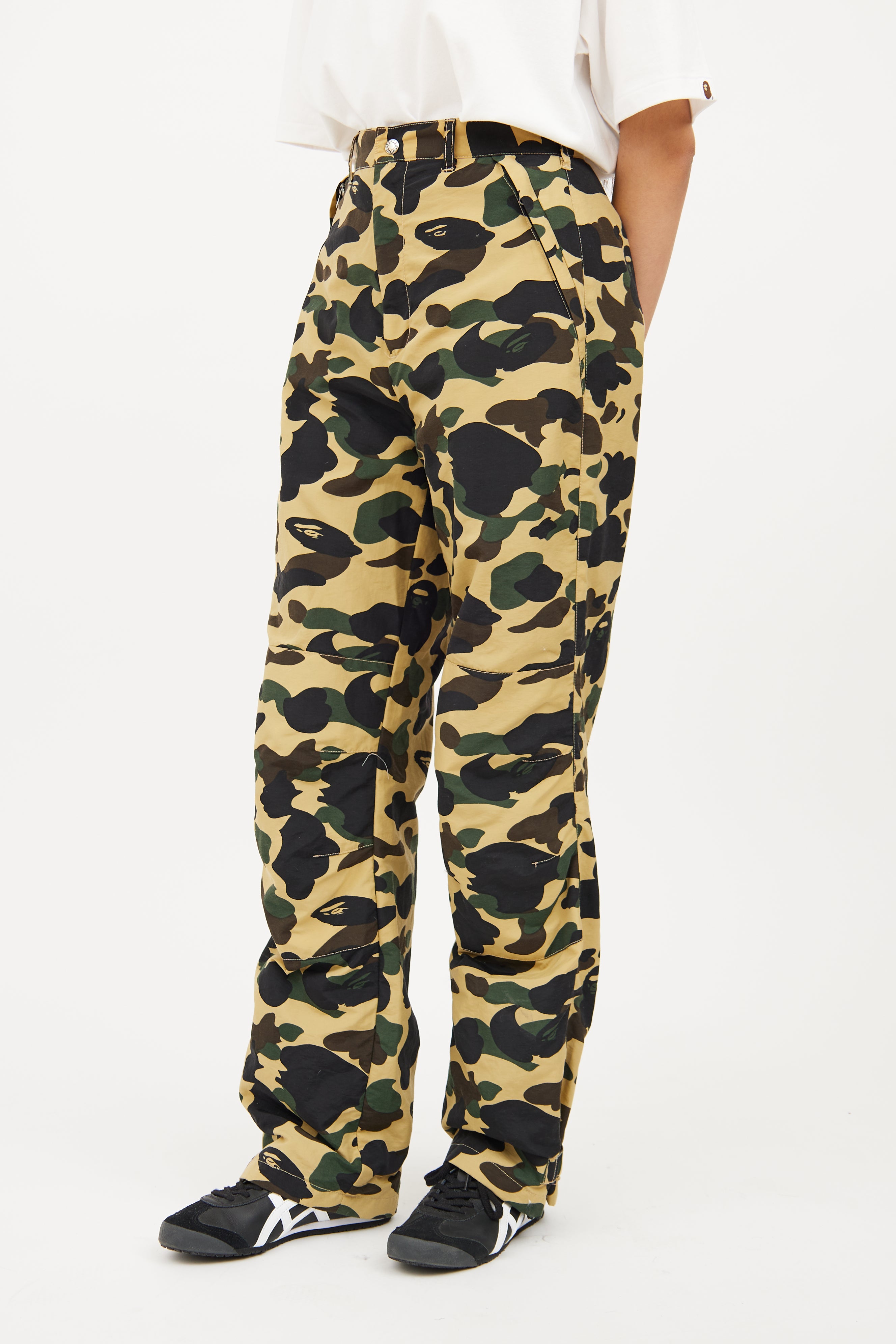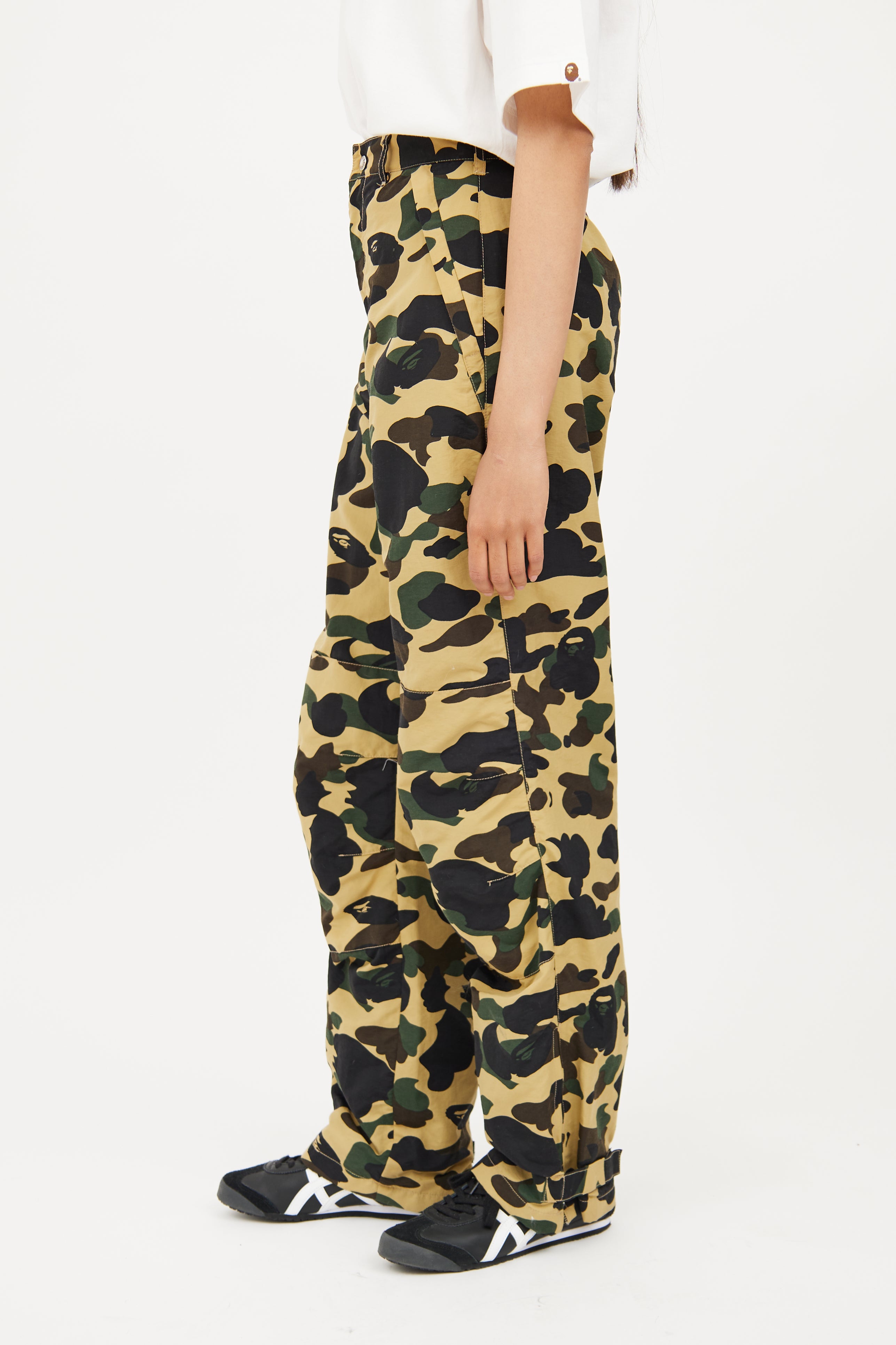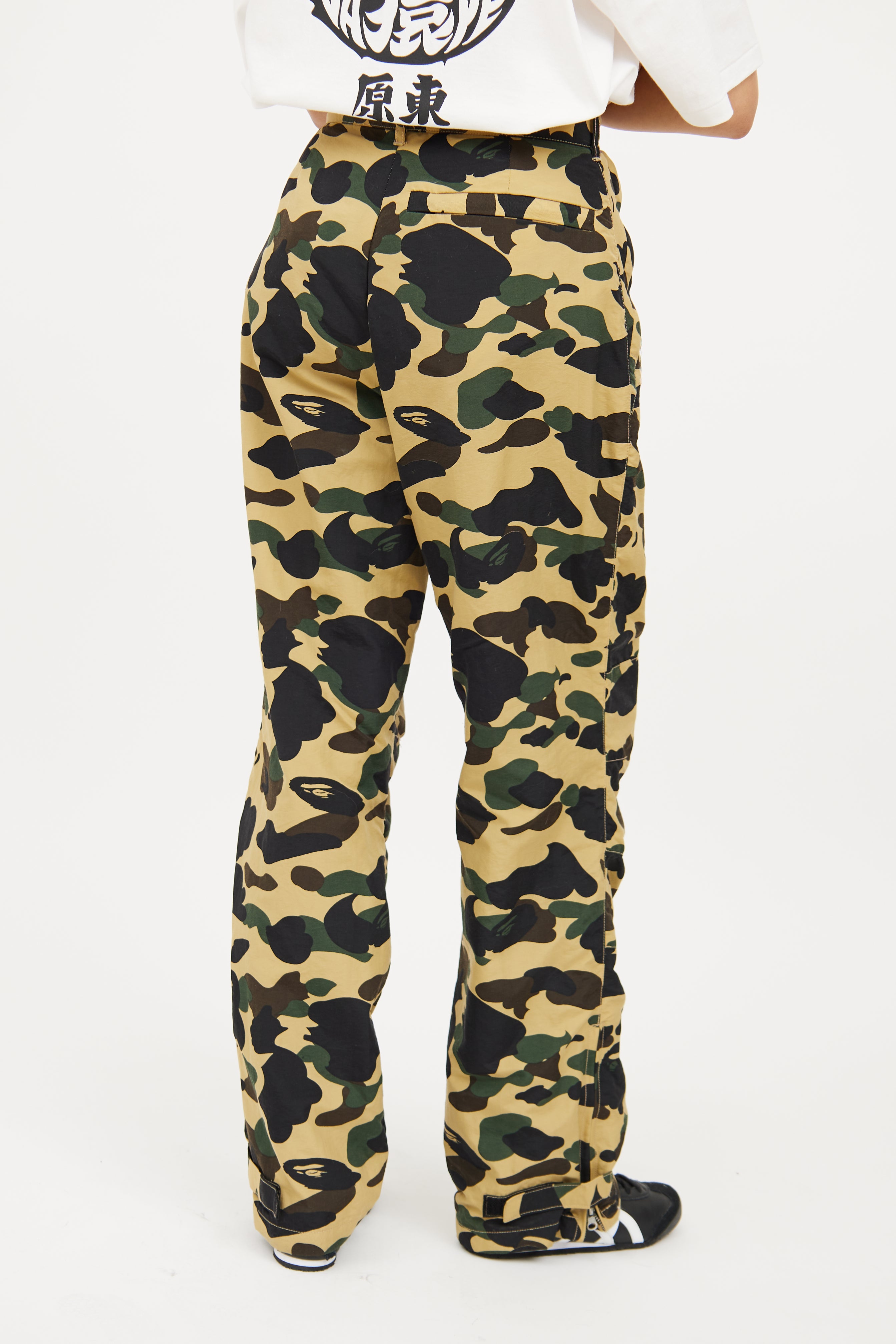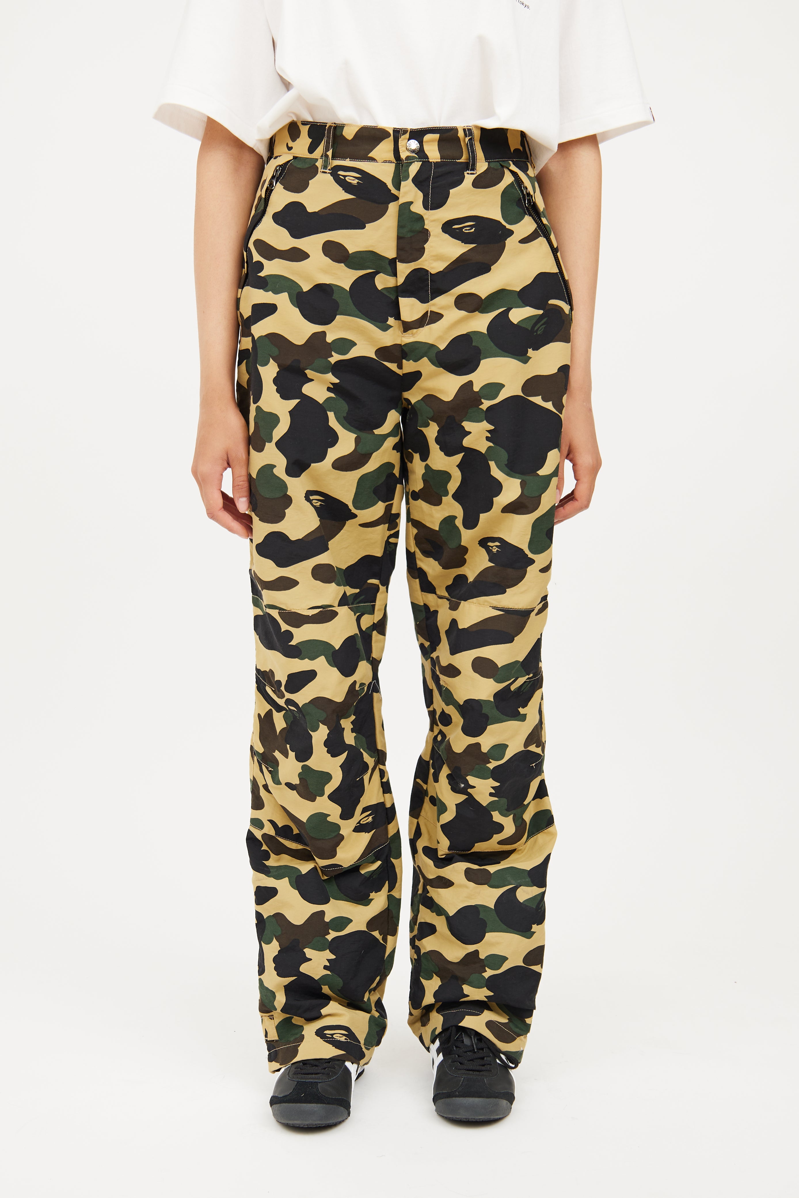 Pre-owned Bape camouflage nylon pants featuring snap button and zip closure, belt loops on waist, dual zip pockets on hip, zip with velcro strap on ankle, mesh lined and single zip pocket on back right.