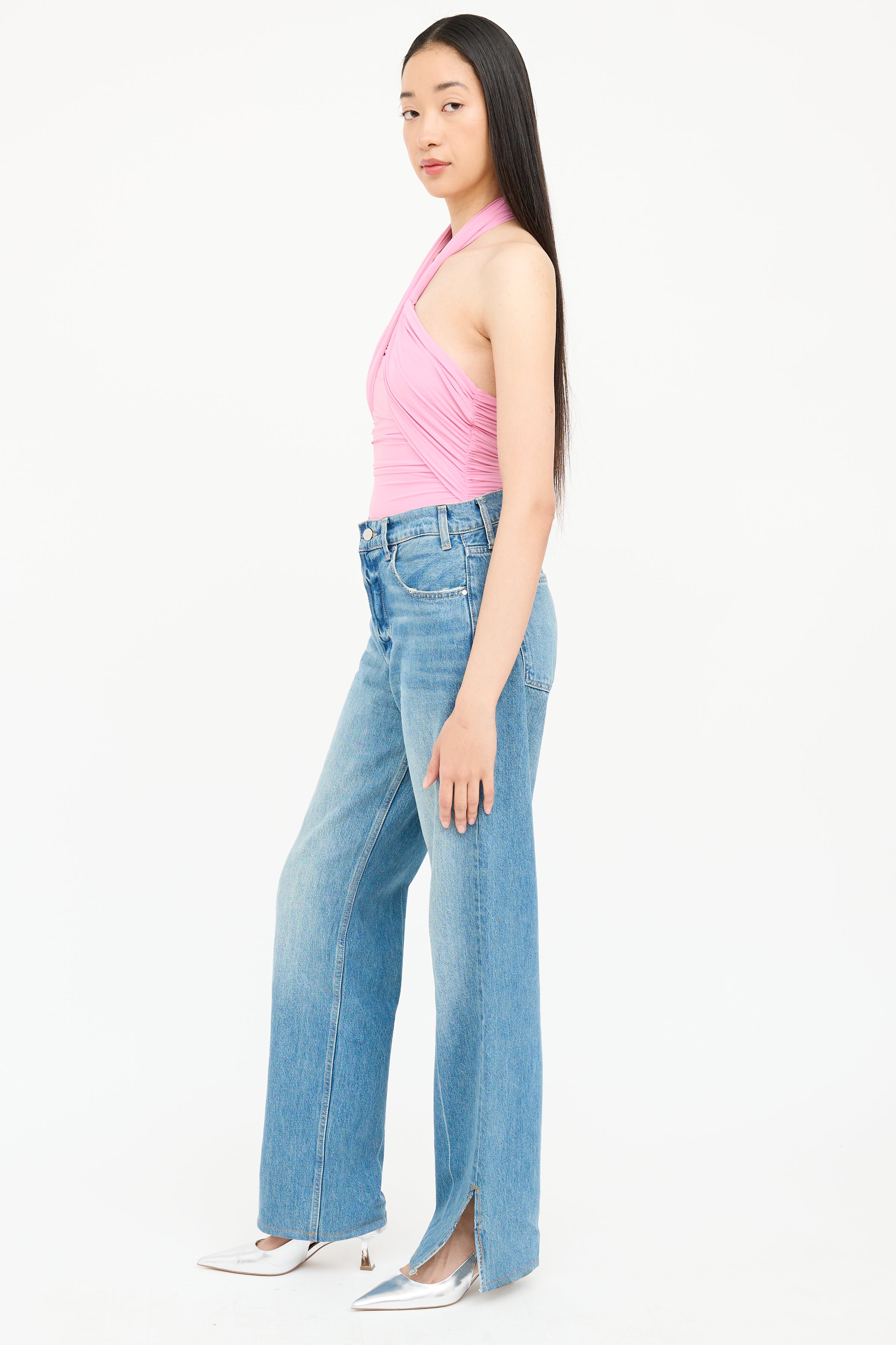Ronny Kobo pink sleeveless bodysuit featuring a halter neckline, gathered detailing, snap at bottom, and zip closure at back.