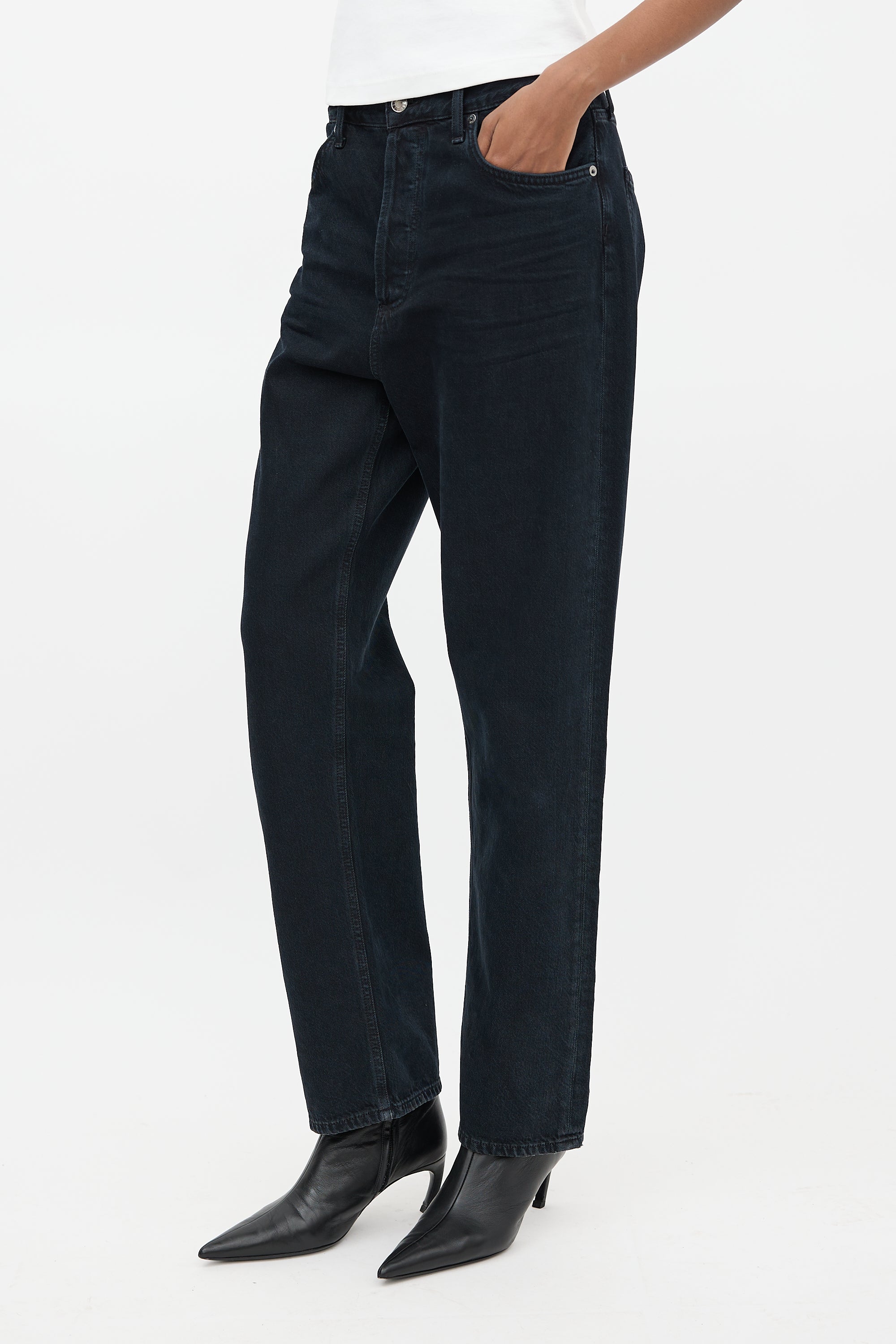 Pre-owned Agolde black 90's Pinch jeans featuring belt loops, button fly, high waist, five pocket styling, and straight leg. Clipped to fit model.