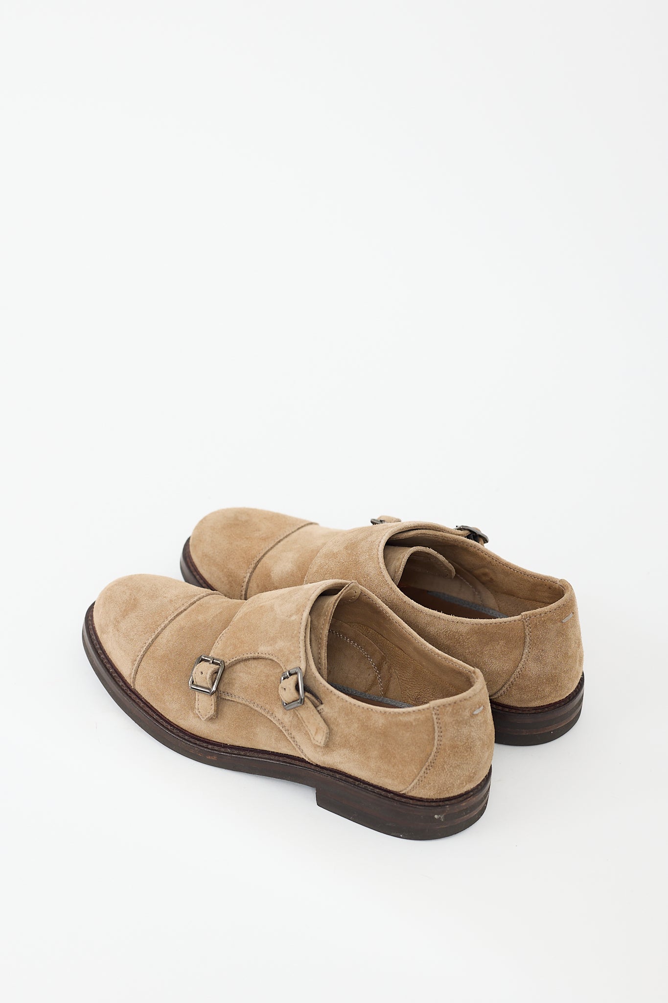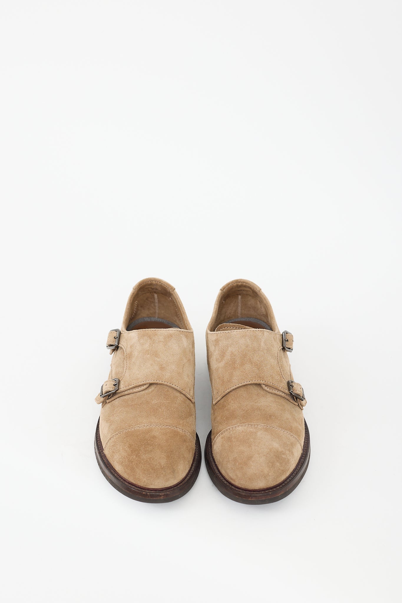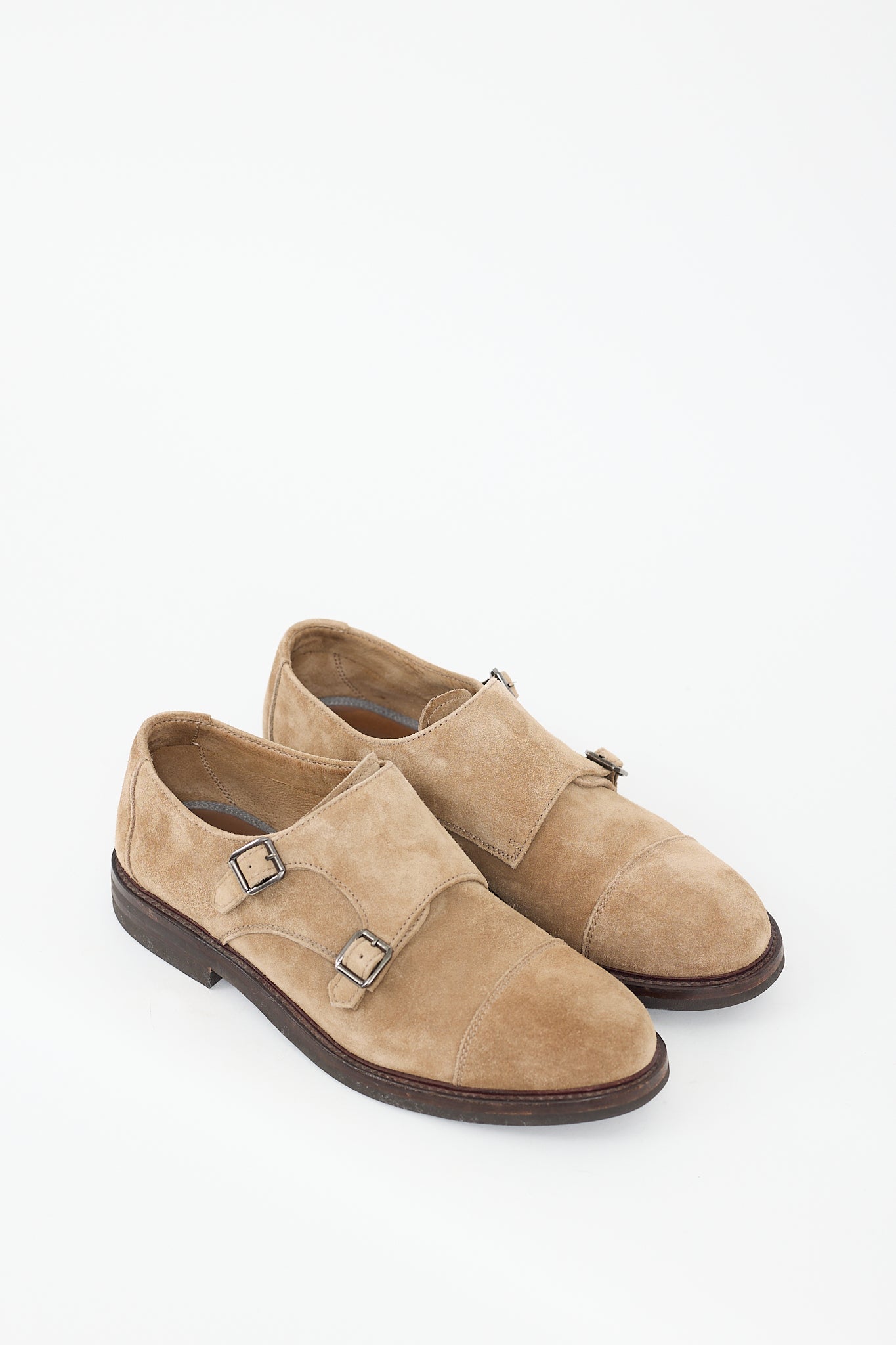 Pre-owned Brunello Cucinelli beige suede derbies featuring a round toe, stacked heel, and dual monk strap closure. Comes with original dust bag.