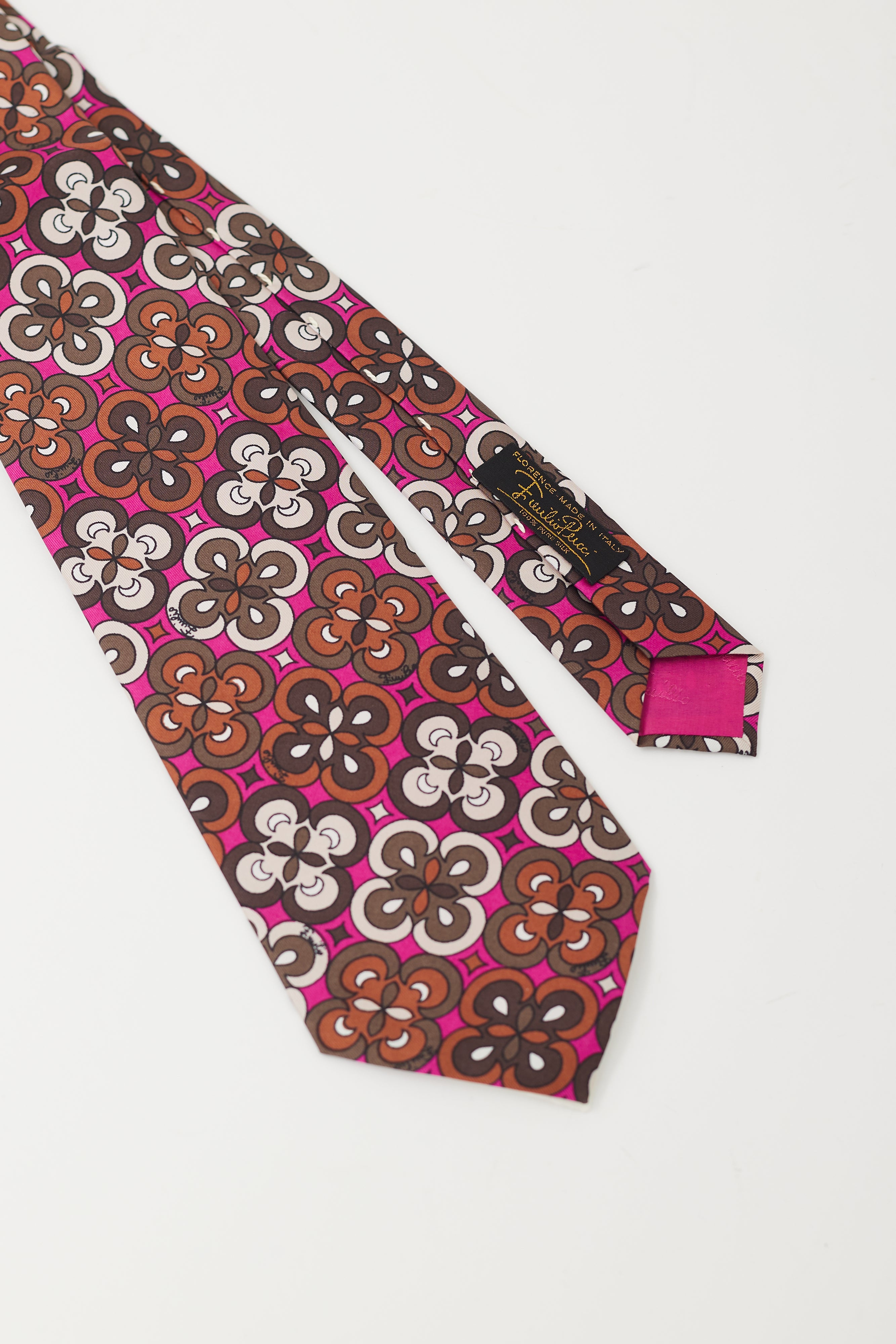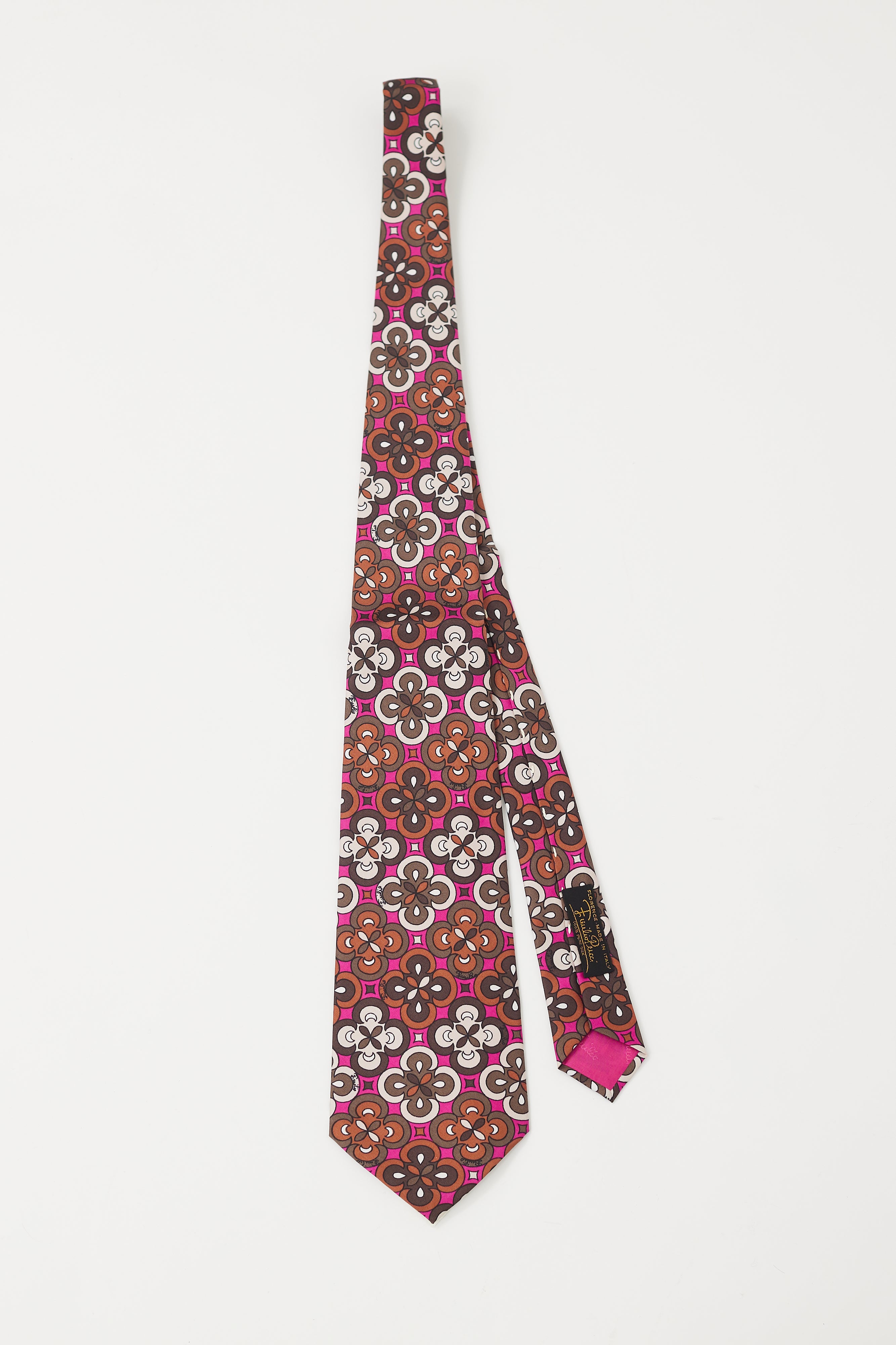 Pre-owned Emilio Pucci purple silk tie featuring brown and beige geometric floral print throughout and logo tab at reverse. Comes with original packaging.