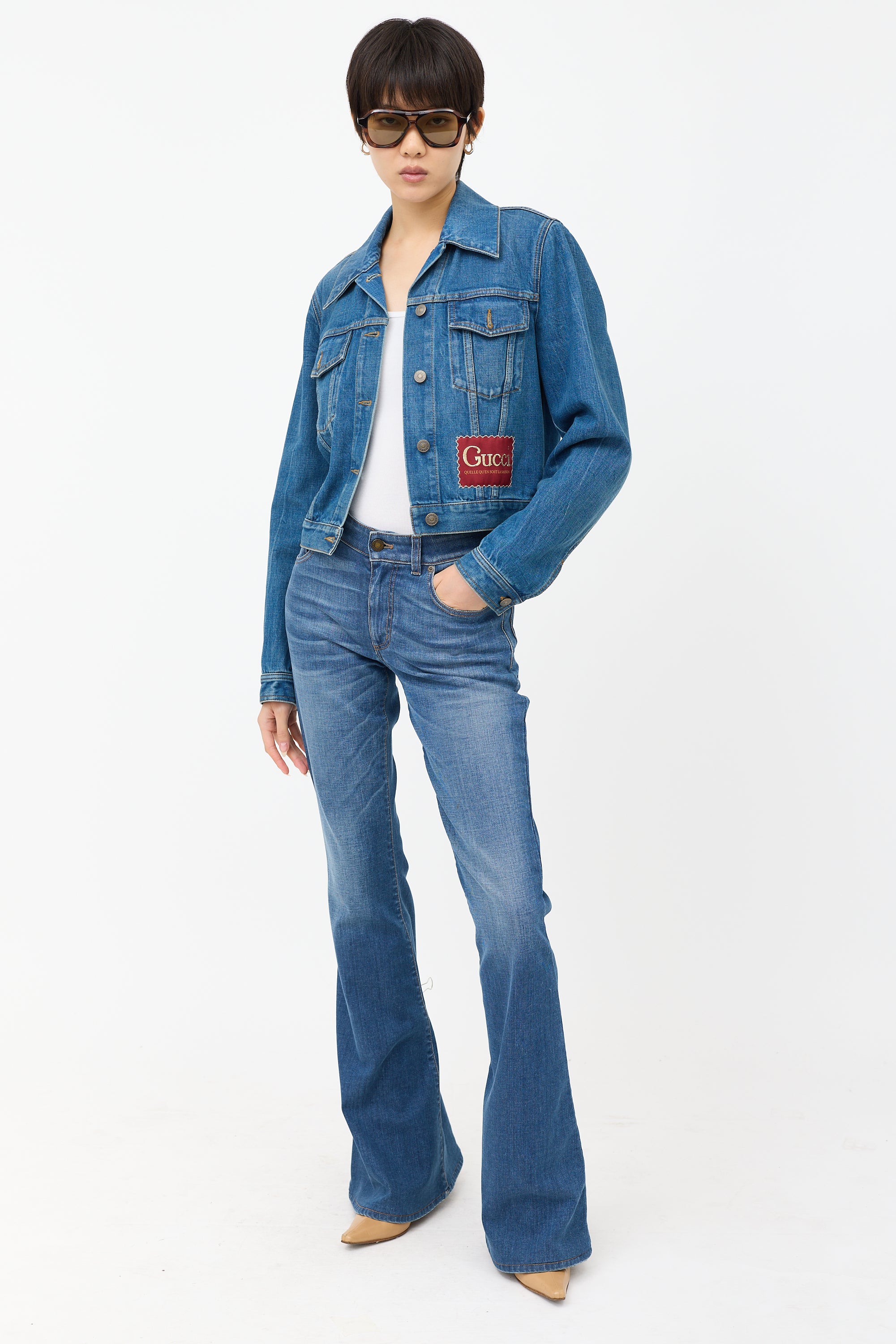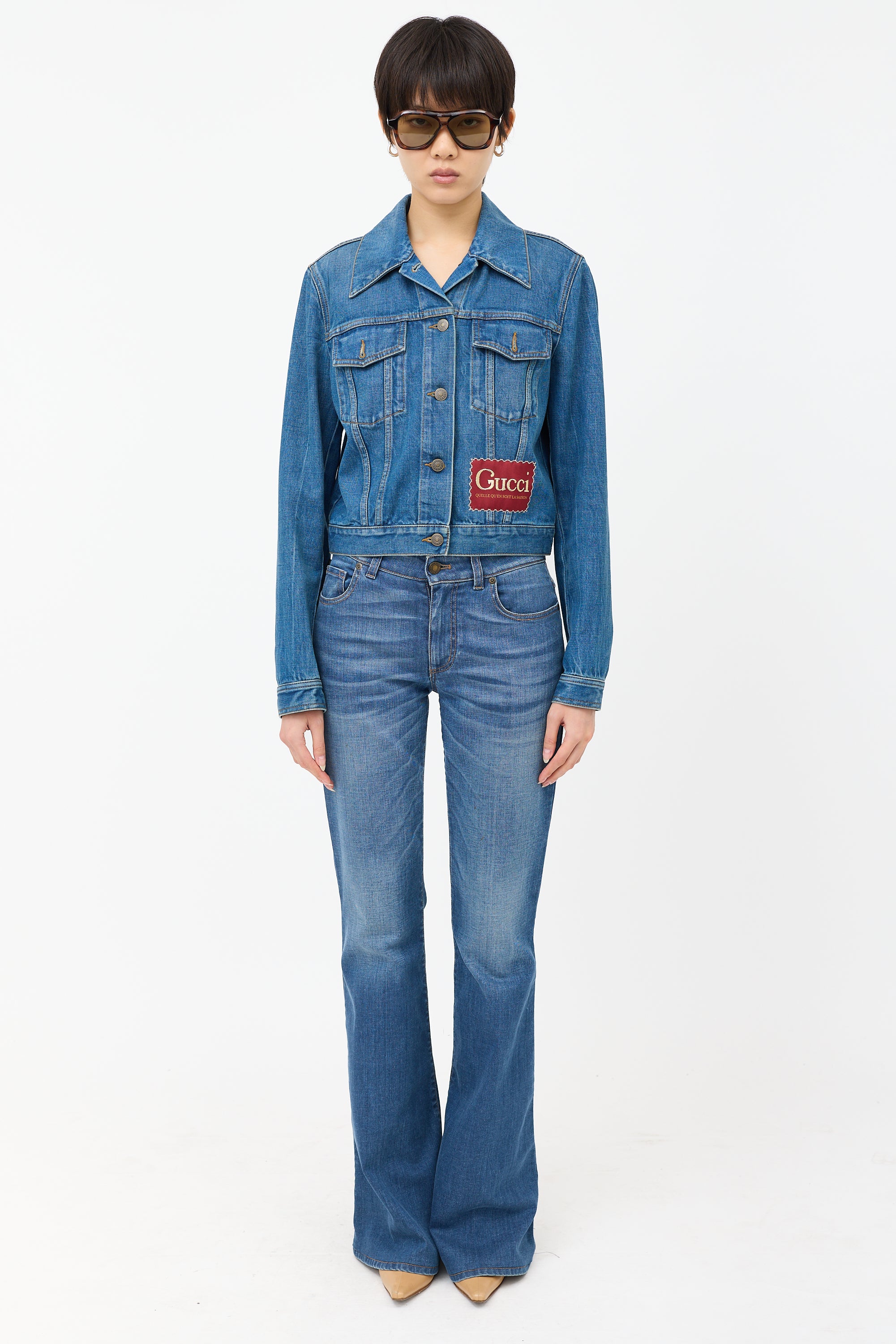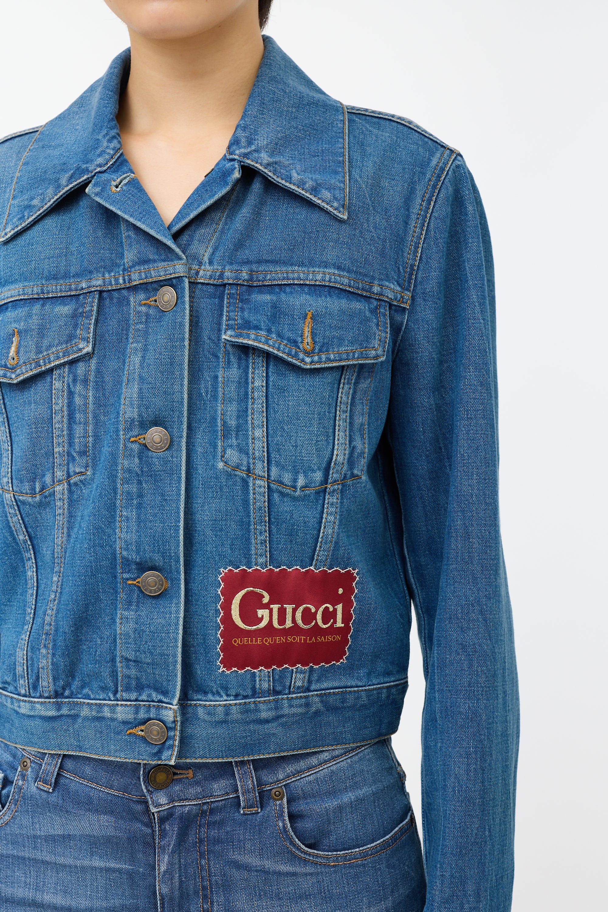 Pre-owned Gucci mid wash cropped denim jacket featuring gold and burgundy embroidered logo patch at front hem, spread collar, button front, and two flap pockets.
