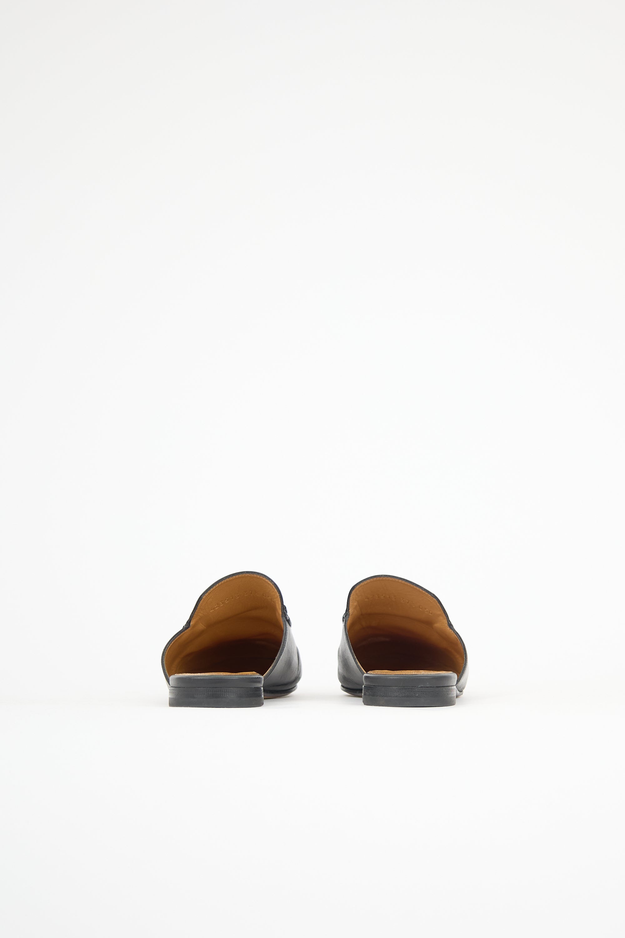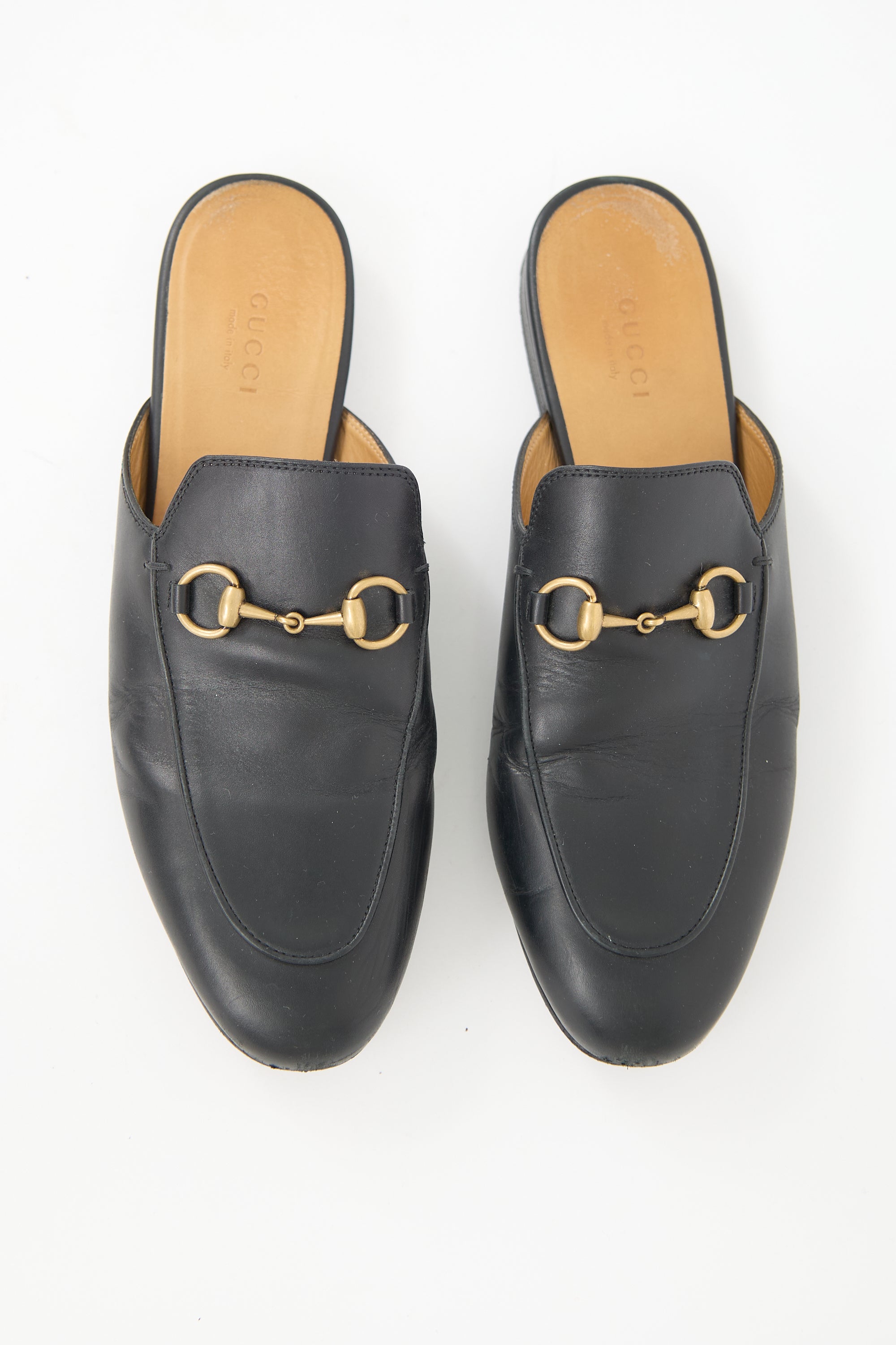 Pre-owned Gucci black leather Princetown mules featuring almond toe, gold tone Horsebit hardware at vamp, and leather insole and outsole. Comes with original dust bags.