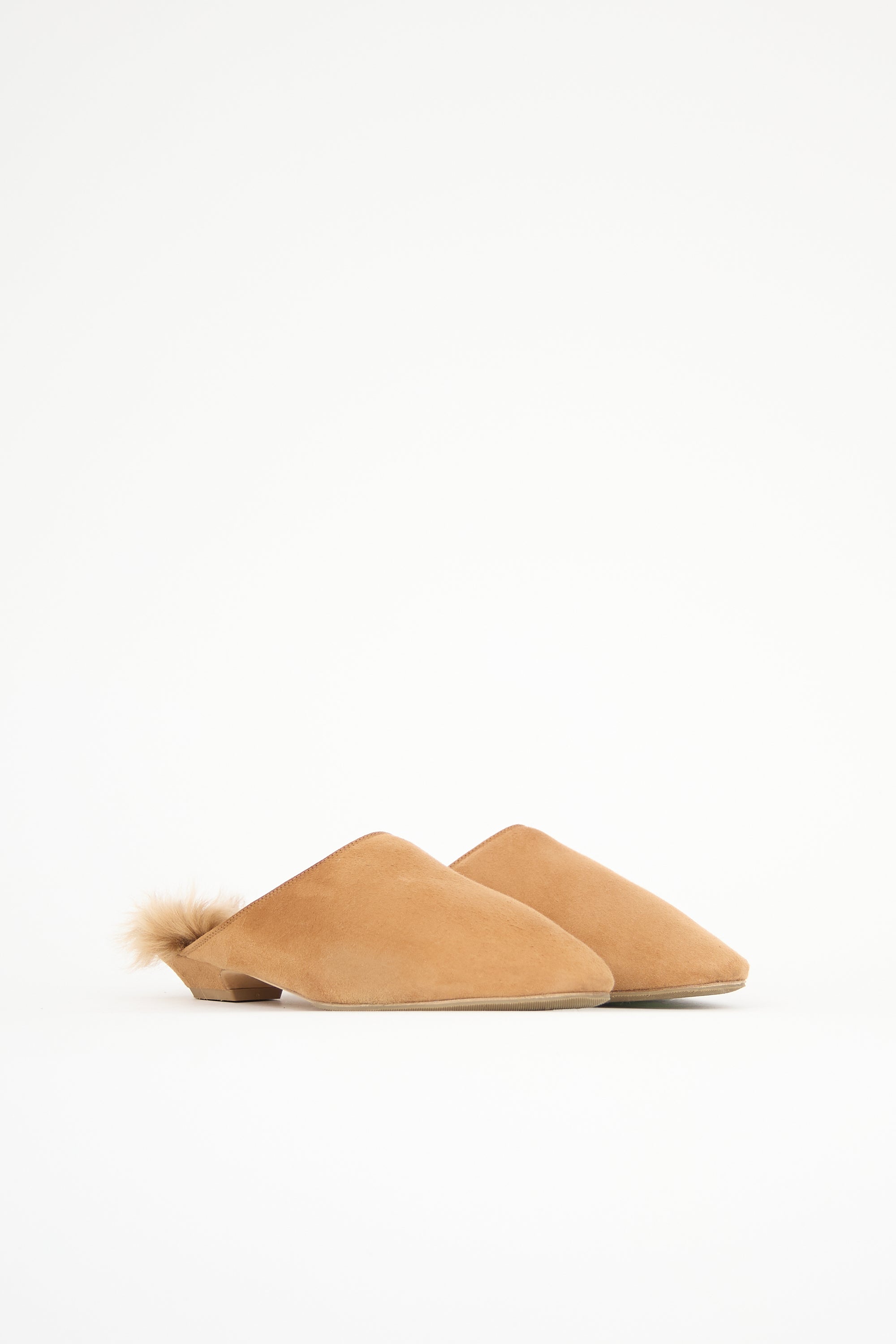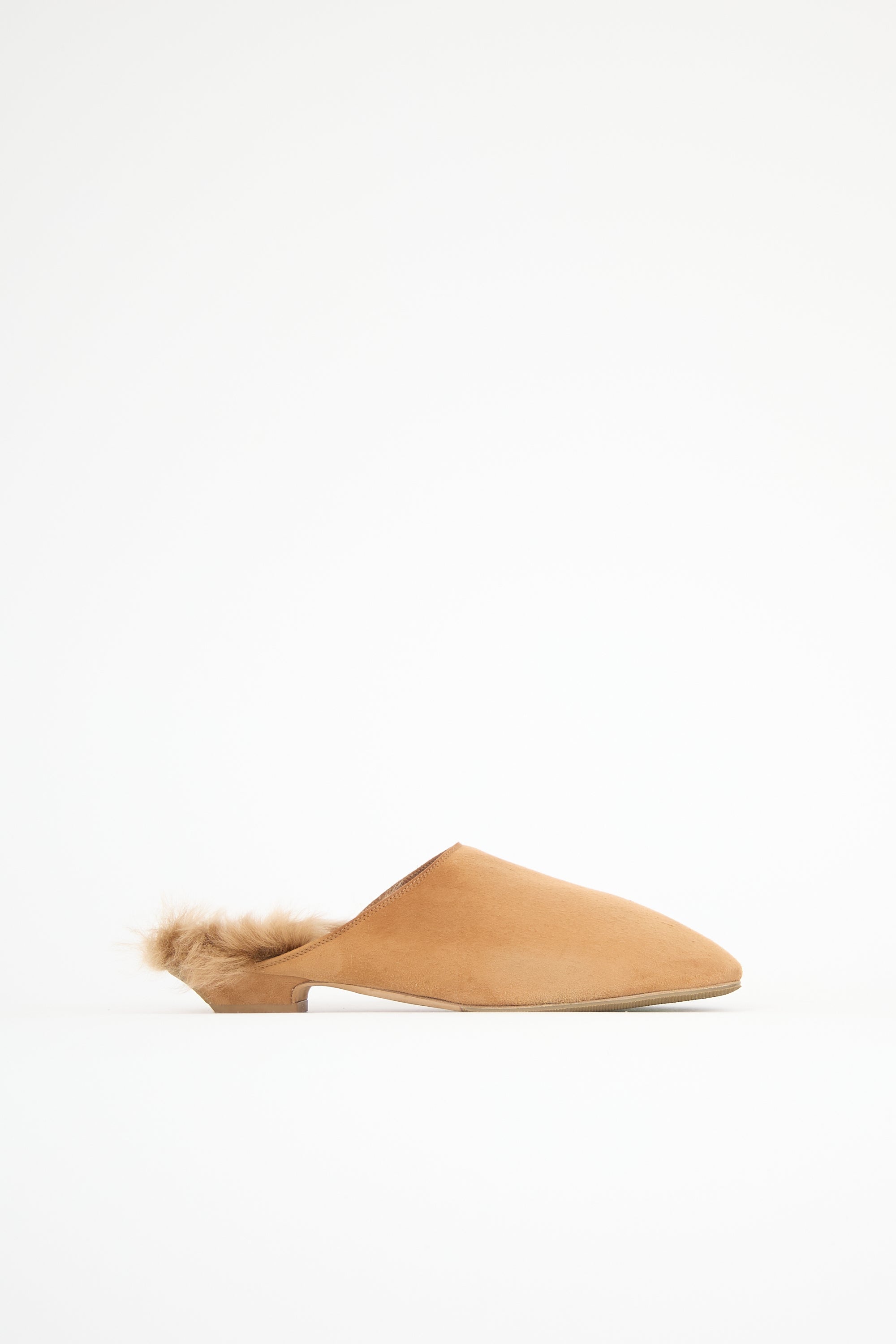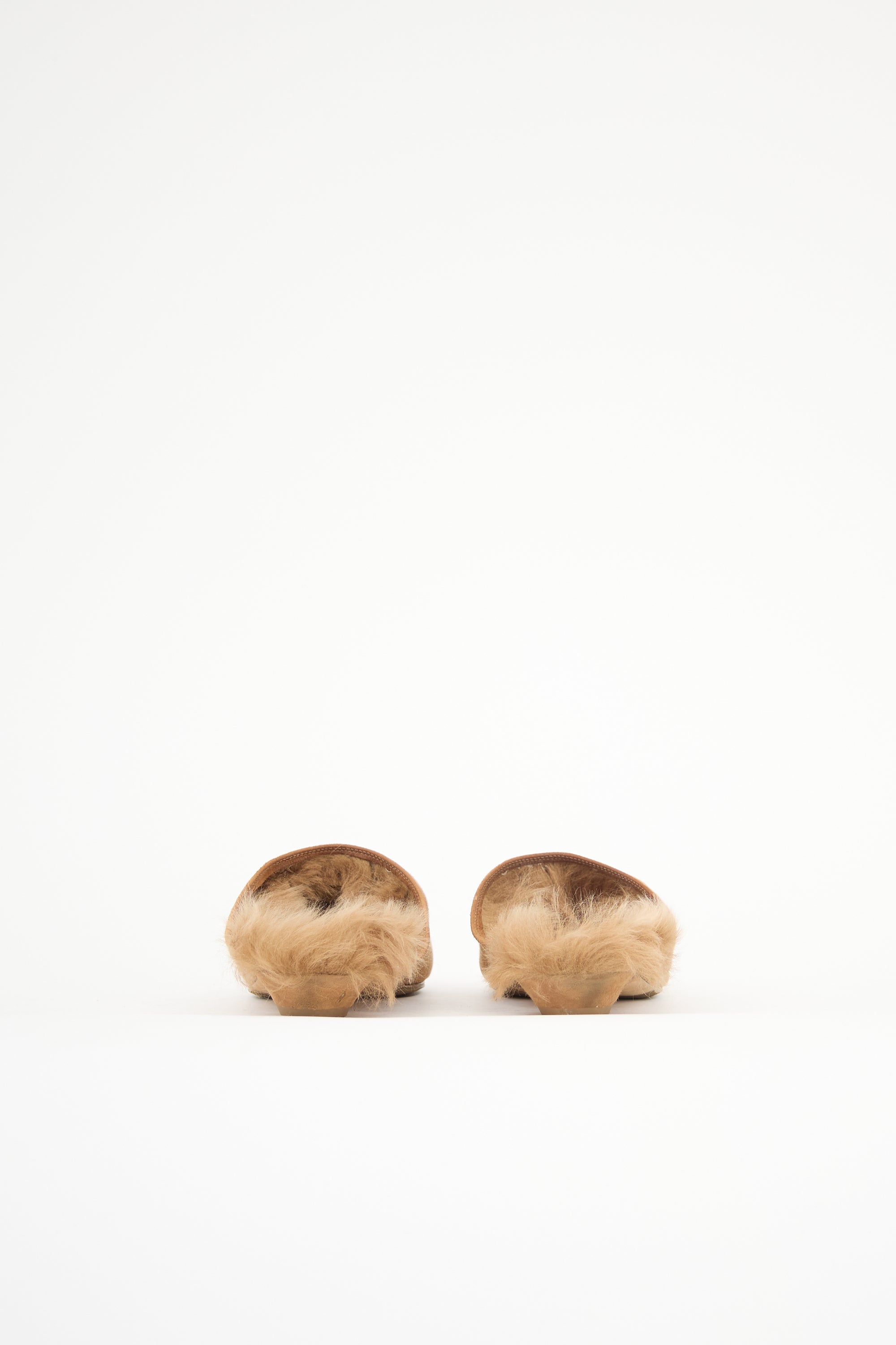 Pre-owned Khaite brown shearling Otto mules featuring rounded toe, fur interior, and covered kitten heel. Comes with original dust bag.
