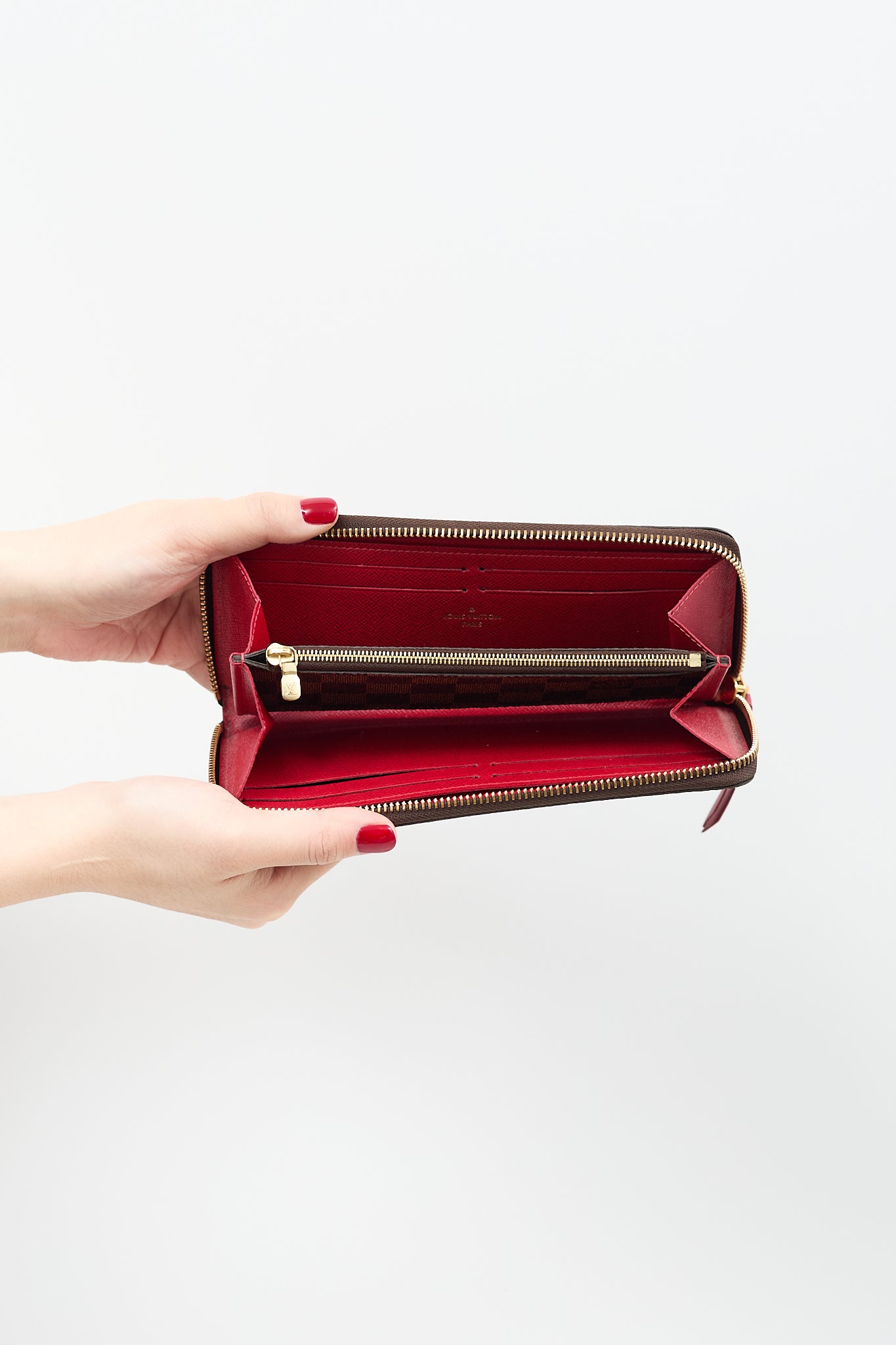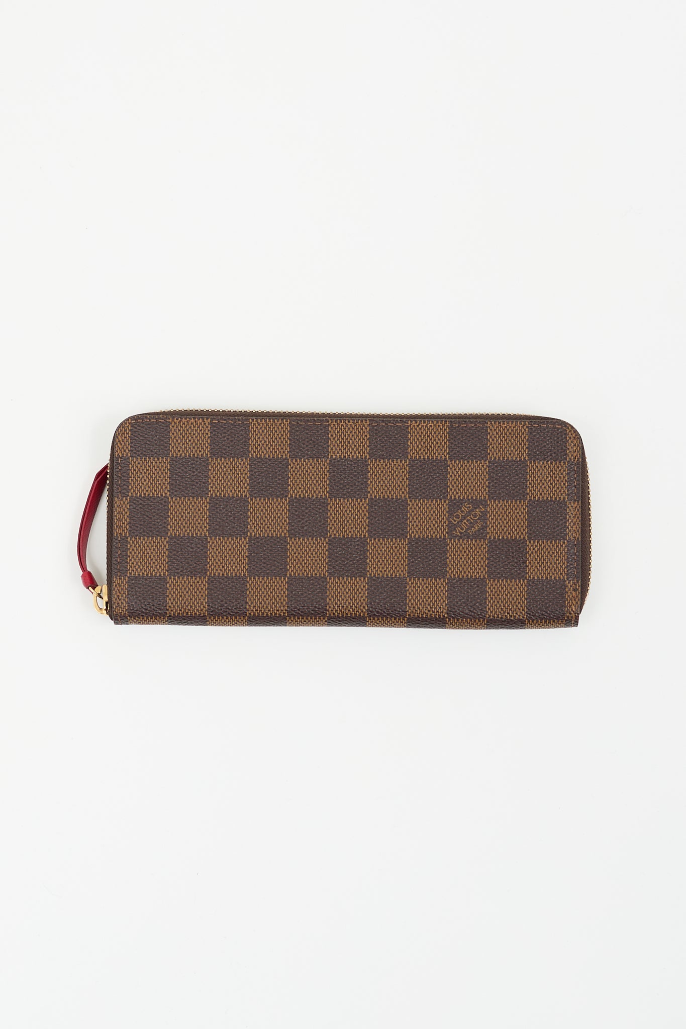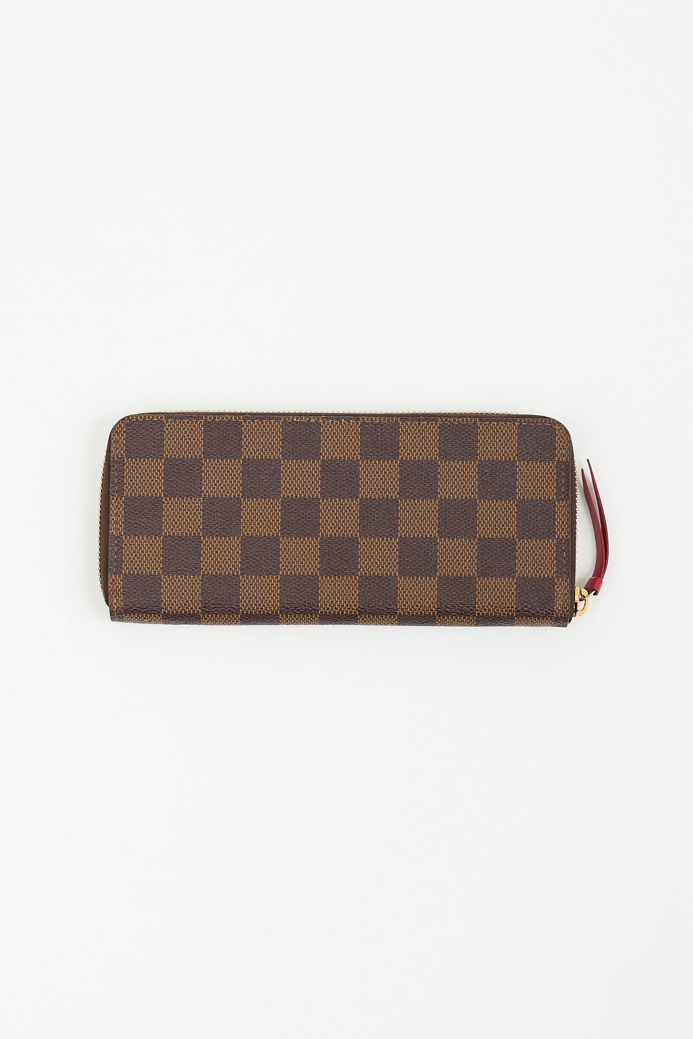 Pre-owned Louis Vuitton brown Clémence wallet featuring Damier Ebene coated canvas, zip around closure, two main compartments with two slip pockets, middle zip pocket, and eight card slots. Comes with original box and dust bag.
