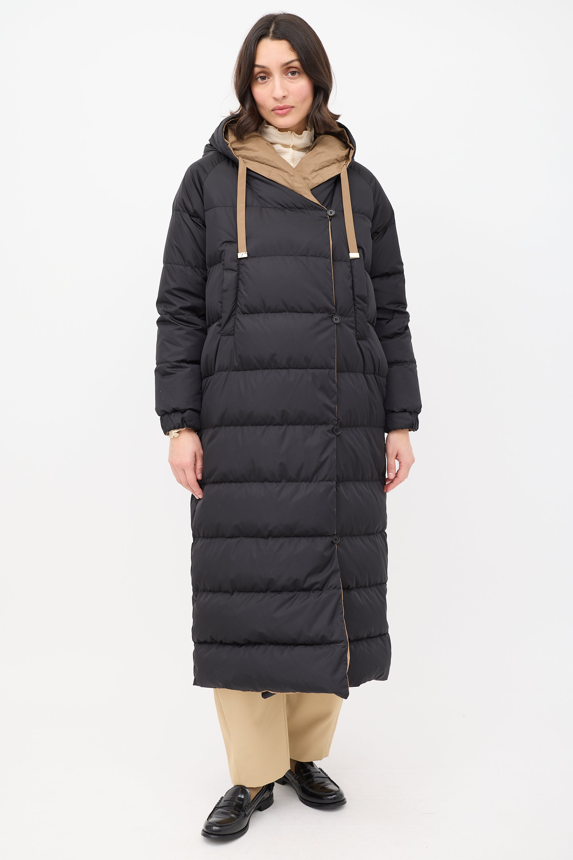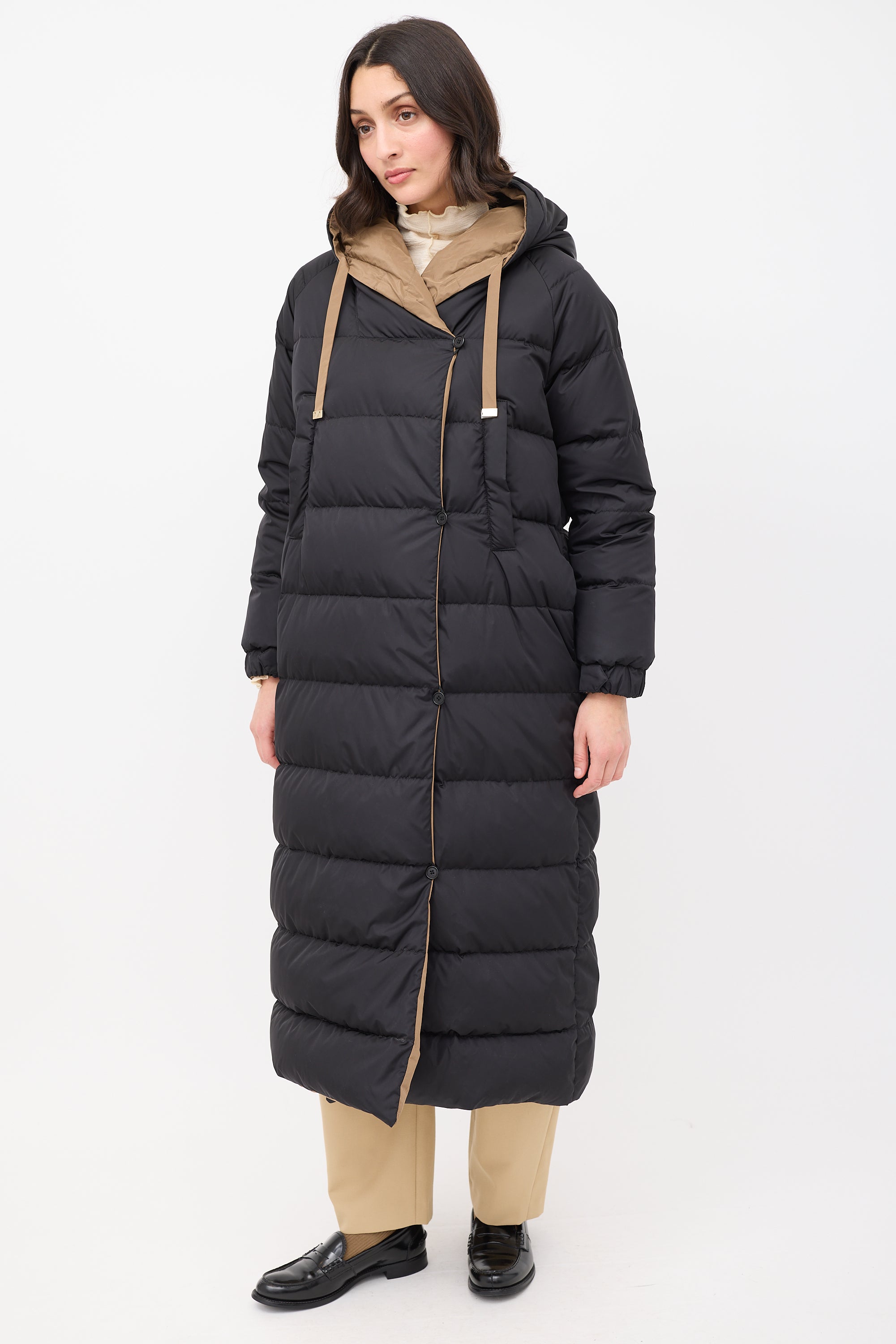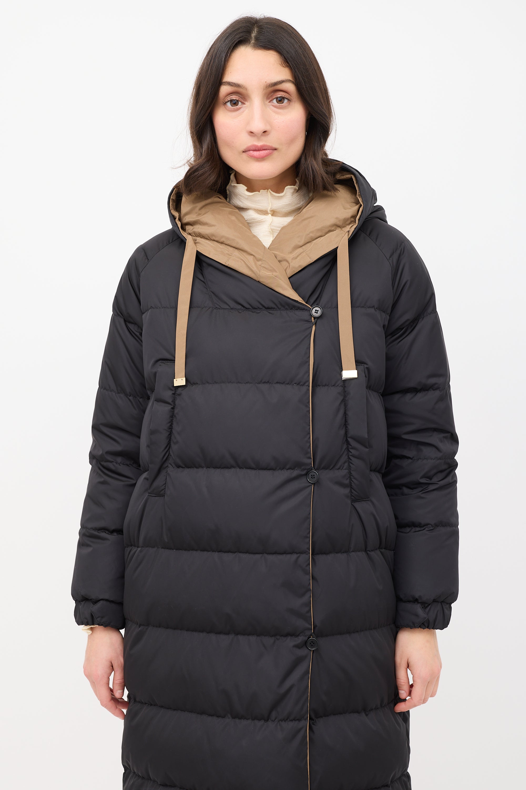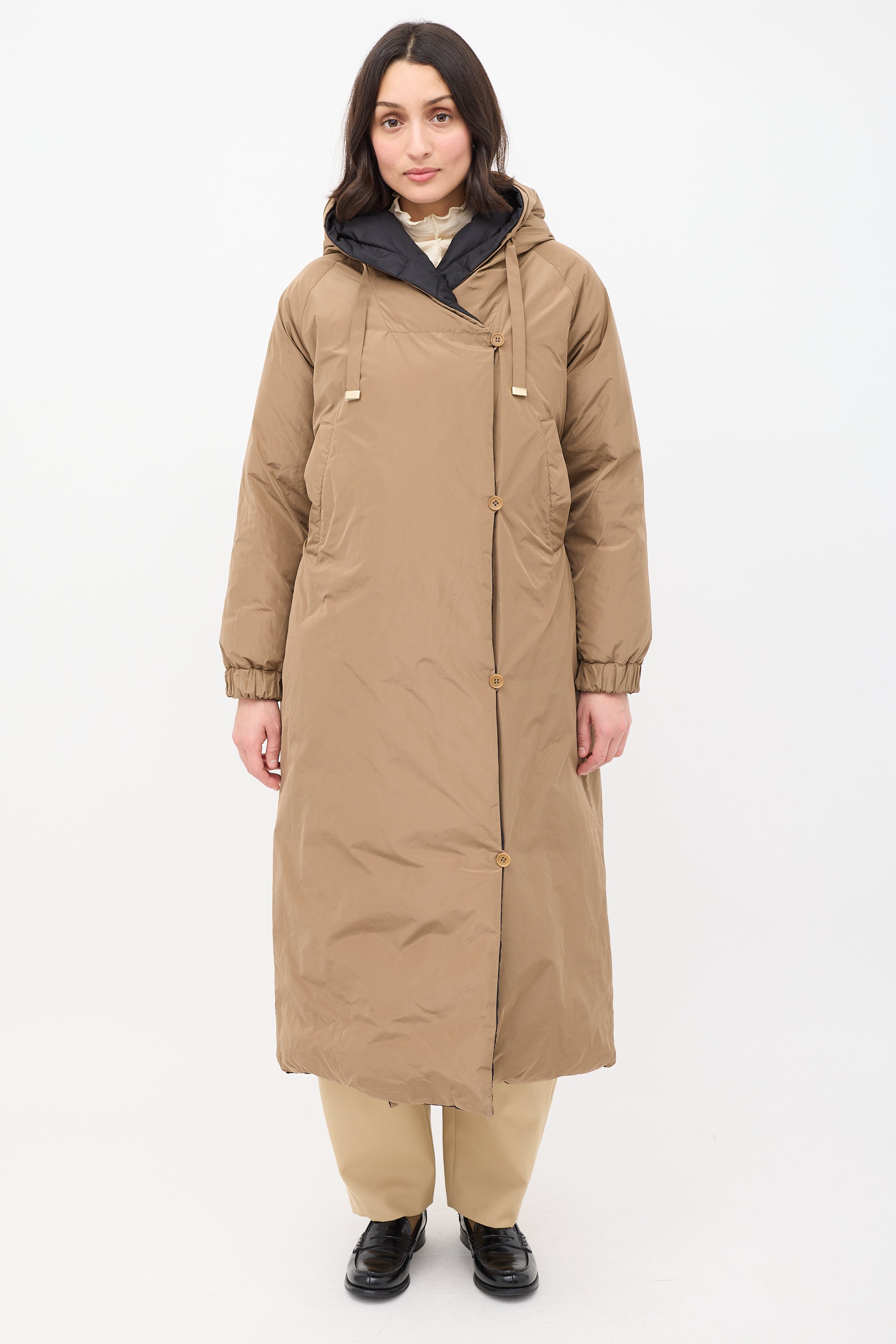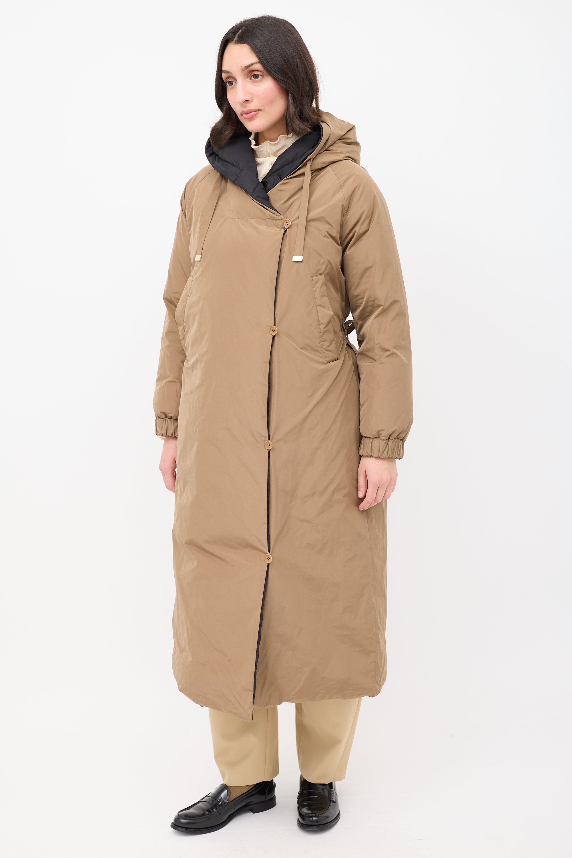 Pre-owned Max Mara reversible hooded long padded coat featuring brown side with drawstring with gold tone logo accents at hood, asymmetrical button up front closure, two hand warming pockets at chest, tie drawstring back waist, long sleeves with elasticized cuffs, and white logo tab at right cuff. Black reverse side features asymmetrical button up front closure, two hand warming pockets at chest, long sleeves with elasticized cuffs, reflective logo tab at right cuff, and quilting throughout.